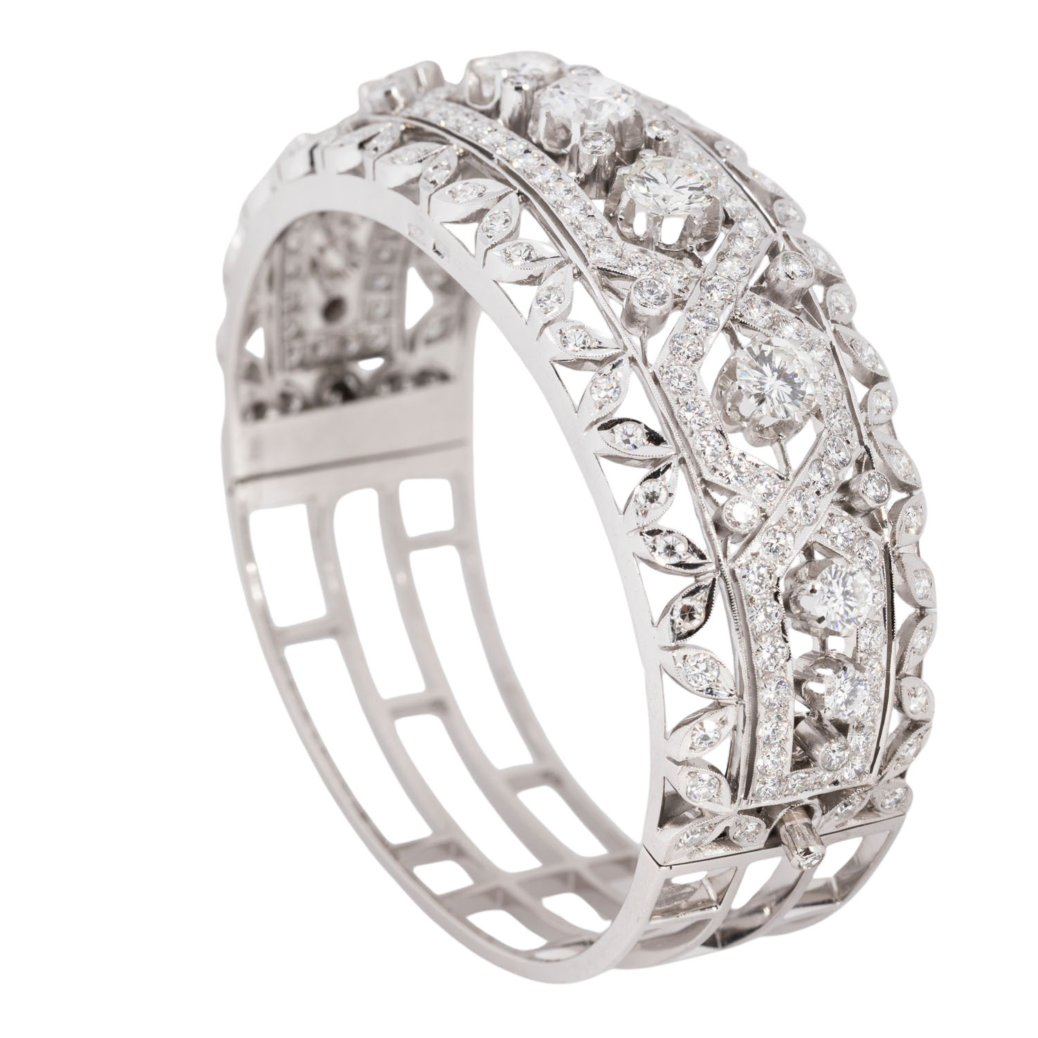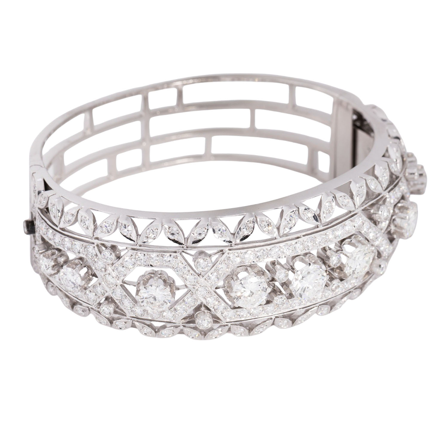 SOVIET UNION lush bracelet with brilliant-cut diamonds totalling ca. 12 ct of which central stone ca. 1.4 ct, all stones ca. WHITE-STW (H-I)/VS-SI, 18K WG, 67.9 g, inner circumference ca. 18.5 cm, around 1970s, minor signs of wear, Soviet hallmarks, date and maker's mark 'OБЮ', finenness mark 'Б * 750' (probably Baku), unique handcrafted piece, probably from the estate of some Official's wife.
