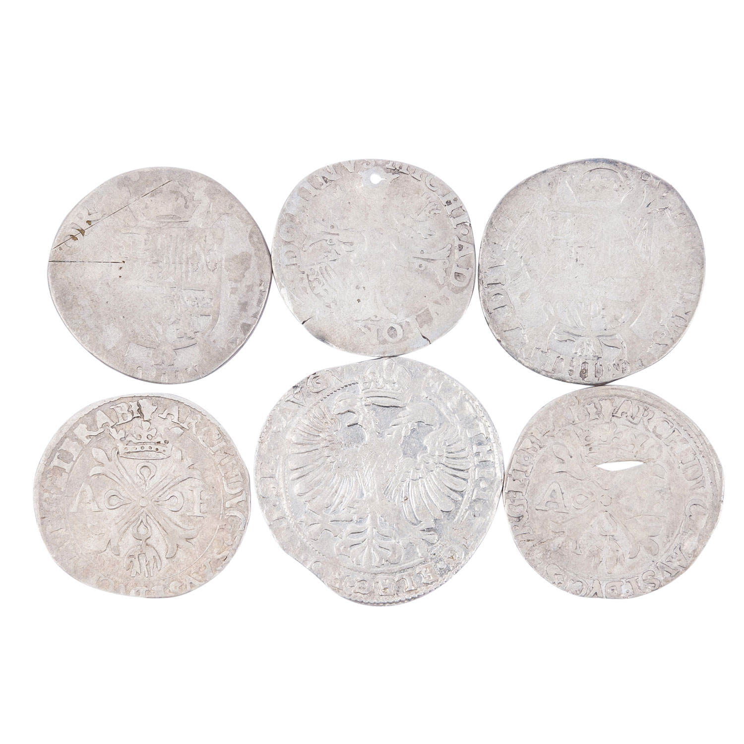 Spanish Netherlands - 6 x issues of the late 16th century, including: 1 x Netherlands/Kampen - Arendschelling Matthias II. n. d., 4.8 g rough; 2 x Span. Netherlands - Real Albert and Isabella (1598-1621) n.d., Brabant Antwerp, 1 x center with oblong hole, each approx. 2.9 g rough; 2 x Spanish Netherlands - 1/5 Philippstaler Philipp II. 1566 and 1592 (?, imprecise), 1 x 5 g rough, 1 x 5.4 g rough; 1 x Spanish Netherlands - 1/10 Philippstaler Philipp II. 1563 (?, imprecise), perforated, strong abrasion, 2.7 g rough. Condition V-VF, cleaning, straightening and polishing not excluded.