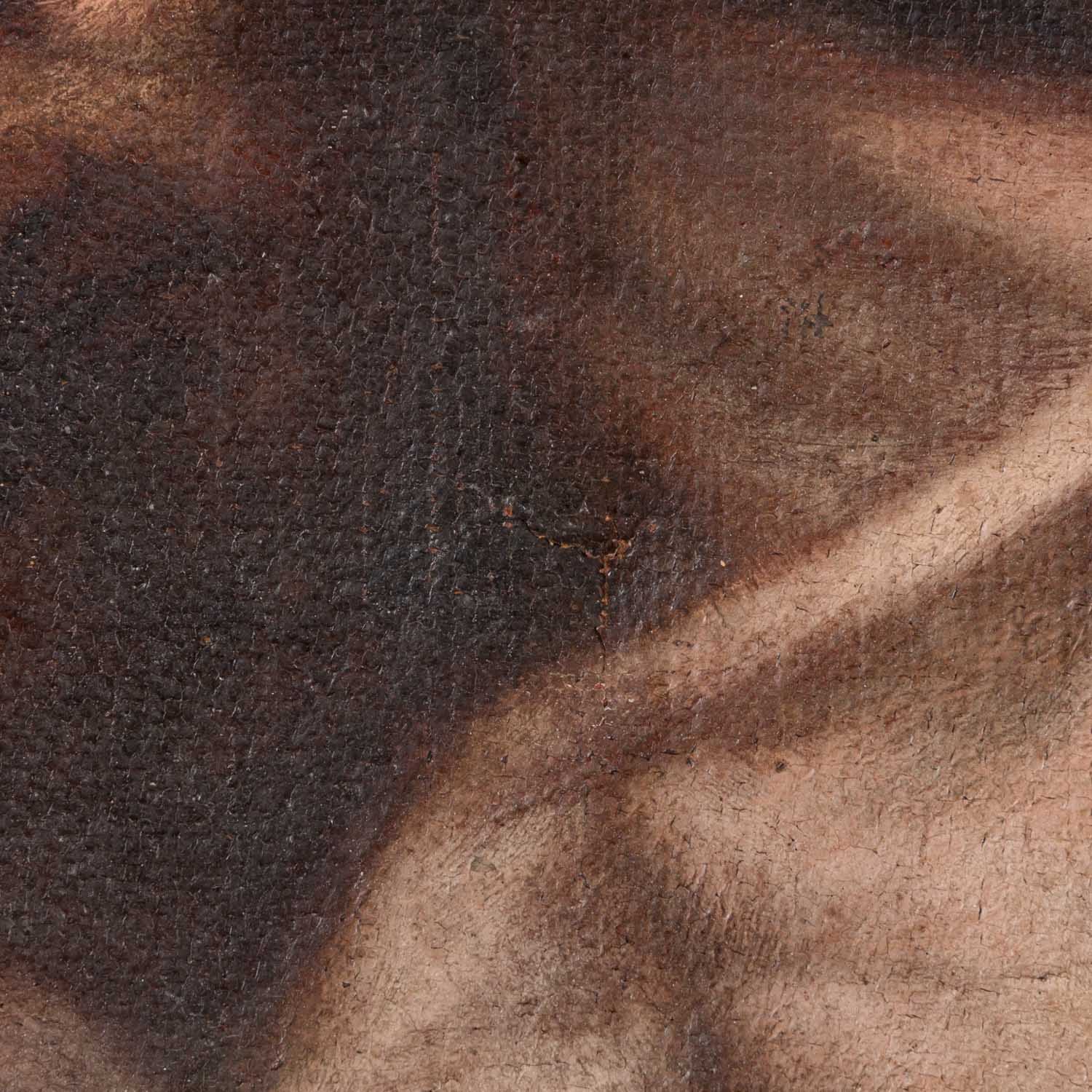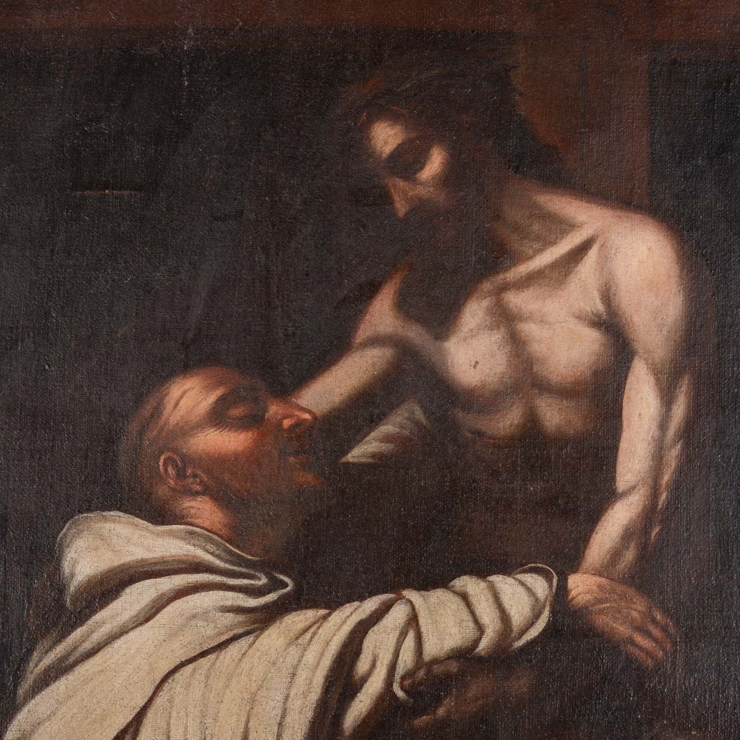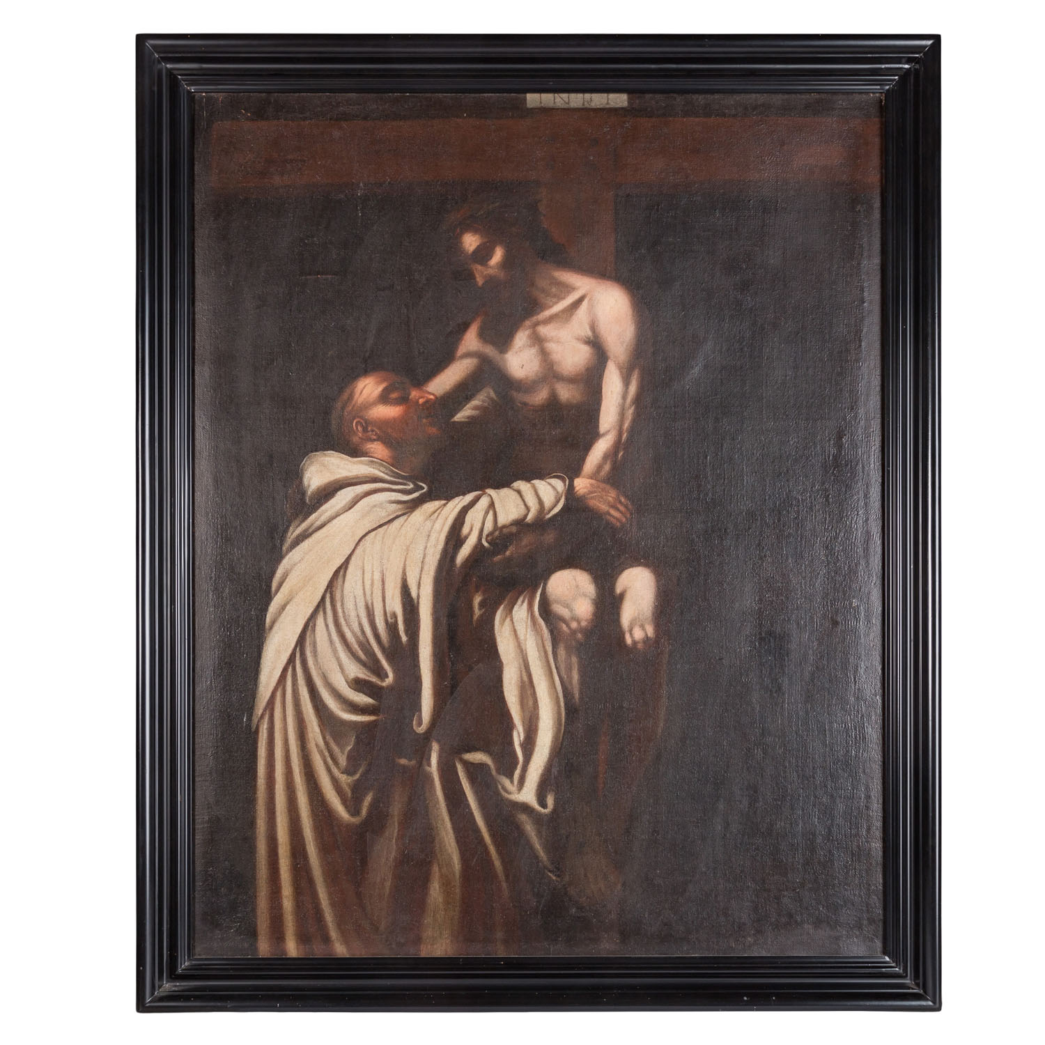 SPANISH SCHOOL OF THE 17th/18th CENTURY, ‘Christus umarmt den Heiligen Bernhard’, copy after Francisco Ribalta, oil/canvas, relined, HxW: approx. 113x91 cm (126.5x104.5 cm with frame). Signs of age and rubbing, craquelure, slightly damaged. With frame (signs of age and wear).