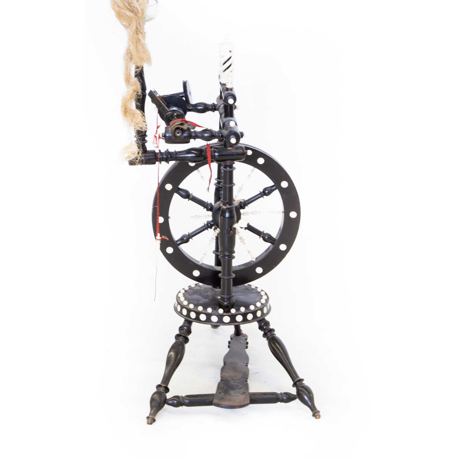 SPINNING WHEEL Circa 1900, ebonized, turned wood with turned leg ornaments, complete with a swivel base, h: approx. 190 cm. Signs of age, some of the leg decorations damaged.