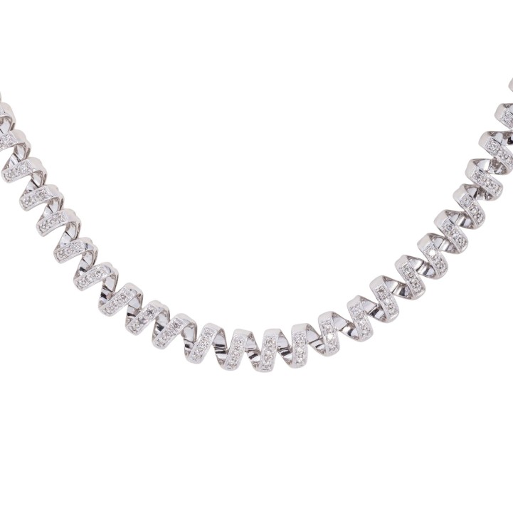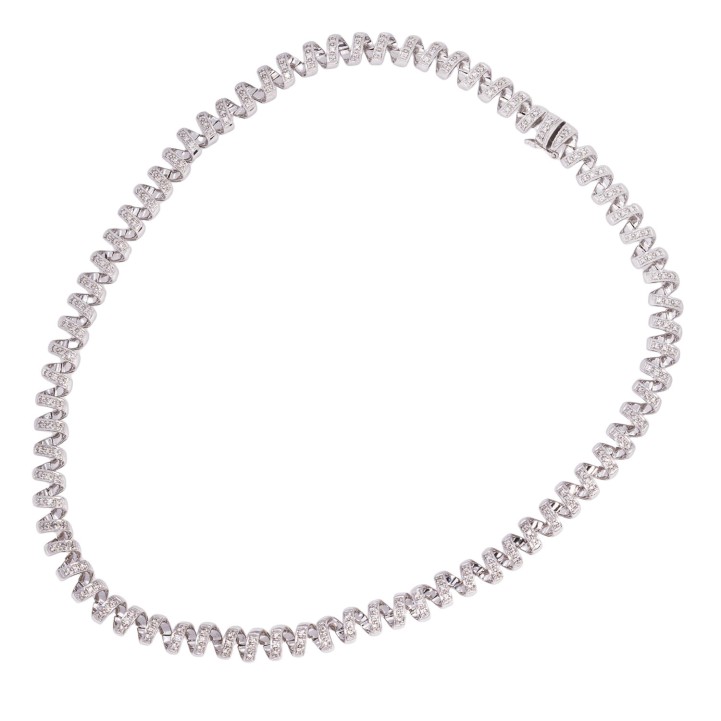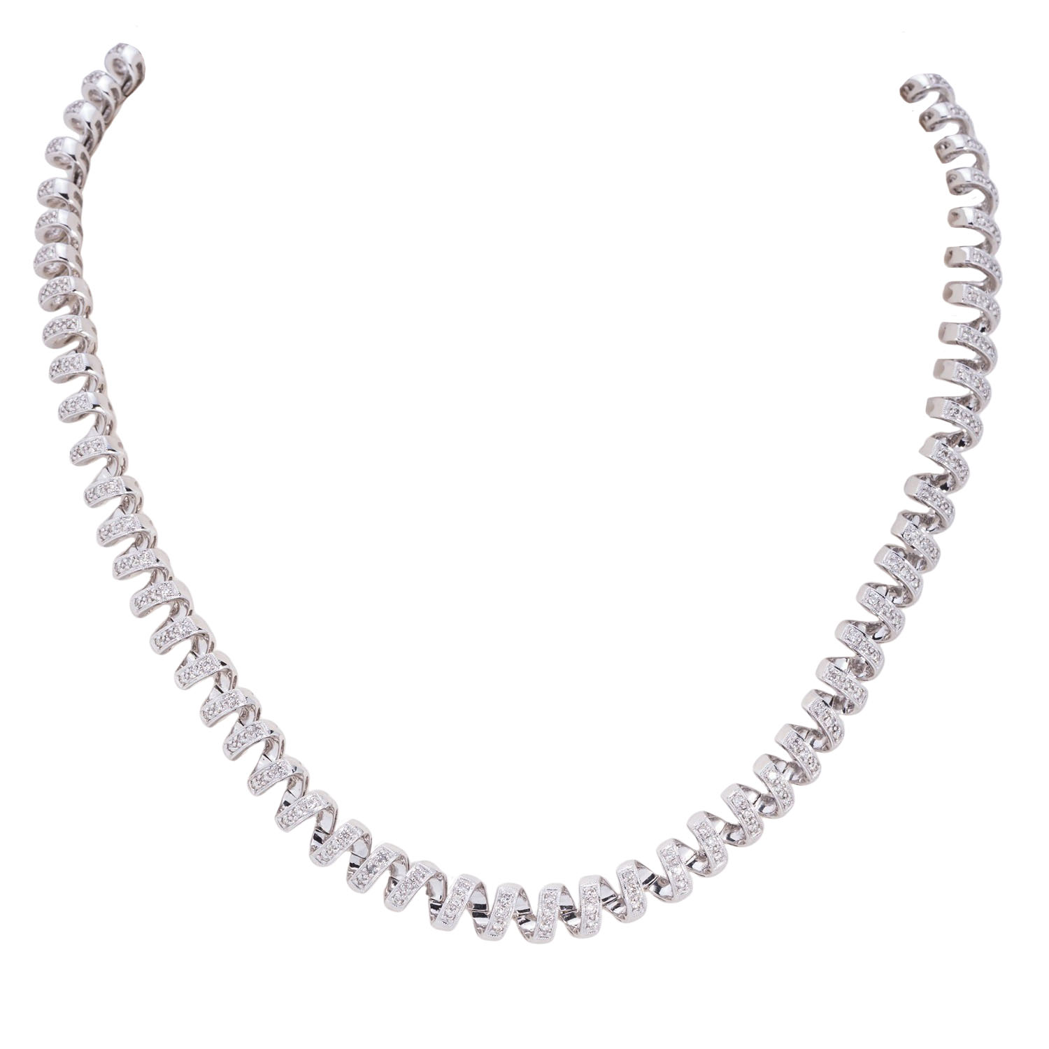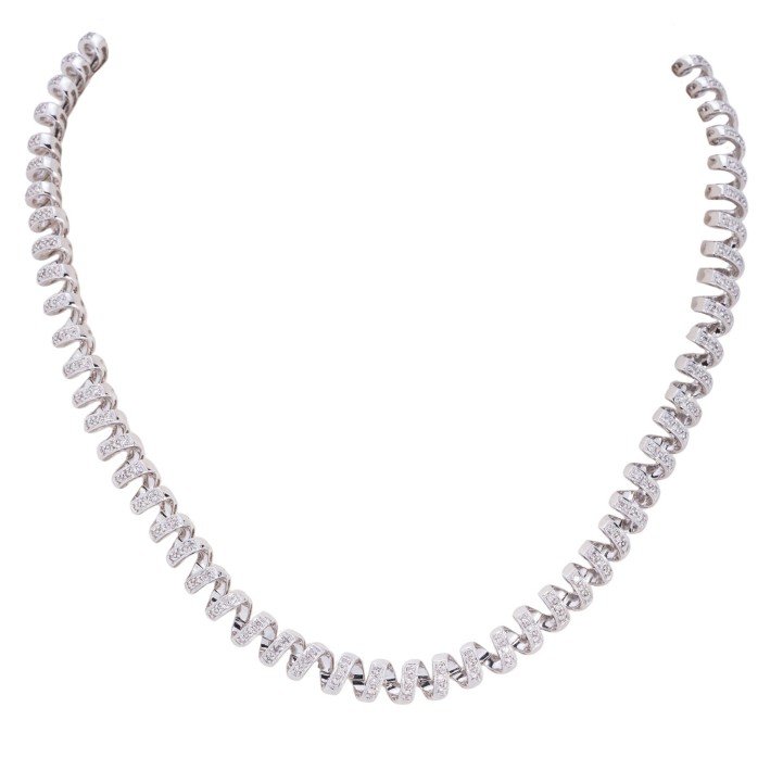Spiral effect necklace with brilliant-cut diamonds totalling 2.14 ct (marked), good color a. clarity, 18K WG, 49 g, L: ca. 40 cm, 21st century, minor signs of wear.