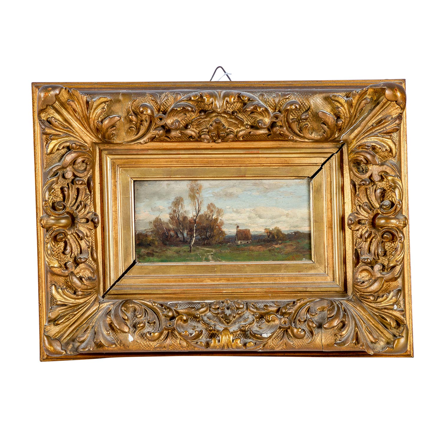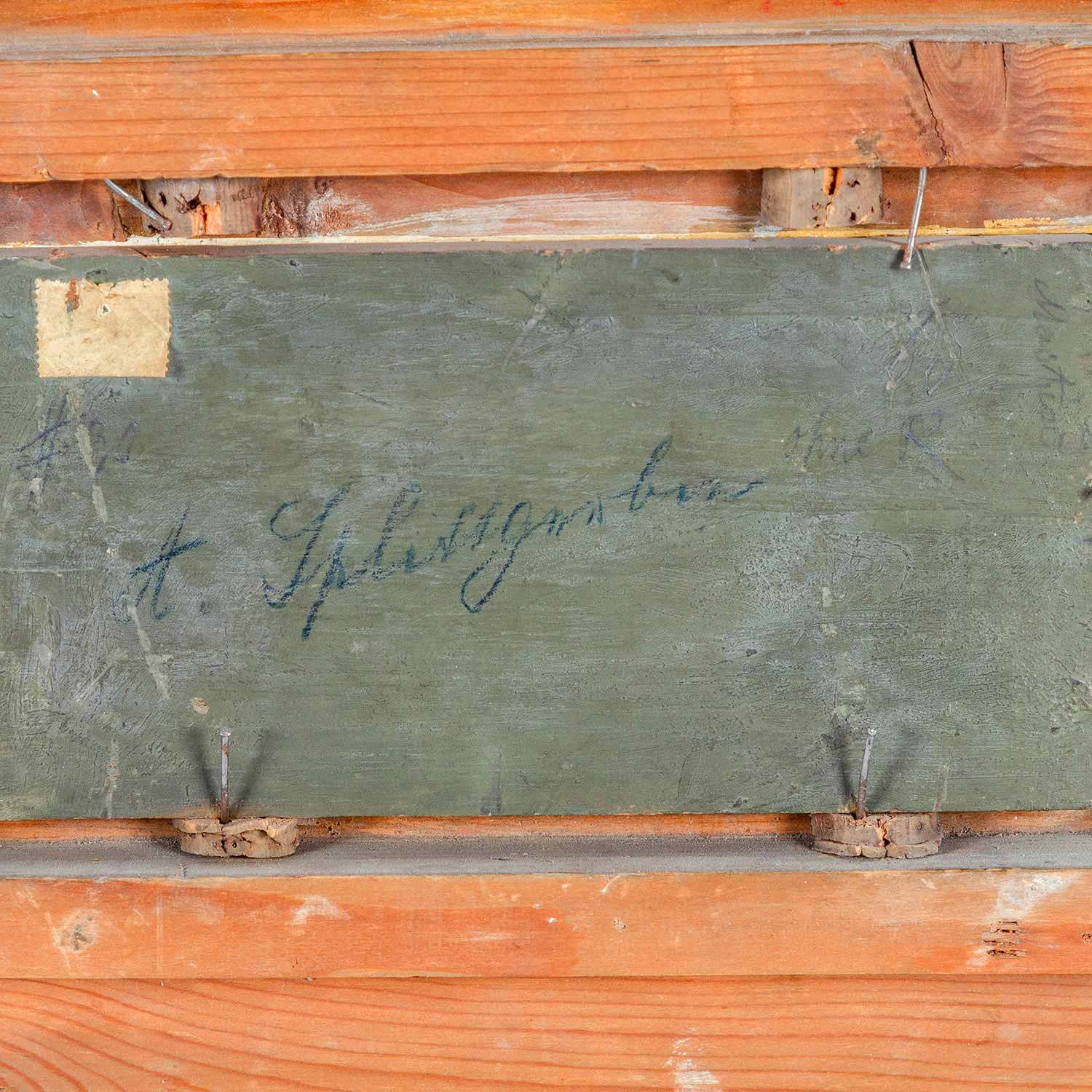 SPLITGERBER, AUGUST, ATTR. (Steingarden 1844-1918 Munich), 'Small landscape with birch trees and chapel', oil / wood, inscribed 'A. Splitgerber ', HxW: 9x19 cm. Framed (part. damaged). Slight signs of age, minimal. craquelured.