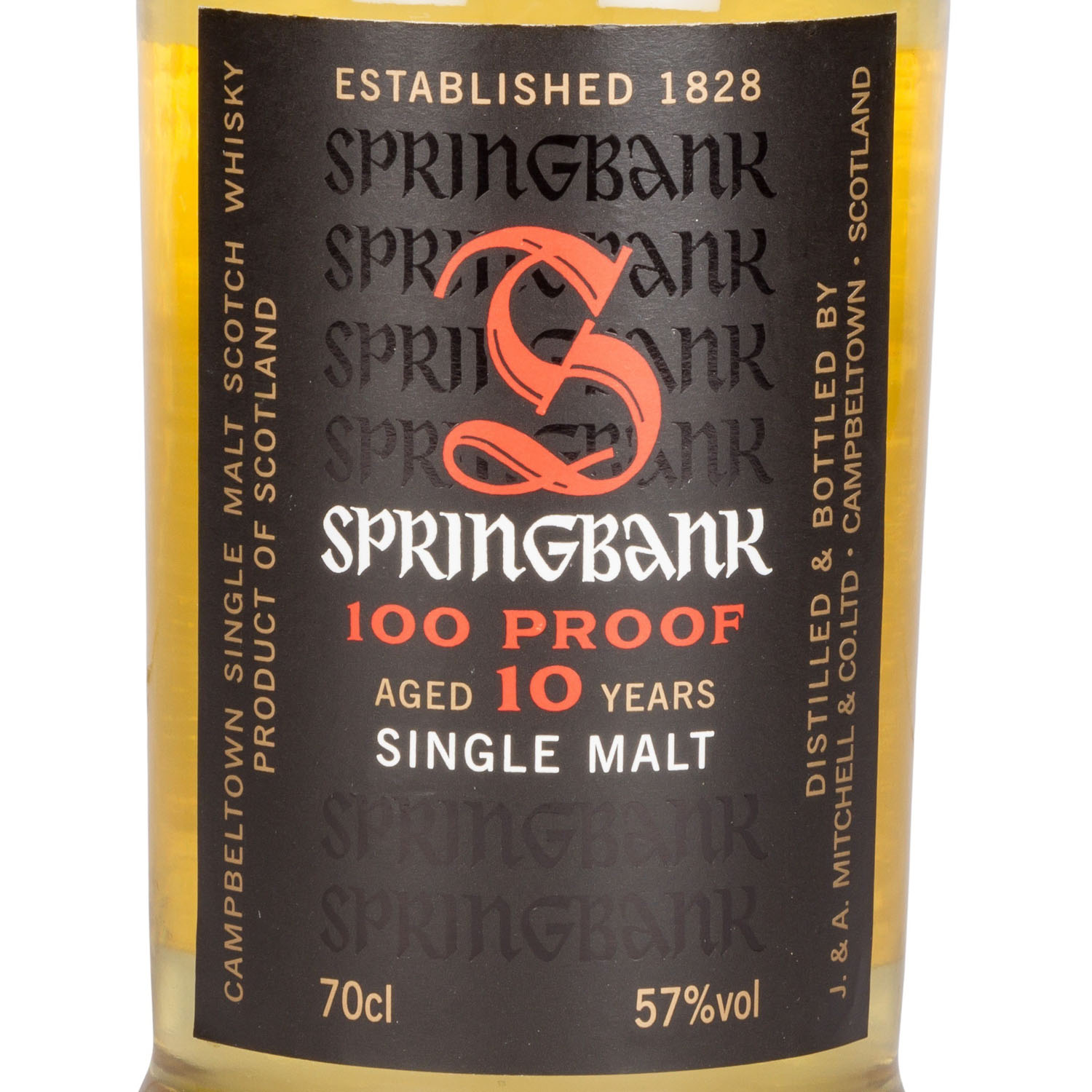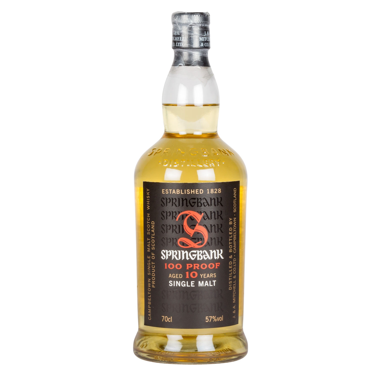SPRINGBANK Campbeltown Single Malt Scotch Whisky '10 Years', ‘100 Proof’, bottled 2010, Campbeltown, Scotland, 57% Vol., 700 ml, fill level in the bottle neck, in original packaging (partly creased and dam.).