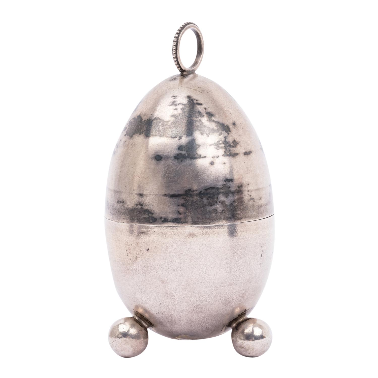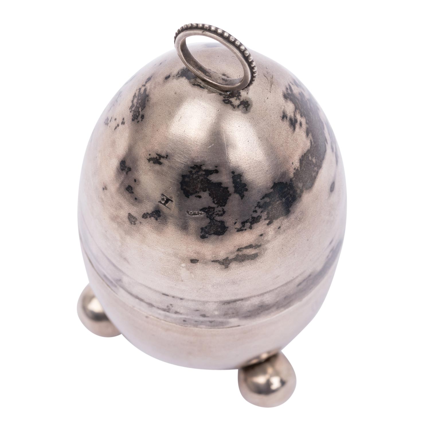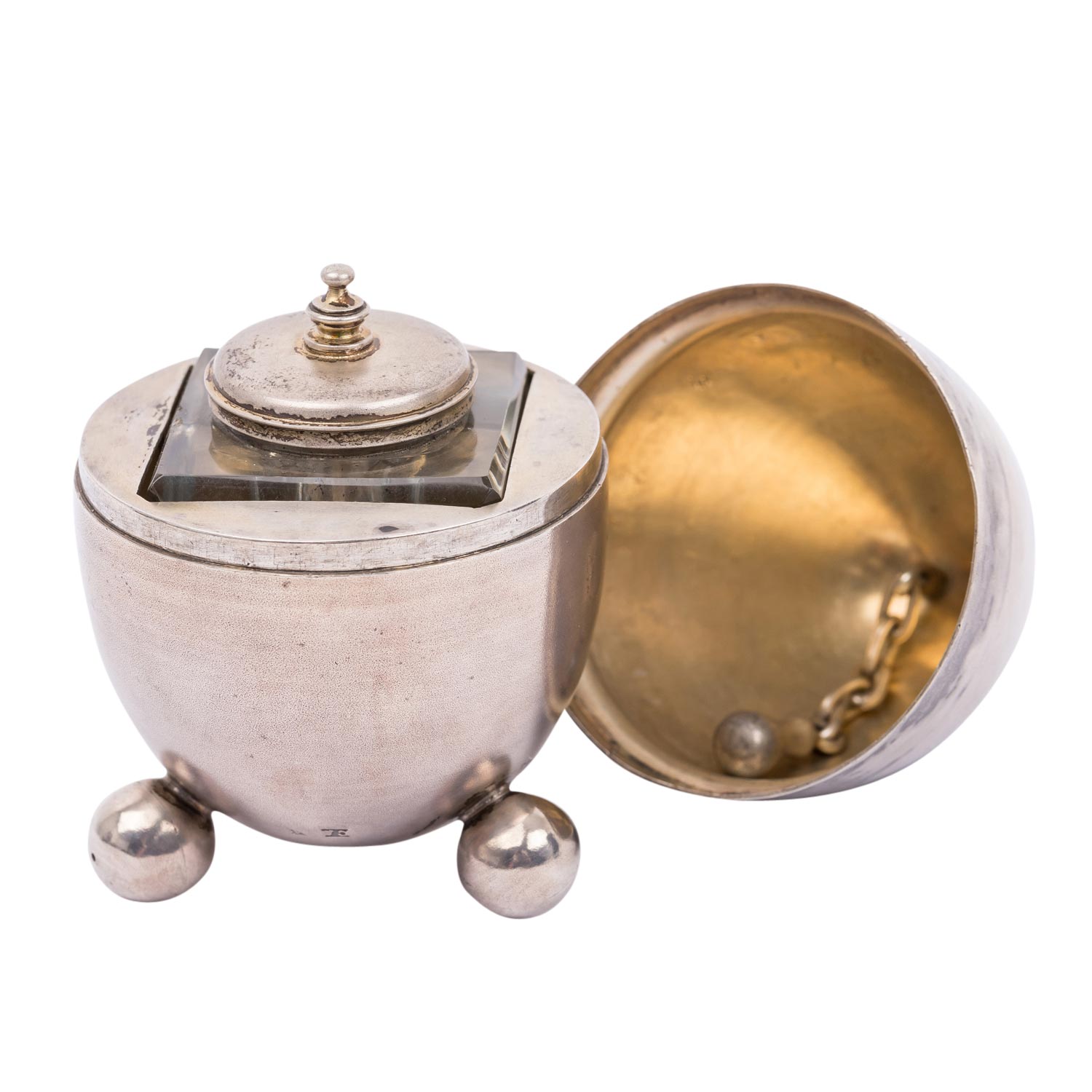 ST. PETERSBURG Inkstand in egg shape, 84 zolotniki, 1882-1899. The egg can be opened: in the lower part standing on 3 ball feet is a glass insert (damaged at the opening) with a silver lid, the upper part of the egg has a ring-shaped handle and can be used as a bell, hallmark for St. Petersburg with fineness 84 as well as an 'E' (probably French import hallmark), h. approx. 11 cm, weight approx. 117 g. Slightly dented, signs of age and use.