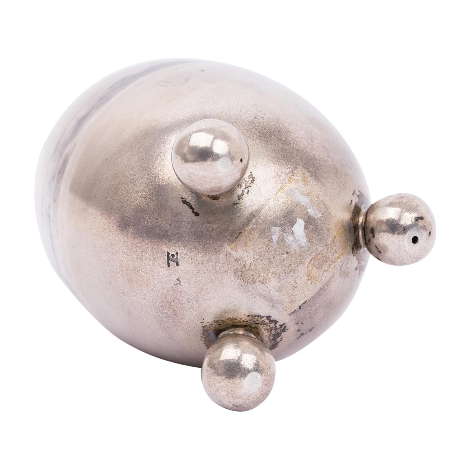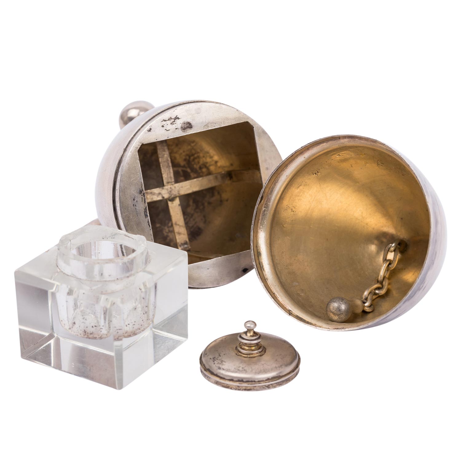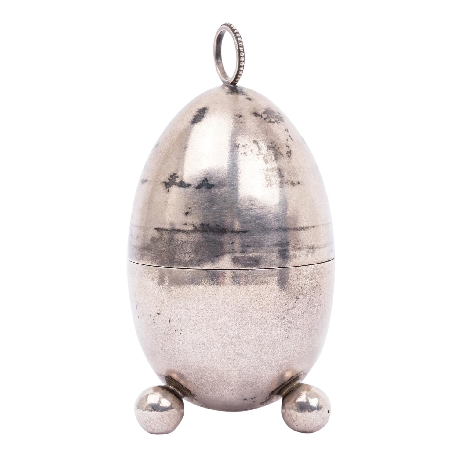 ST. PETERSBURG Inkstand in egg shape, 84 zolotniki, 1882-1899. The egg can be opened: in the lower part standing on 3 ball feet is a glass insert (damaged at the opening) with a silver lid, the upper part of the egg has a ring-shaped handle and can be used as a bell, hallmark for St. Petersburg with fineness 84 as well as an 'E' (probably French import hallmark), h. approx. 11 cm, weight approx. 117 g. Slightly dented, signs of age and use.