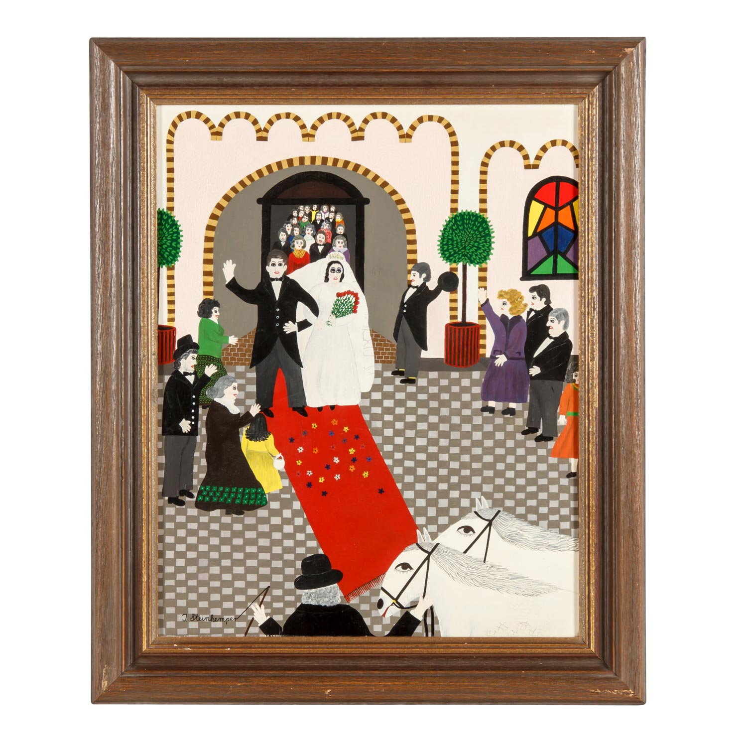 STEINKEMPER, INGRID (born 1943), 'White Wedding', signed lower left: 'I. Steinkemper', oil on canvas, HxW: approx. 50 x 40 cm (HxW frame: approx. 61 x 50.5 cm). Inscribed and titled on the reverse: 'White Wedding / Ingrid Steinkemper'. Signs of age and rubbing, with frame (slight damage).