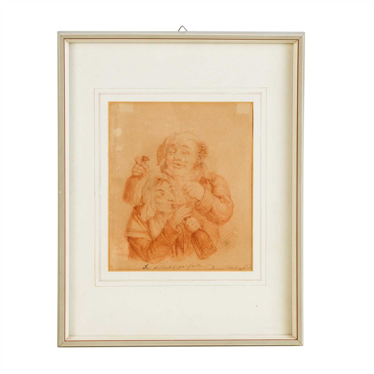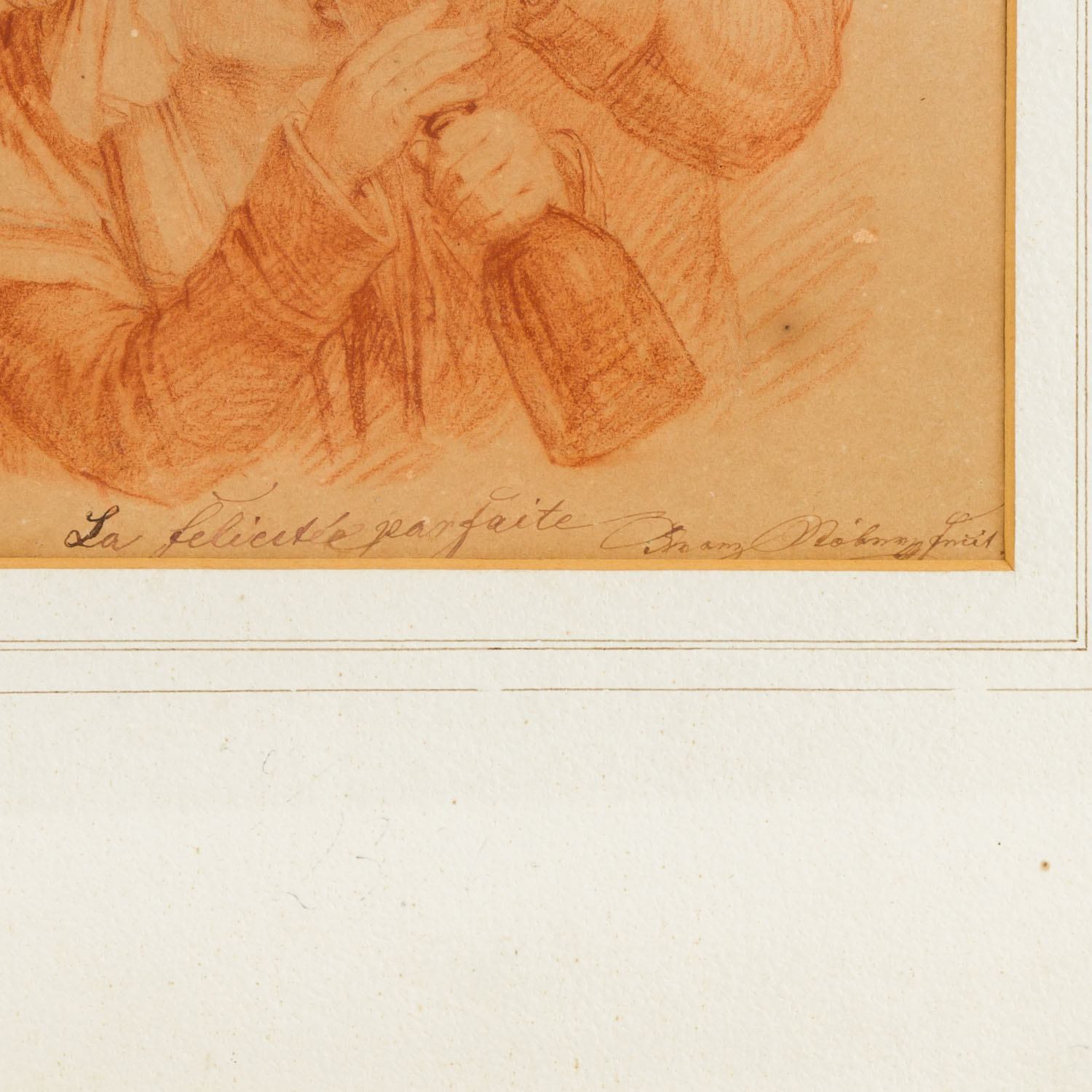 STÖBER, FRANZ XAVER (1795-1858), 'La felicitée parfaite', drinking couple, titled and signed, red chalk drawing/paper, HxW: Passepartout cutout approx. 20x17 cm, external dimensions frame approx. 37x29 cm. Browned, stained, crease marks. Framed behind glass in a passepartout. Signs of age.