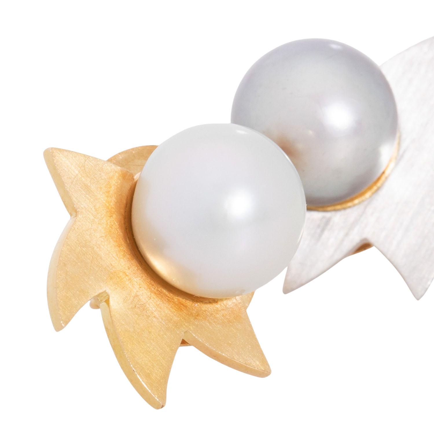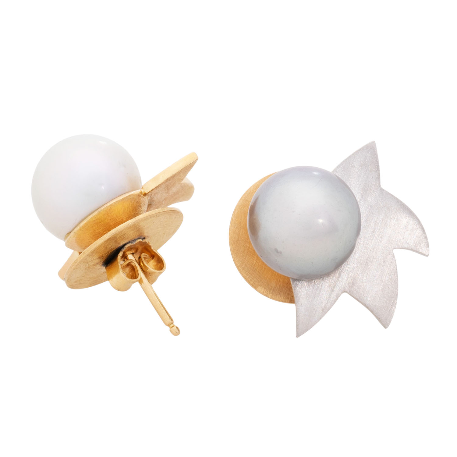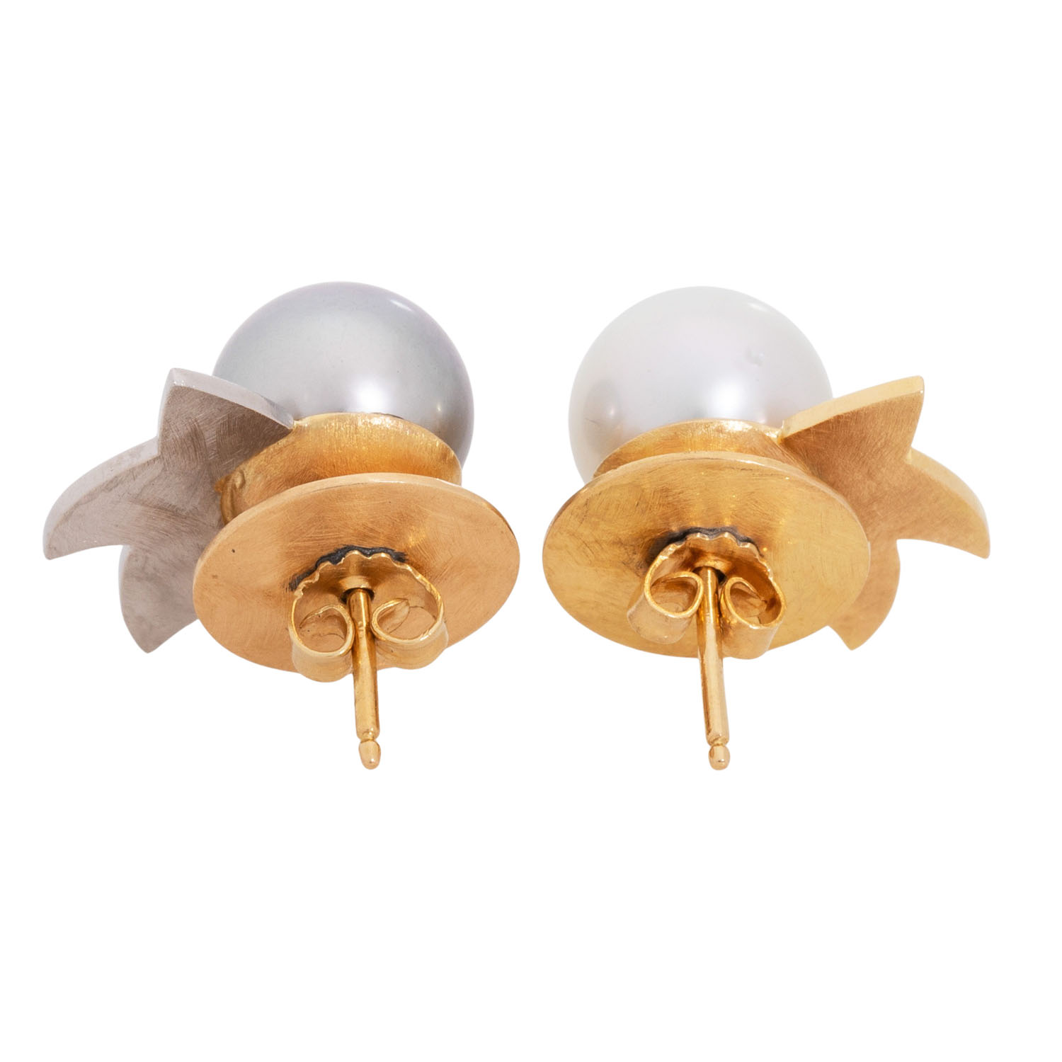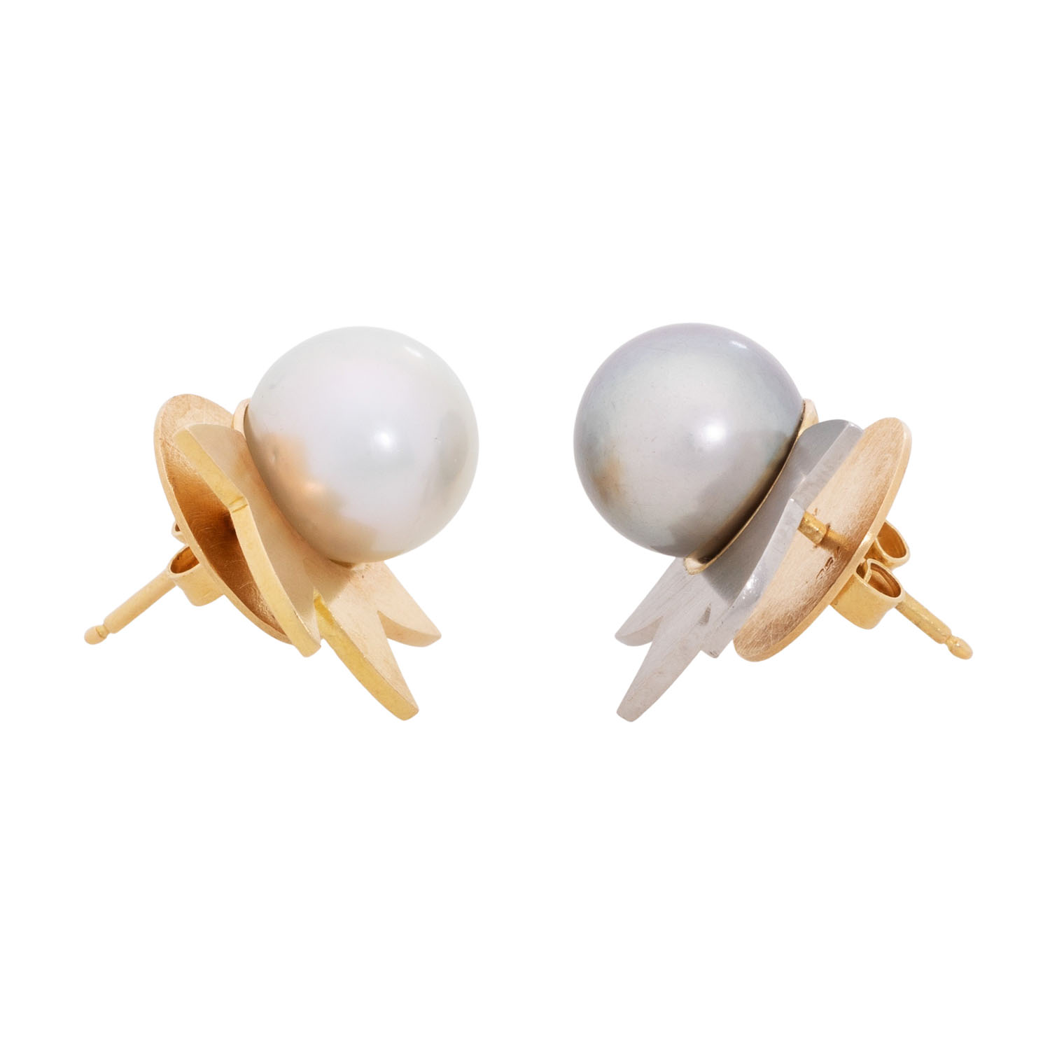 Pair of earstuds with 2 South Seas pearls, white and grey, D: 10.7 mm, good lustre, 18K yellow and white gold, 10.9 g, L x W: 1,8 x 1,9 cm, 20th/21st century, minimal signs of wear, handcrafted work.