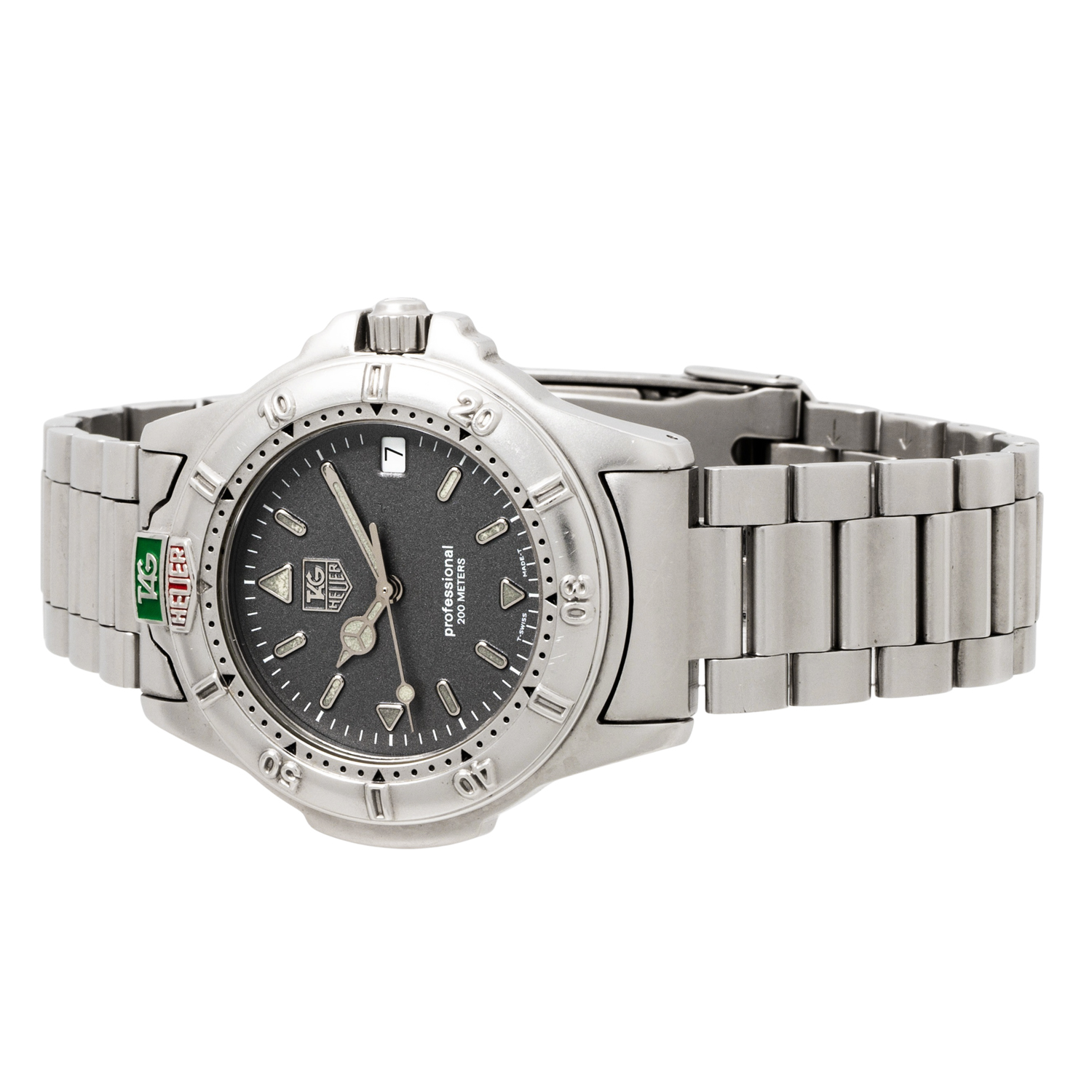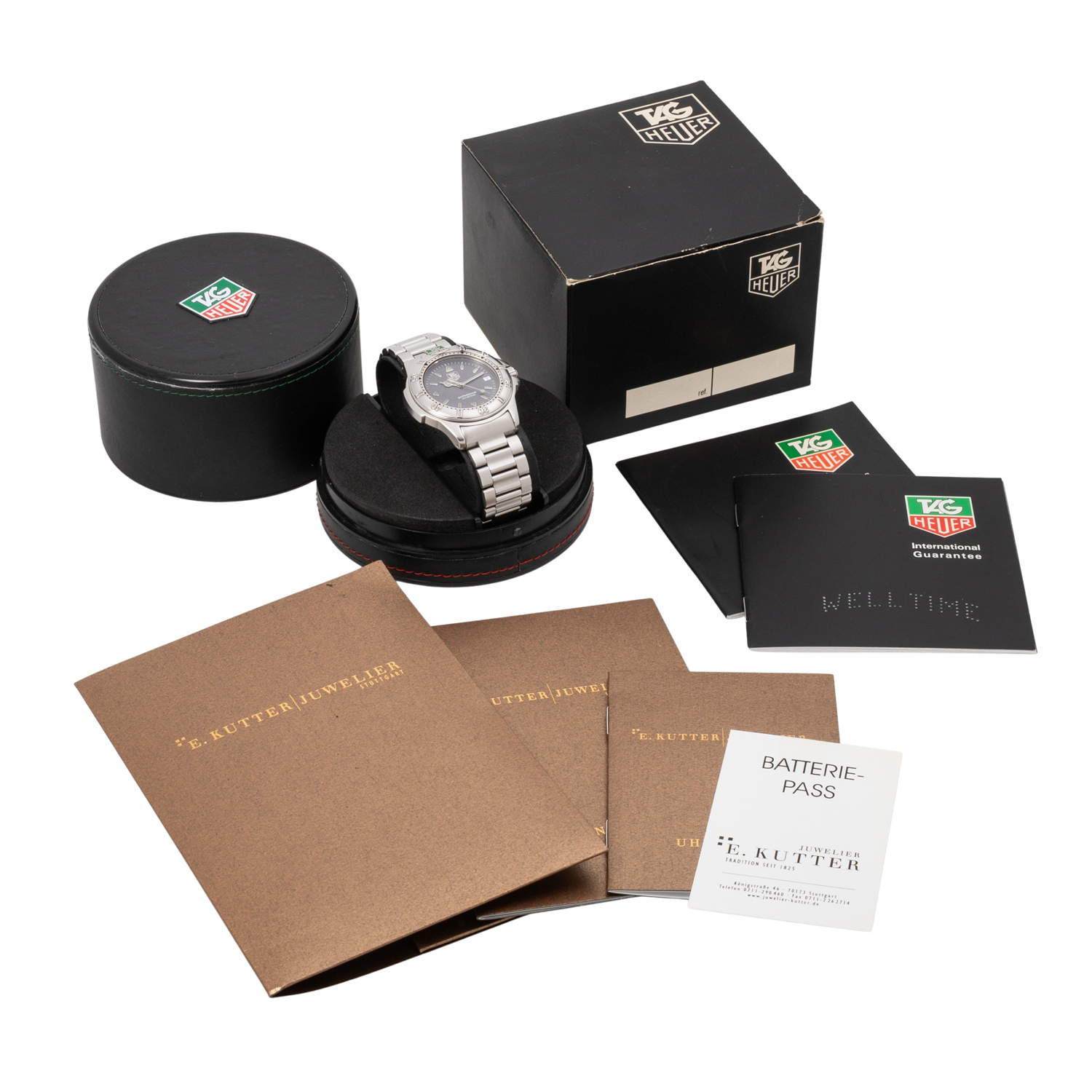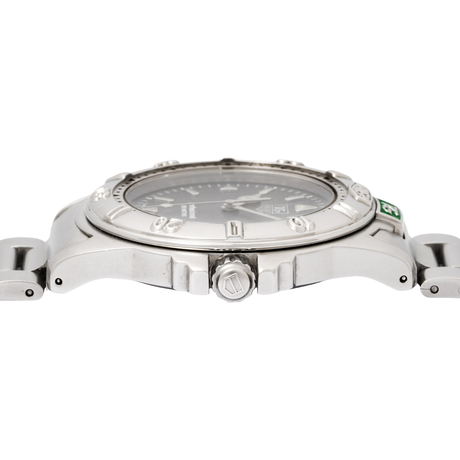 TAG HEUER 4000 Professional Ref WF1111-0 men's watch. Box and papers. Stainless steel. Quartz movement in working condition. Gray tritium dial with applied indices and date display. Tag Heuer steel bracelet (slight stretch) with folding clasp. Good condition with signs of wear. Original box, manual, watch passport with revision certificate from 2014, service booklet, warranty booklet and warranty certificate enclosed. Purchased in December 1994 from Sincere watch duty free PTE Ltd. at Singapore Airport. Diameter approx. 38 mm (measured without crown). Fits up to approx. 20 cm wrist size.