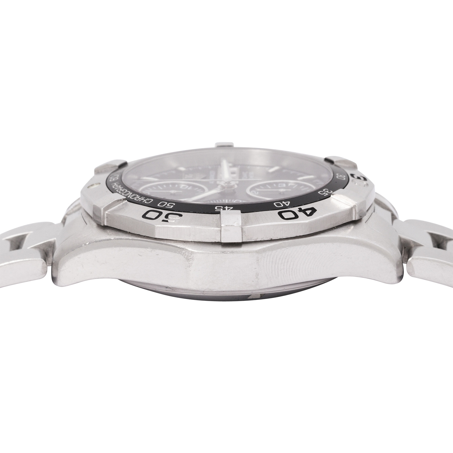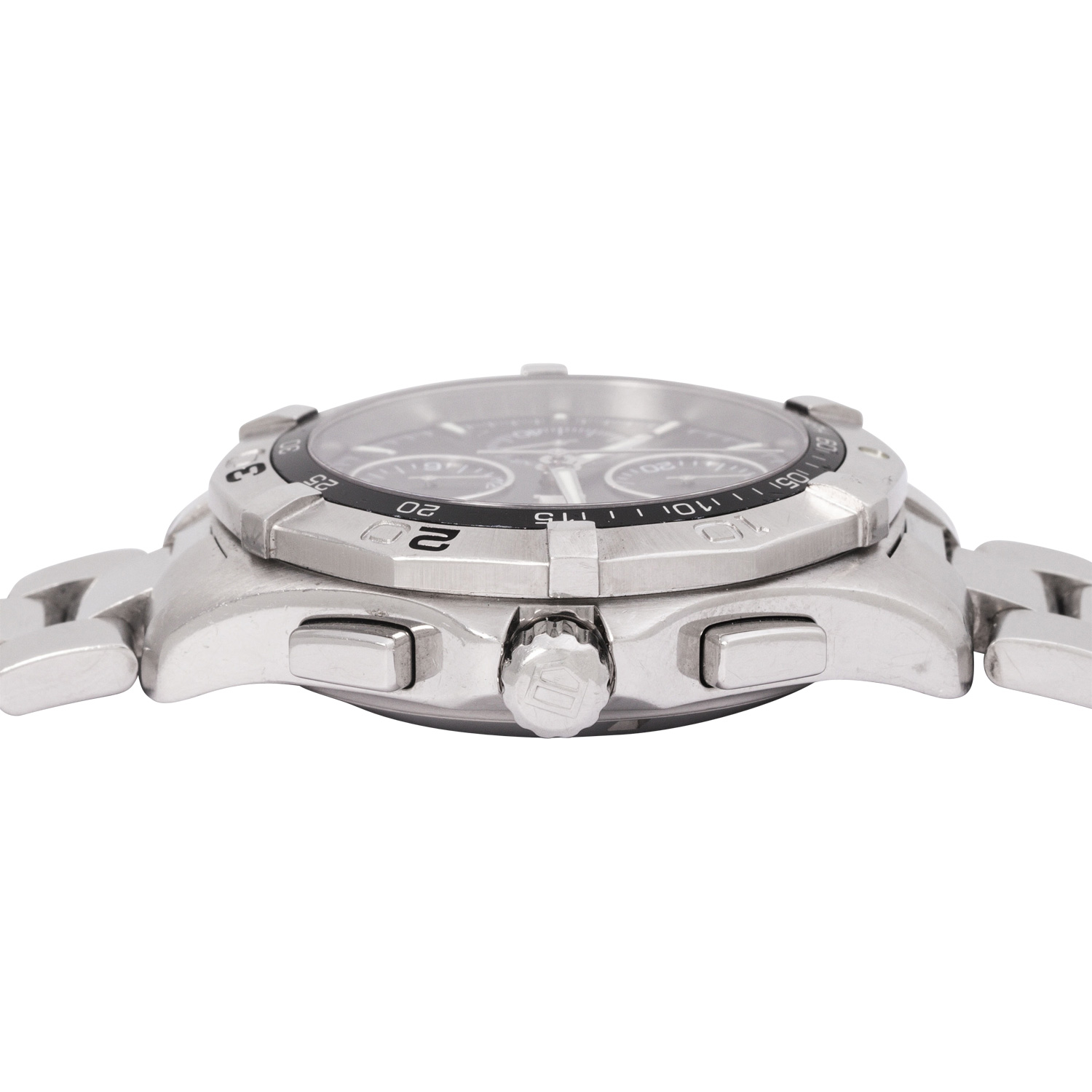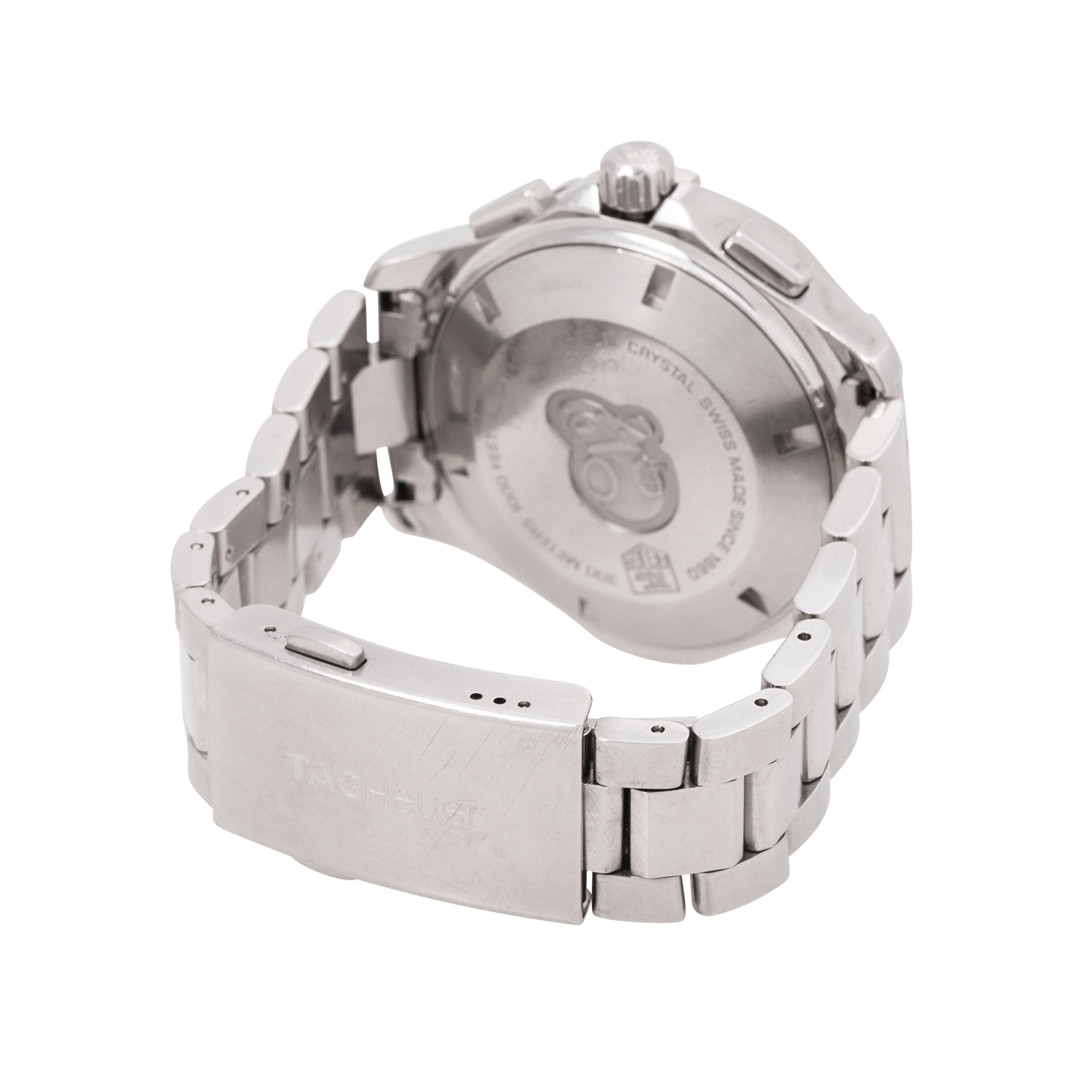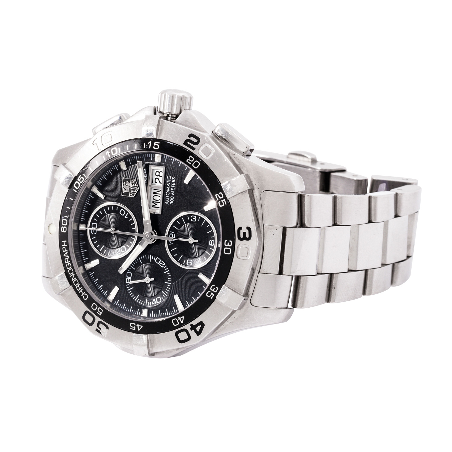 TAG HEUER Aquaracer 300 M Chronograph ref. CAF2010. Stainless steel. Crown cannot be screwed on. Automatic movement in working condition. Black dial with baton indices, day of the week and date display. Steel strap with folding clasp. Used condition, visible signs of wear on the strap and case. Diameter approx. 43 mm without crown. Fits up to approx. 18 cm wrist circumference.