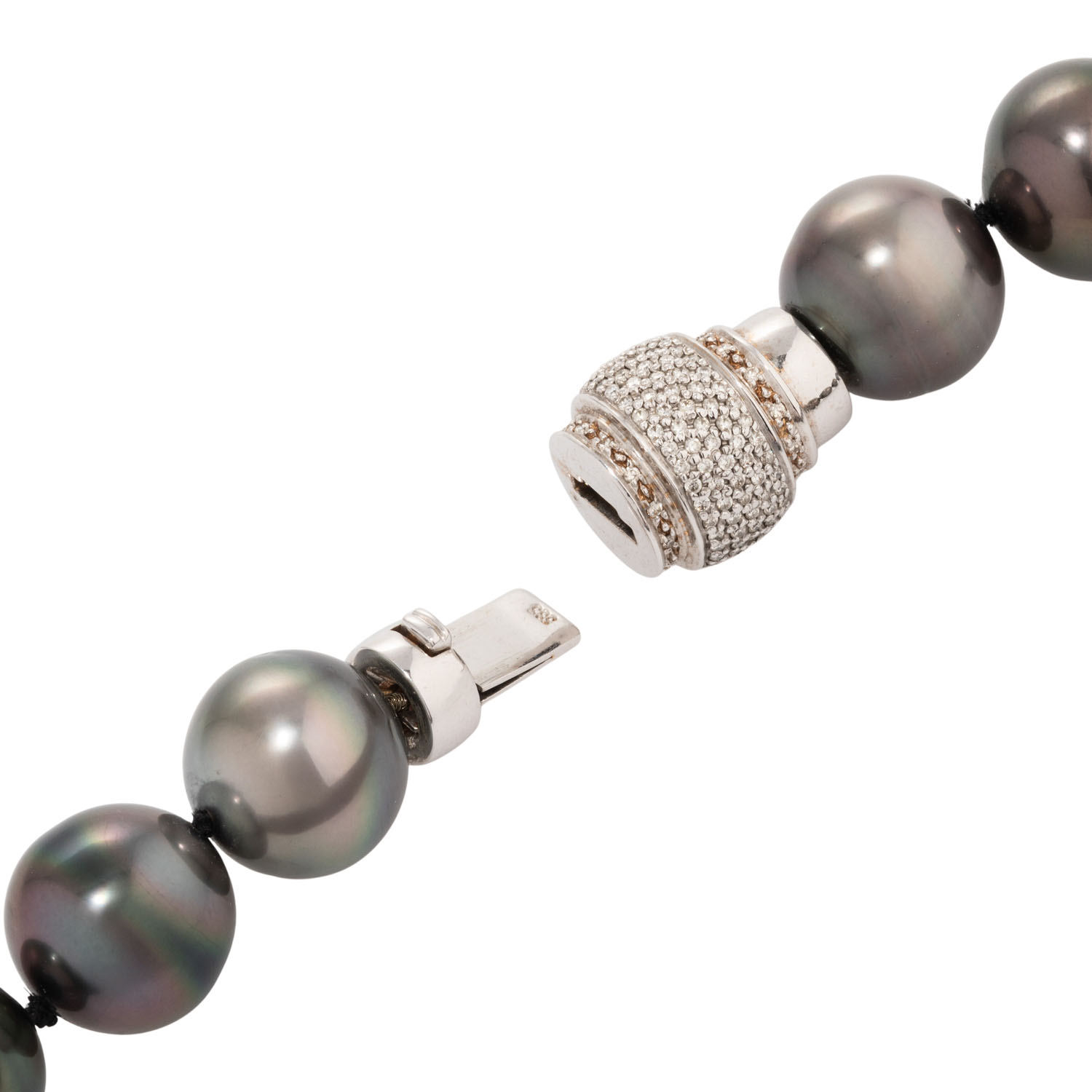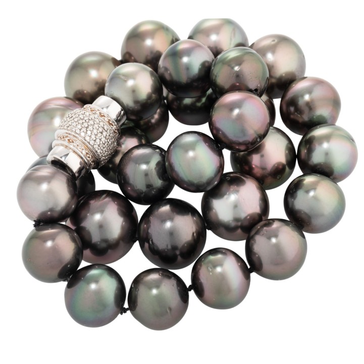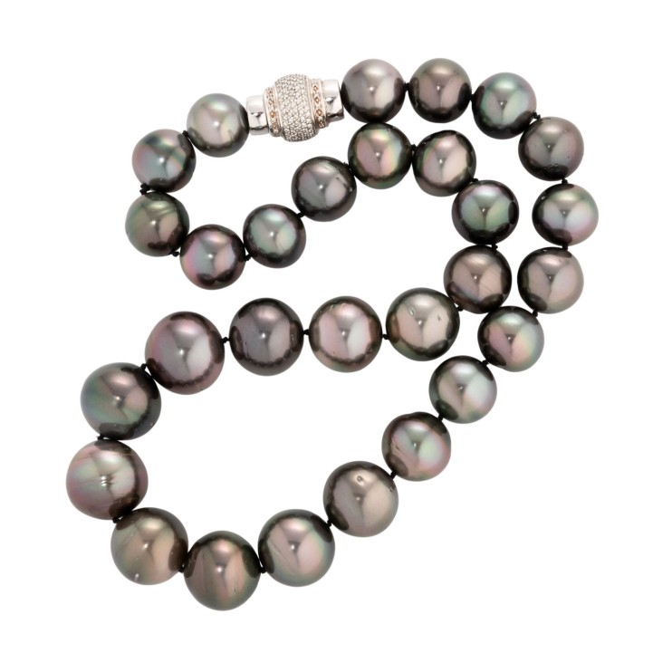 Necklace of Tahitian cultured pearls graduating from 14 to 17.5 mm, round to bouton-shape, partly distinct preacock-colour, clasp of 14K gold with brilliant-cut diamonds totalling ca. 0.75 ct, good colour and clarity, L: 47 cm, 20th/21st century, minor signs of wear.