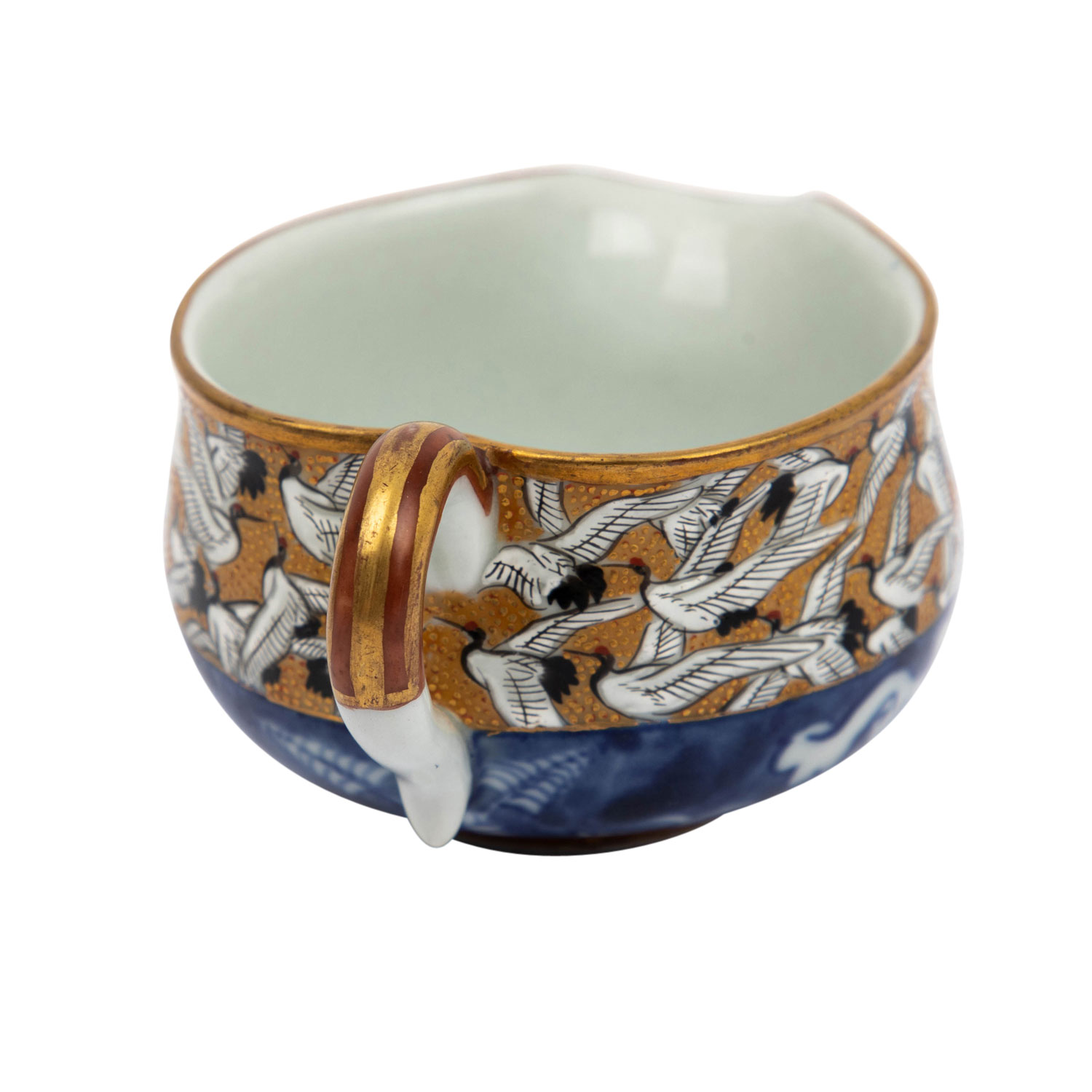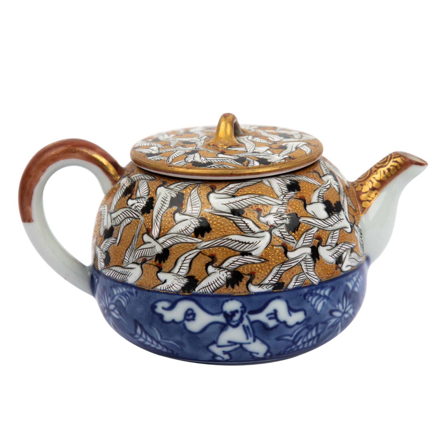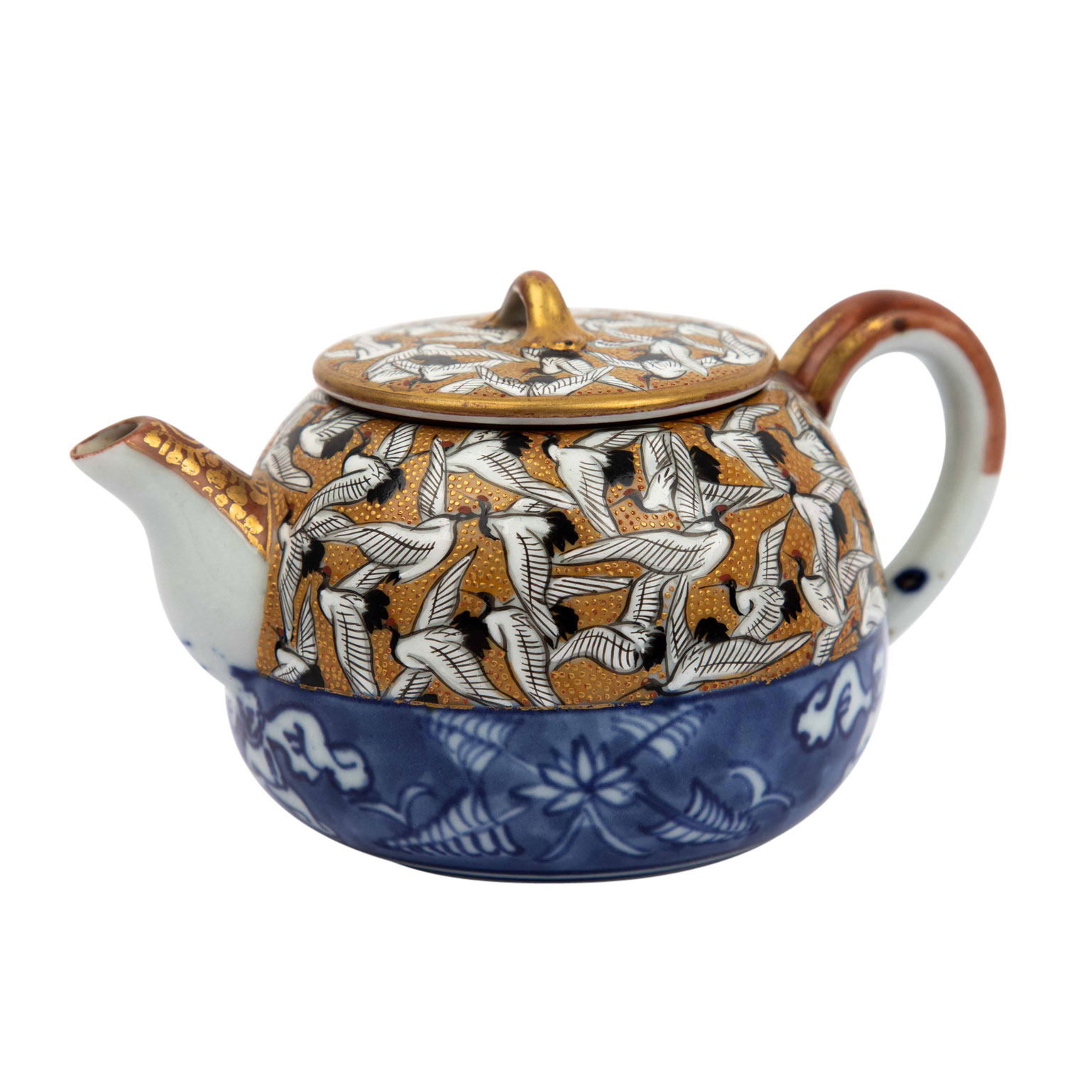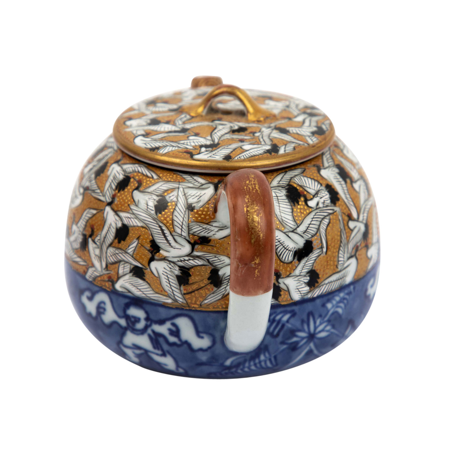 | Tea service for 2 persons, JAPAN, Showa period (1926-1989). Consisting of teapot, h. 7 cm, pot, h. 4,5 cm and 2 tea cups, h. 4,5 cm. Each finely painted: in the lower part circled underglaze blue and in the upper part with cranes of gold fond, 4 parts underneath with underglaze blue bottom mark.