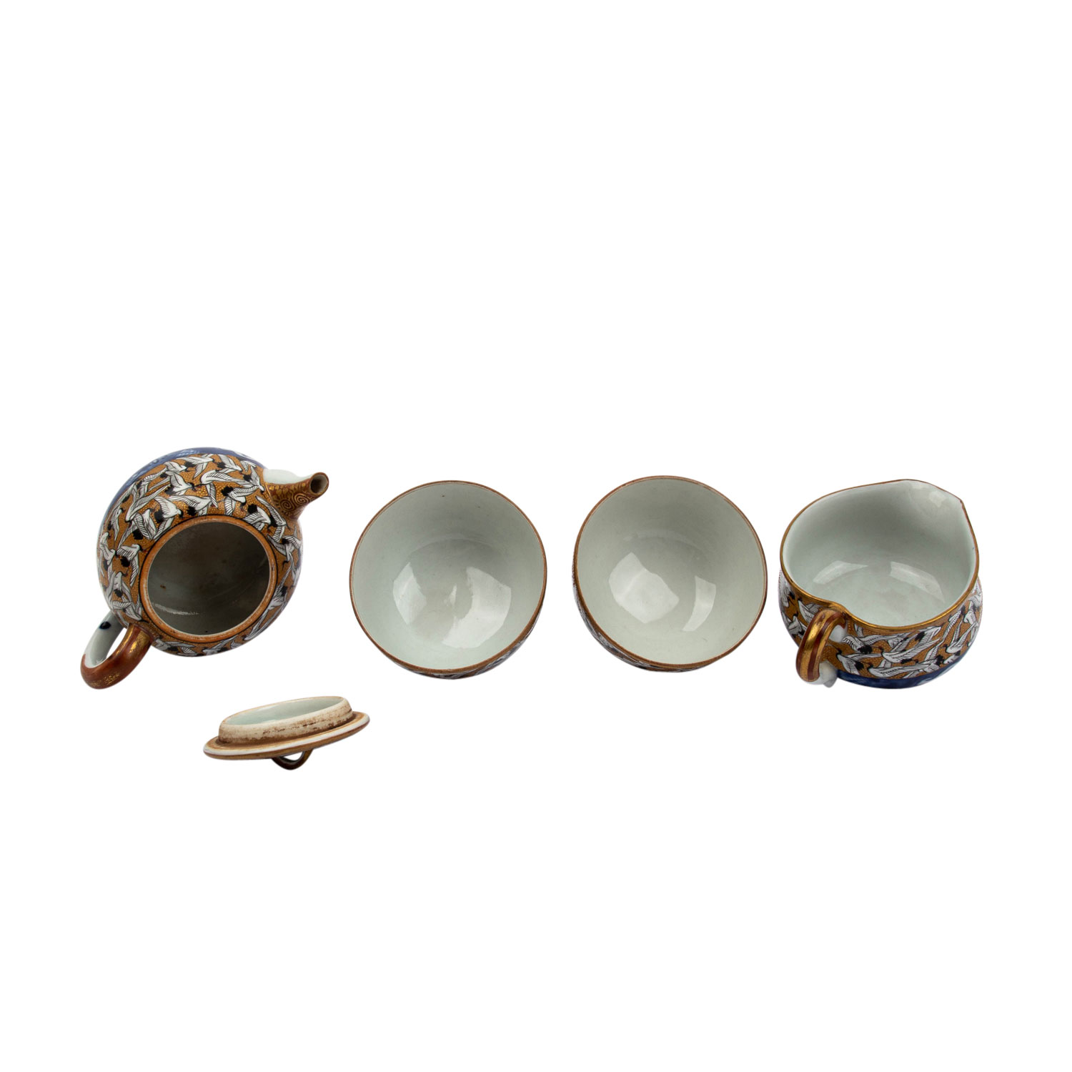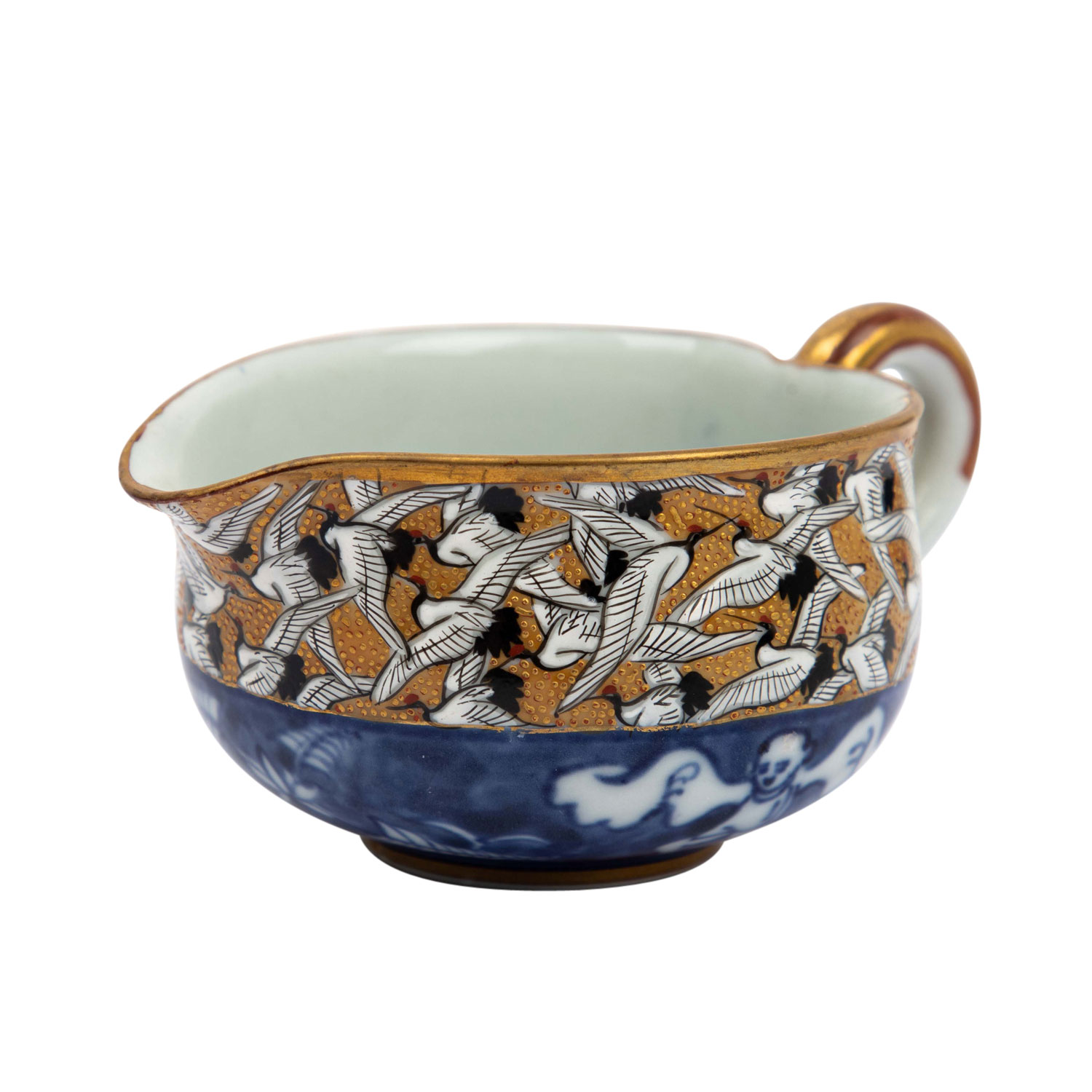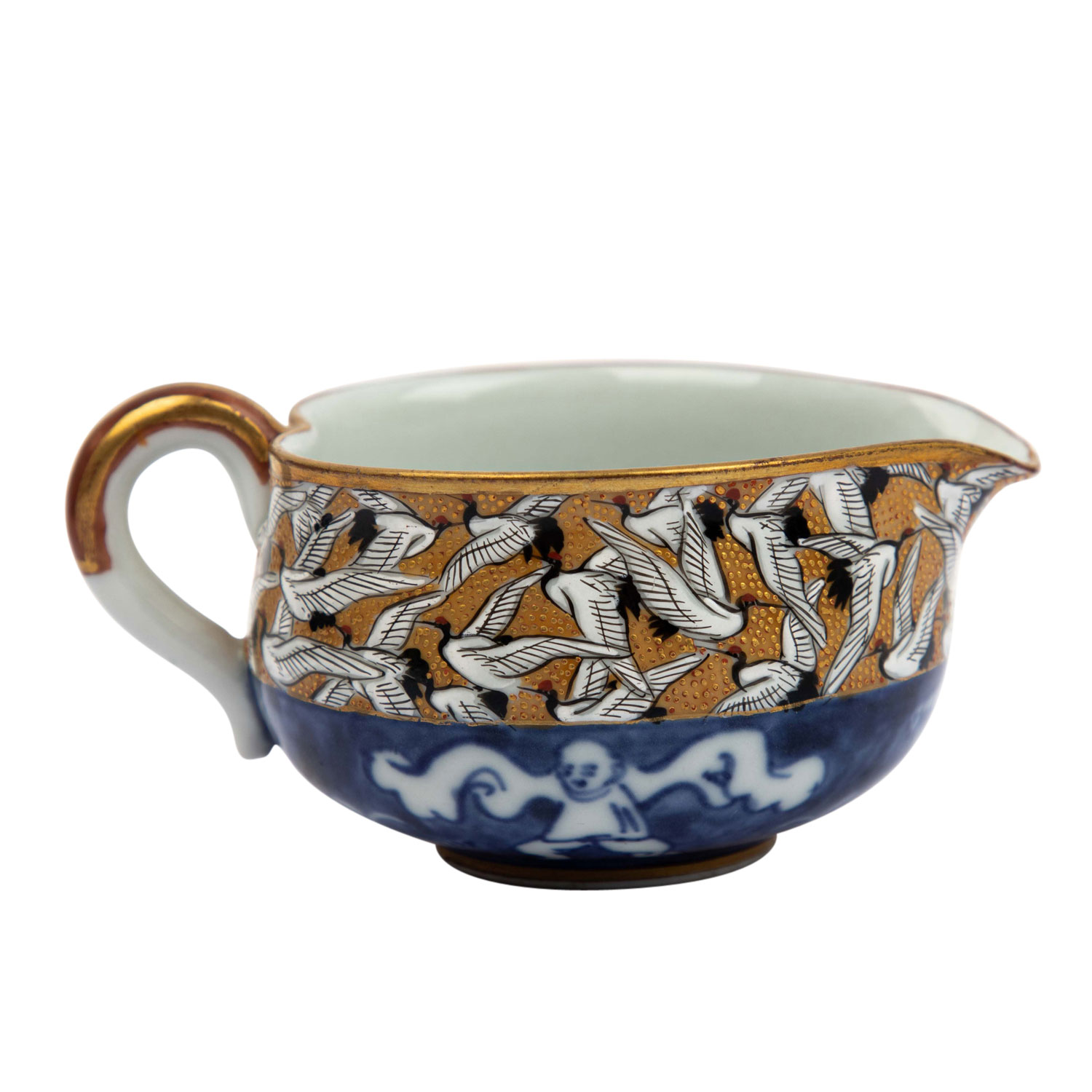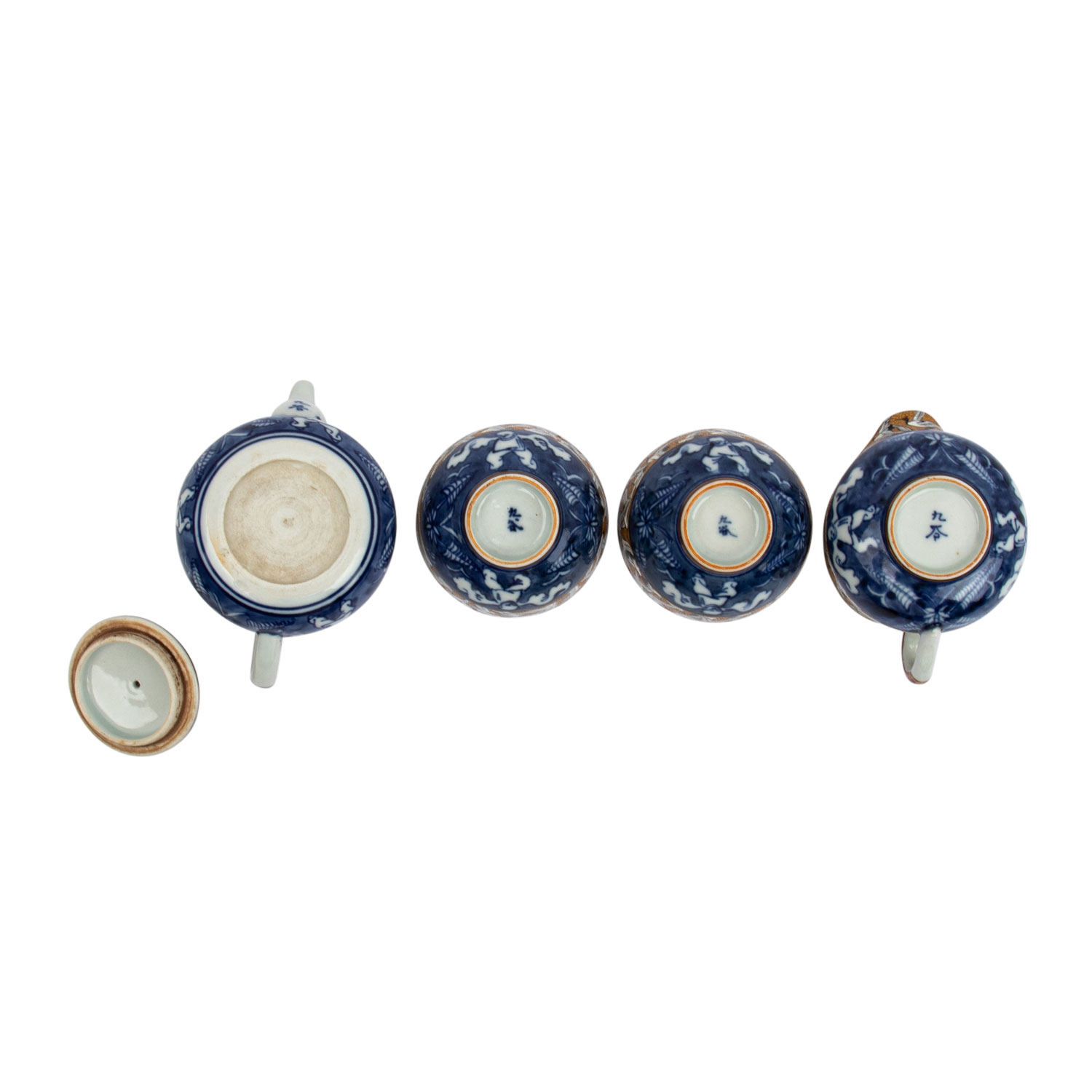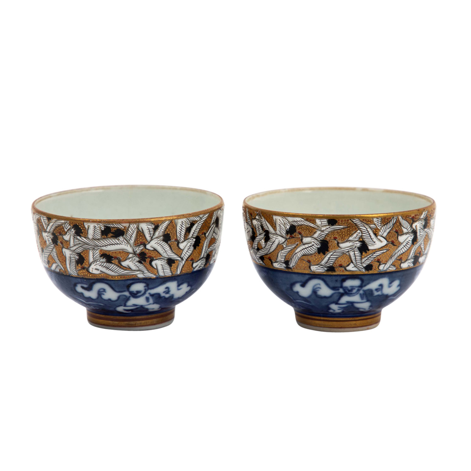 | Tea service for 2 persons, JAPAN, Showa period (1926-1989). Consisting of teapot, h. 7 cm, pot, h. 4,5 cm and 2 tea cups, h. 4,5 cm. Each finely painted: in the lower part circled underglaze blue and in the upper part with cranes of gold fond, 4 parts underneath with underglaze blue bottom mark.