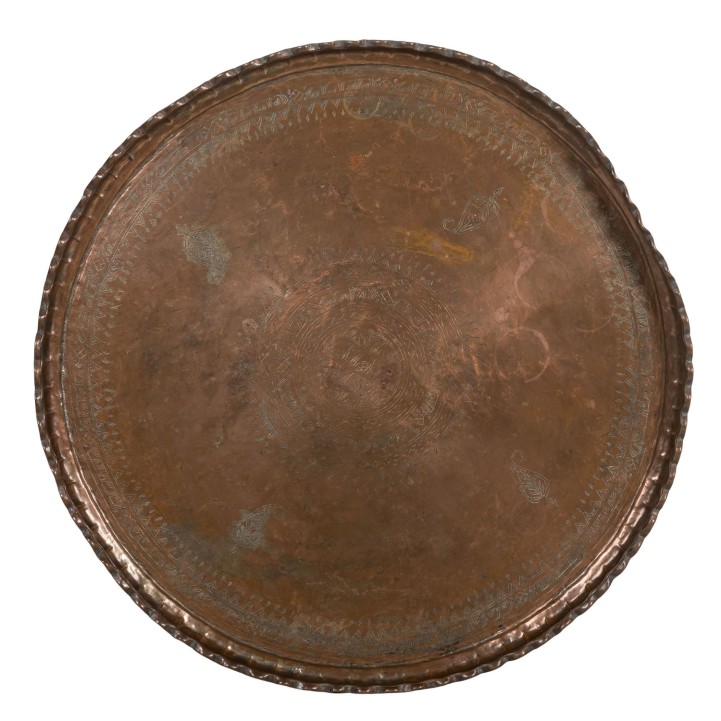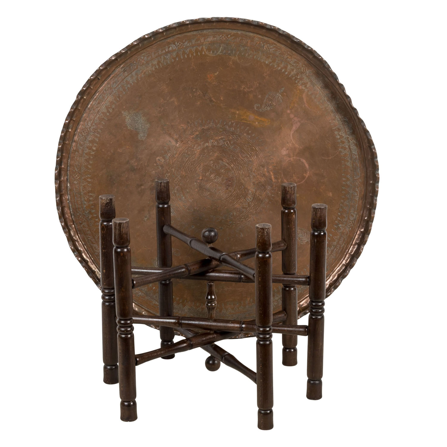Tea table, ORIENTAL, probably Persia, circa 1950. Consisting of a large copper tray with engraved decoration (D: 84 cm) and a matching collapsible wooden base (H: 46 cm). Signs of age and wear.
