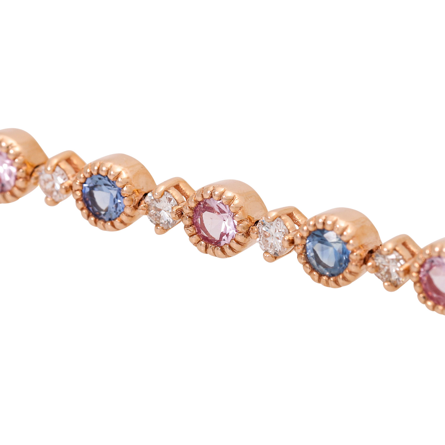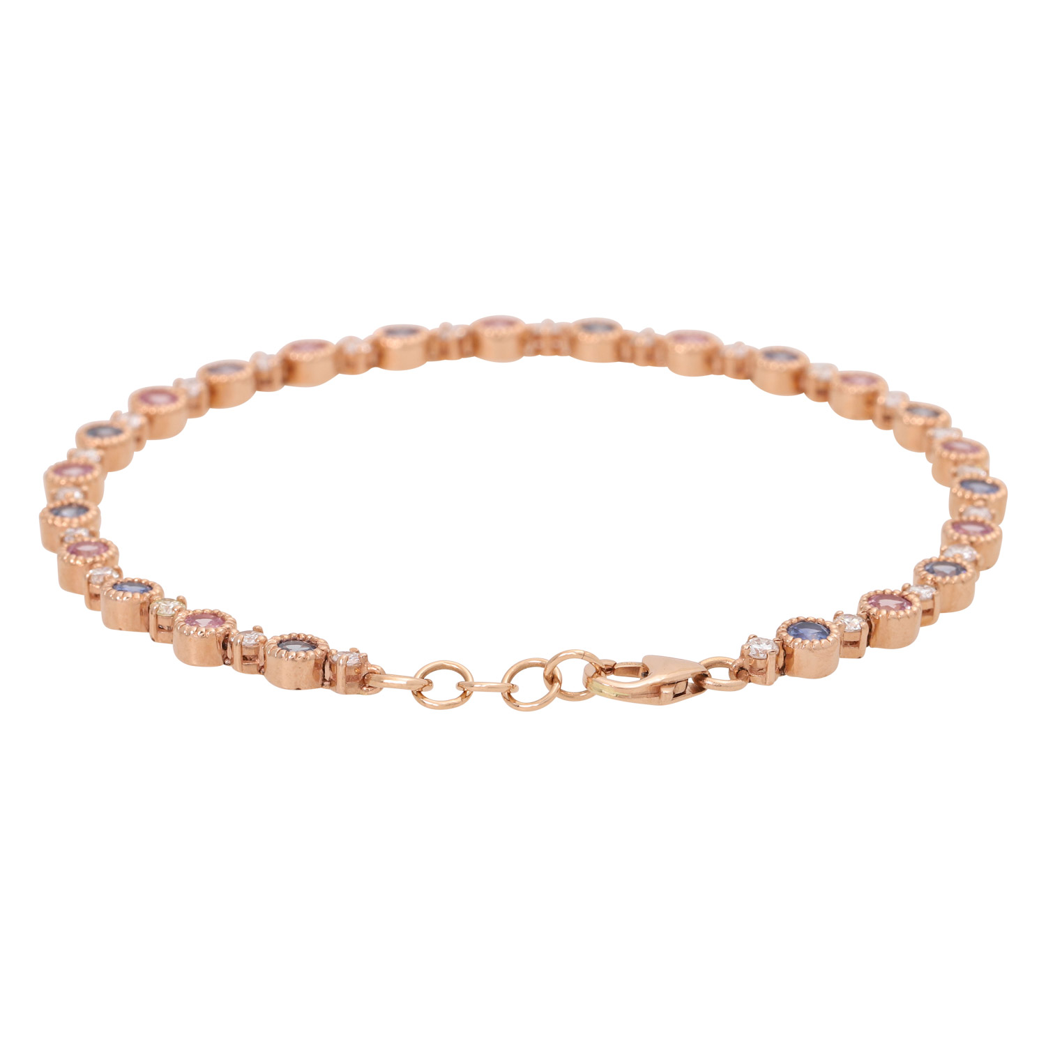 Tennis Bracelet with fine pink and blue sapphires and 24 diamonds of totalling ca. 0.60 ct, of good to medium color and clarity, 2 diamonds chipped at the bezel, RSG 14K, 7 g, L: variable from 18 to 19 cm, 21st c. Mint condition.