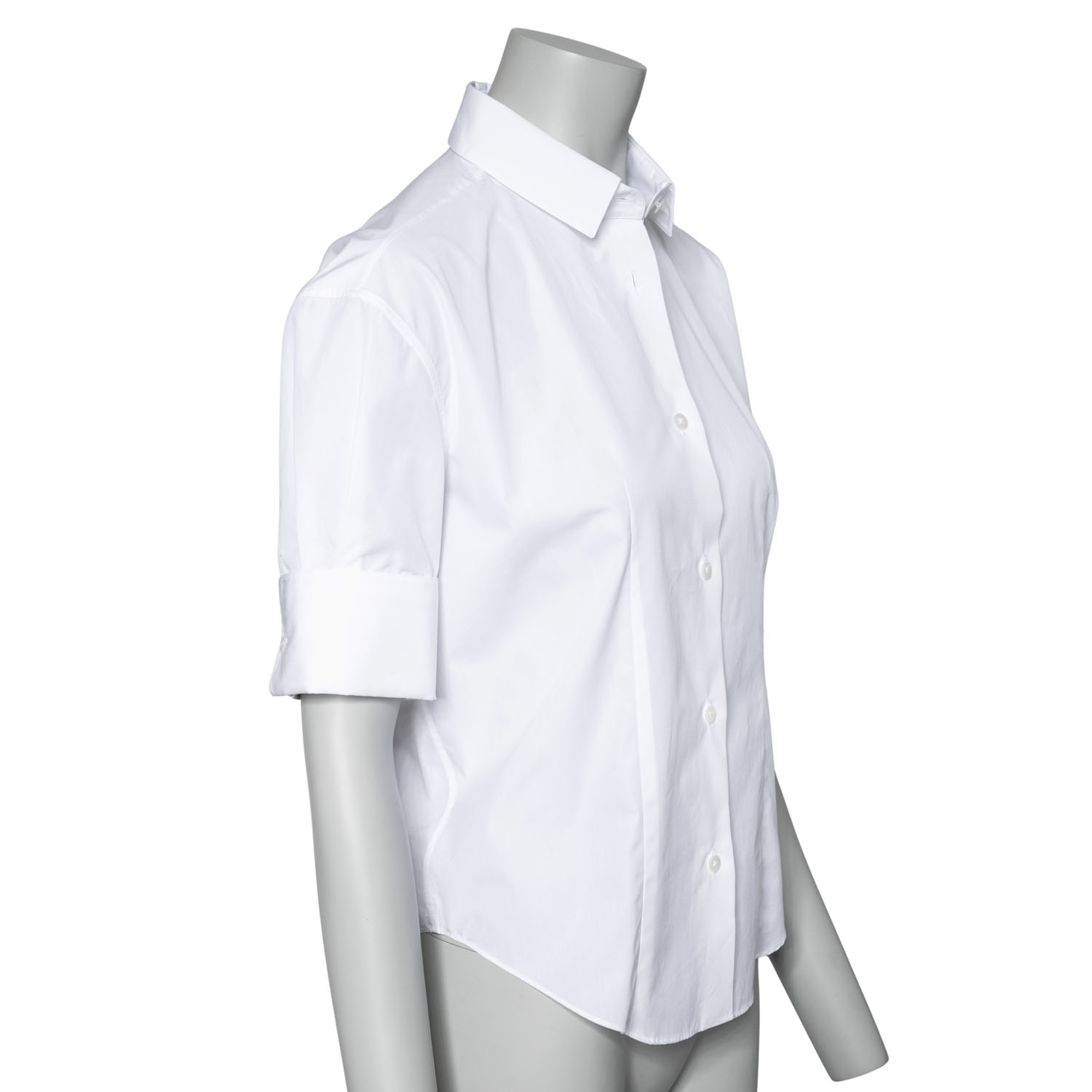 THE ROW blouse, size 2. 100% cotton in white. Simple design in white with short sleeves, wide cuffs, collar, and button placket. Very good condition.