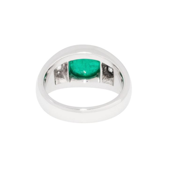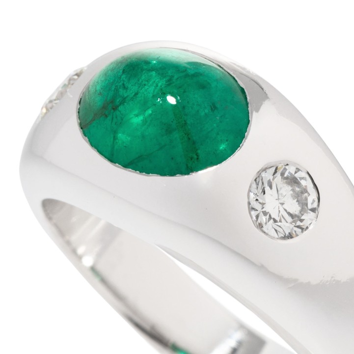 THEODOR HEIDEN ring with emerald cabochon and 2 brilliant-cut diamonds totalling ca. 0.50 ct, ca. RW-WHITE (G-H)/SI, 18K WG, 13.1 g, ring size 56, late 20th century, minor signs of wear, inside with maker's mark.
