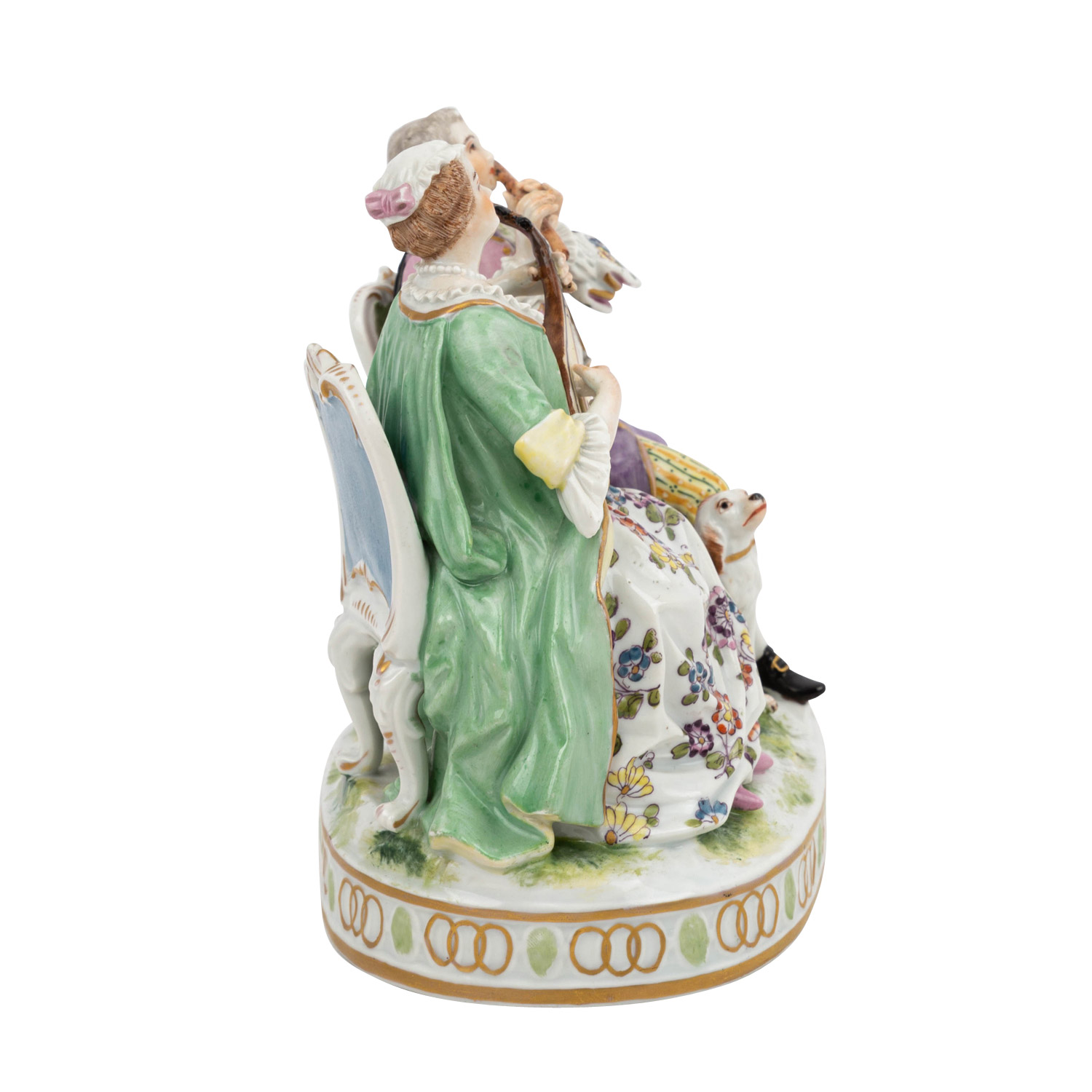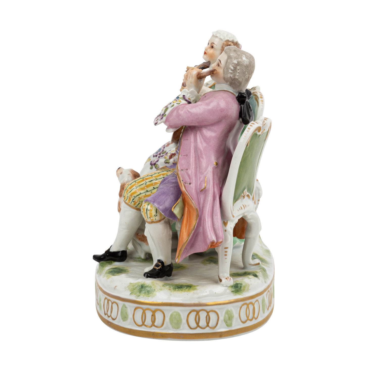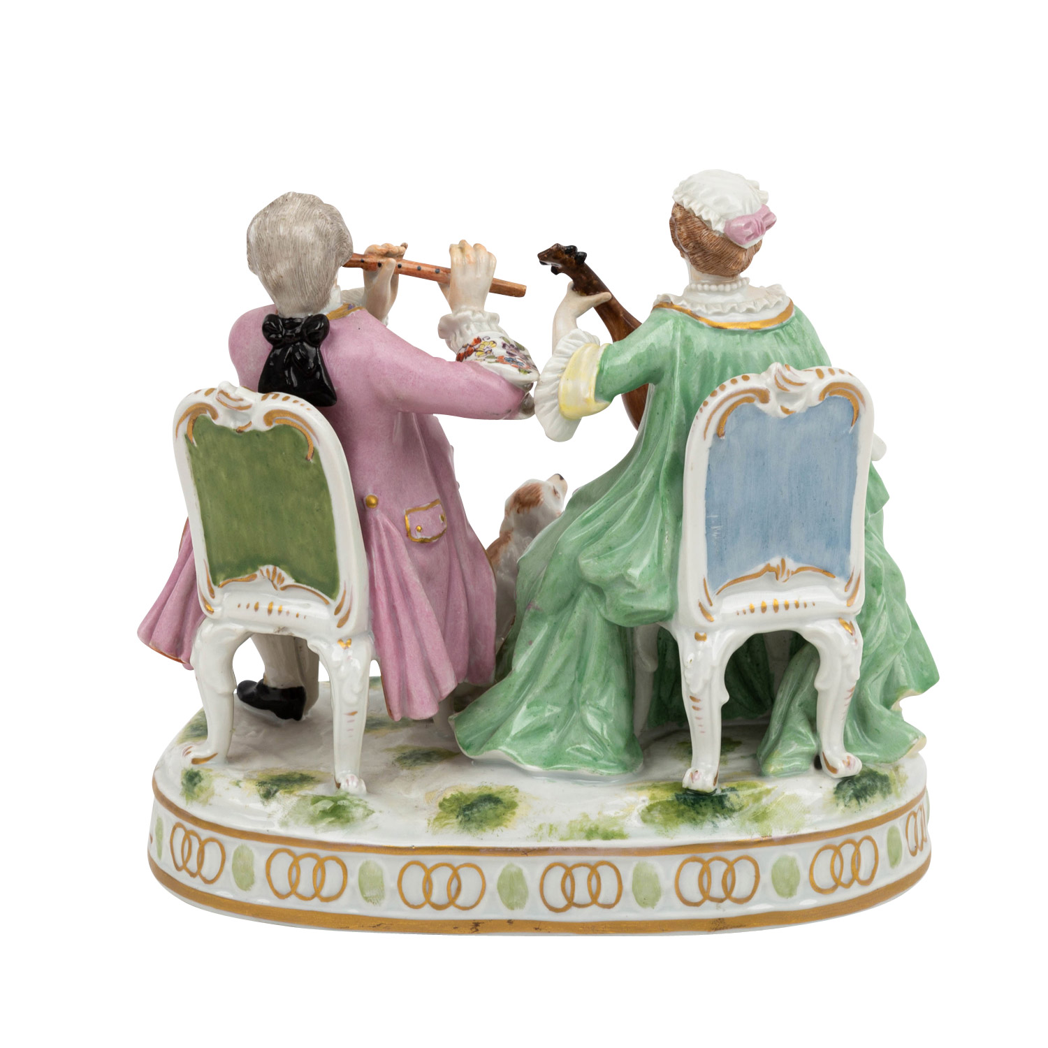THURINGIA 'Music-making Couple', 1st half 20th c. White porcelain polychrome painted, flutist and lute player in baroque dress sitting on chairs, a dog at their feet, on oval natural base, crowned double C mark on the underside, h. ca. 14.5cm. Restored, a.o. lute bridge and hand, traces of age.