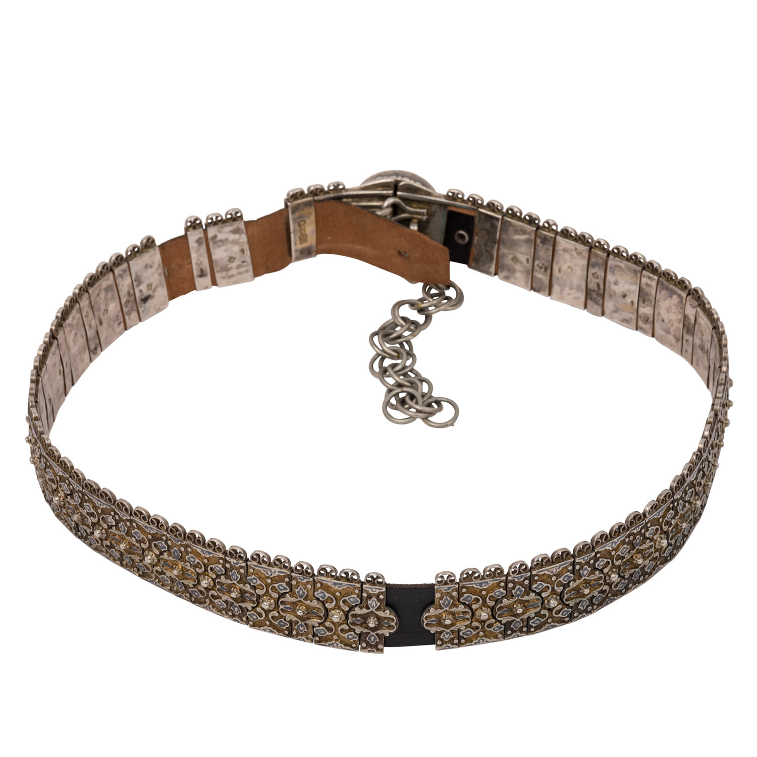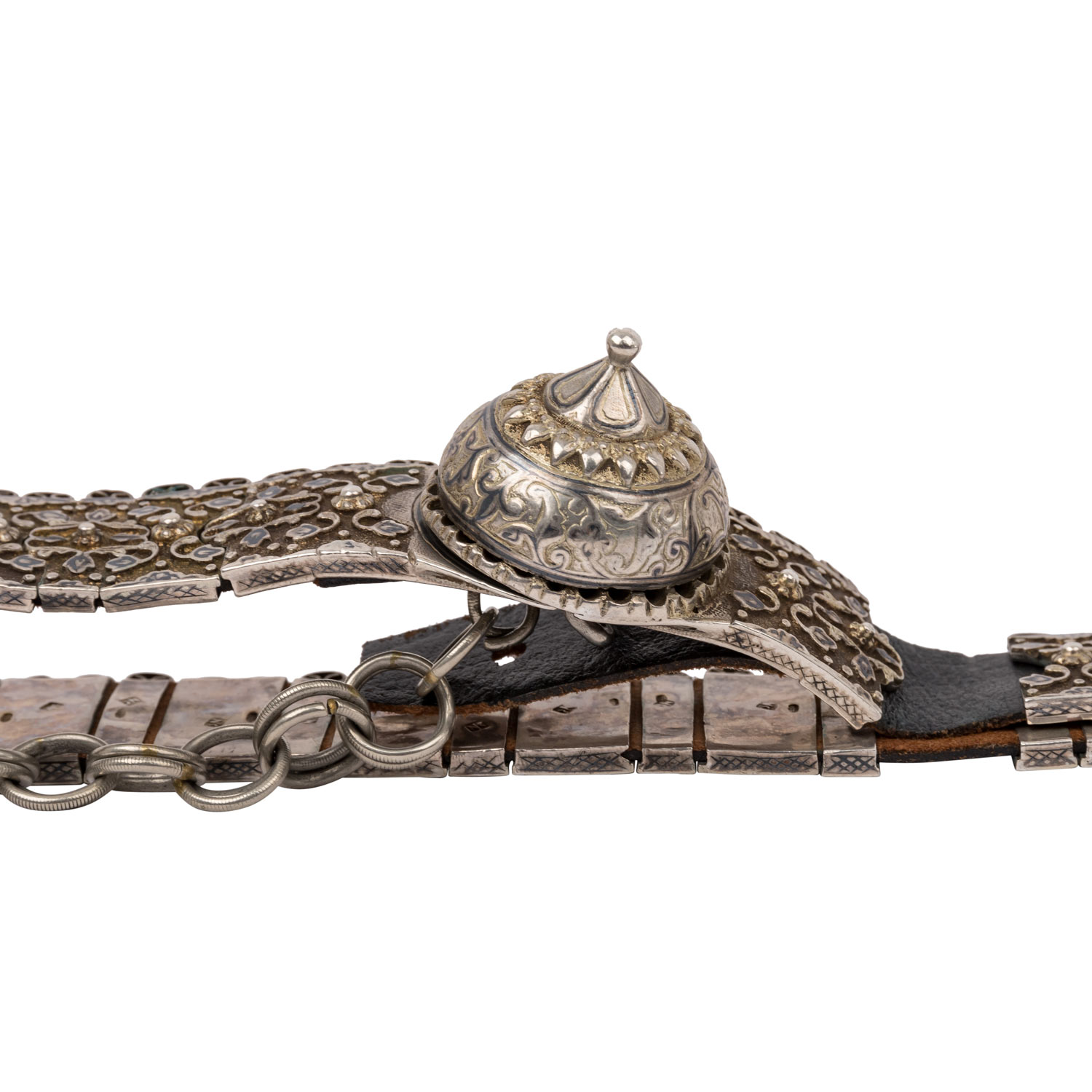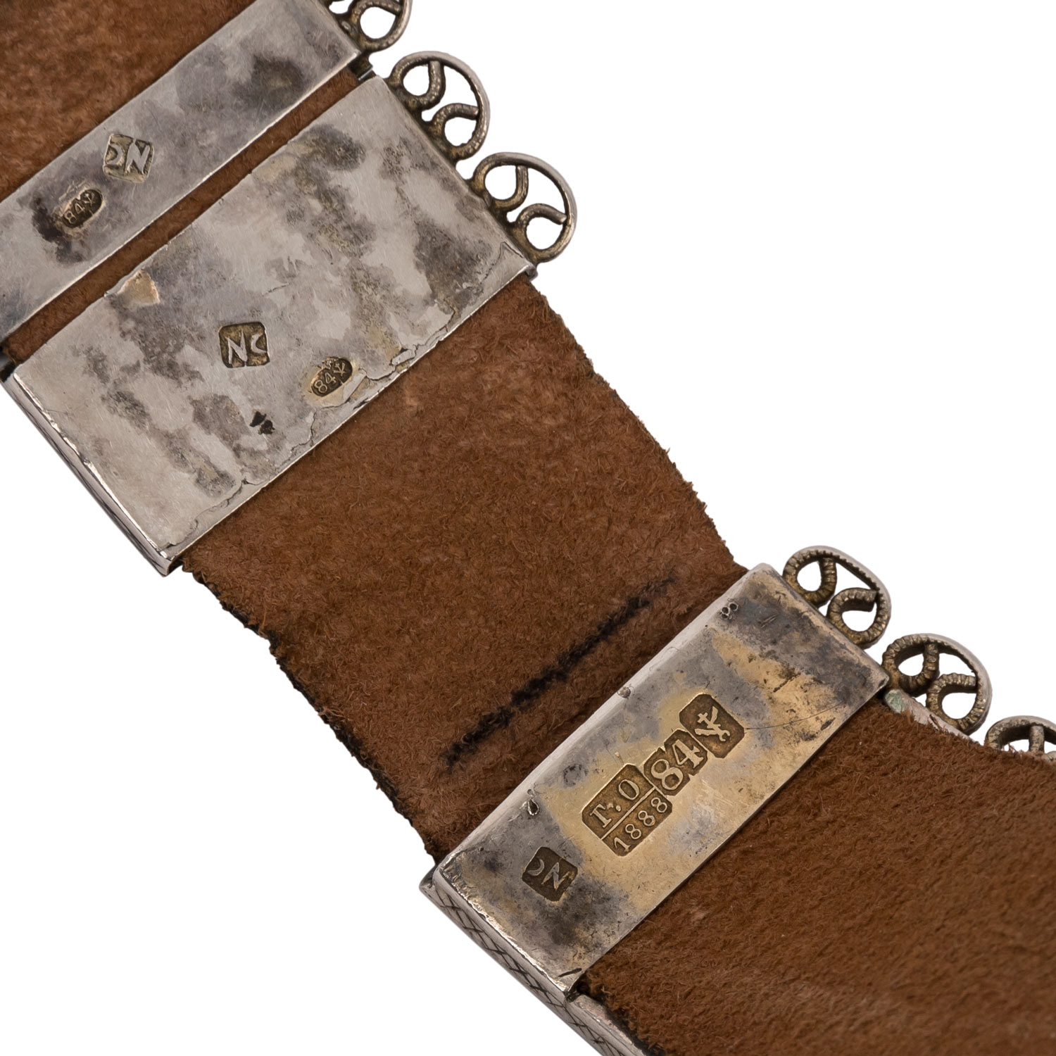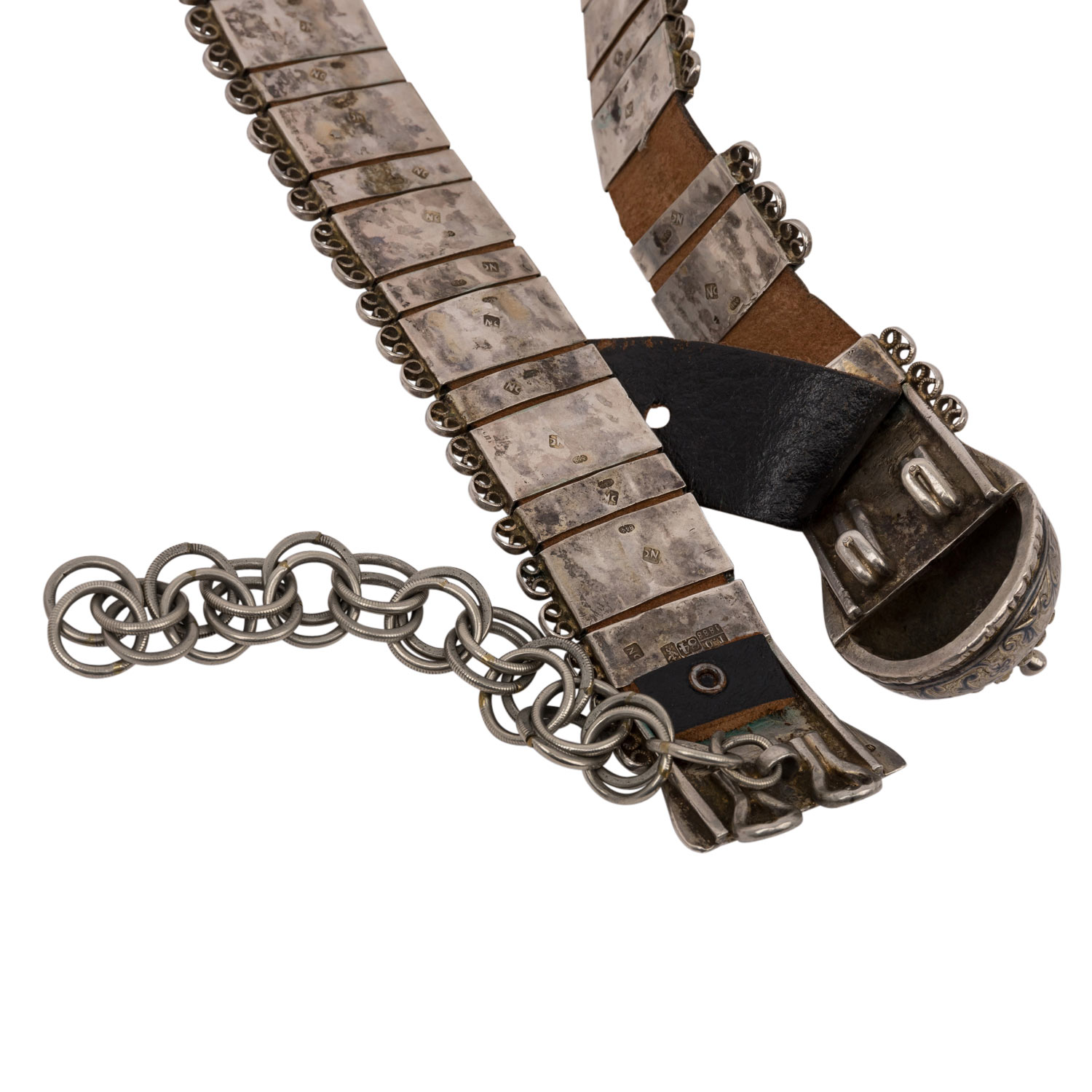 TIFLIS, silver belt, 84 zolotniki, 1888. Ornamentally designed silver segments in niello on a leather belt, dome-shaped belt buckle, residual gold plating, l. approx. 90 cm, total weight approx. 710 g. Enclosed 1 deviating silver segment, rubbed, signs of age and use.