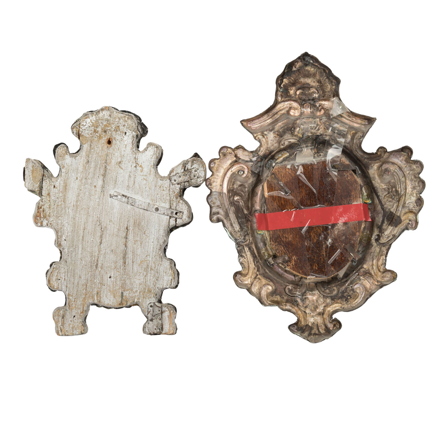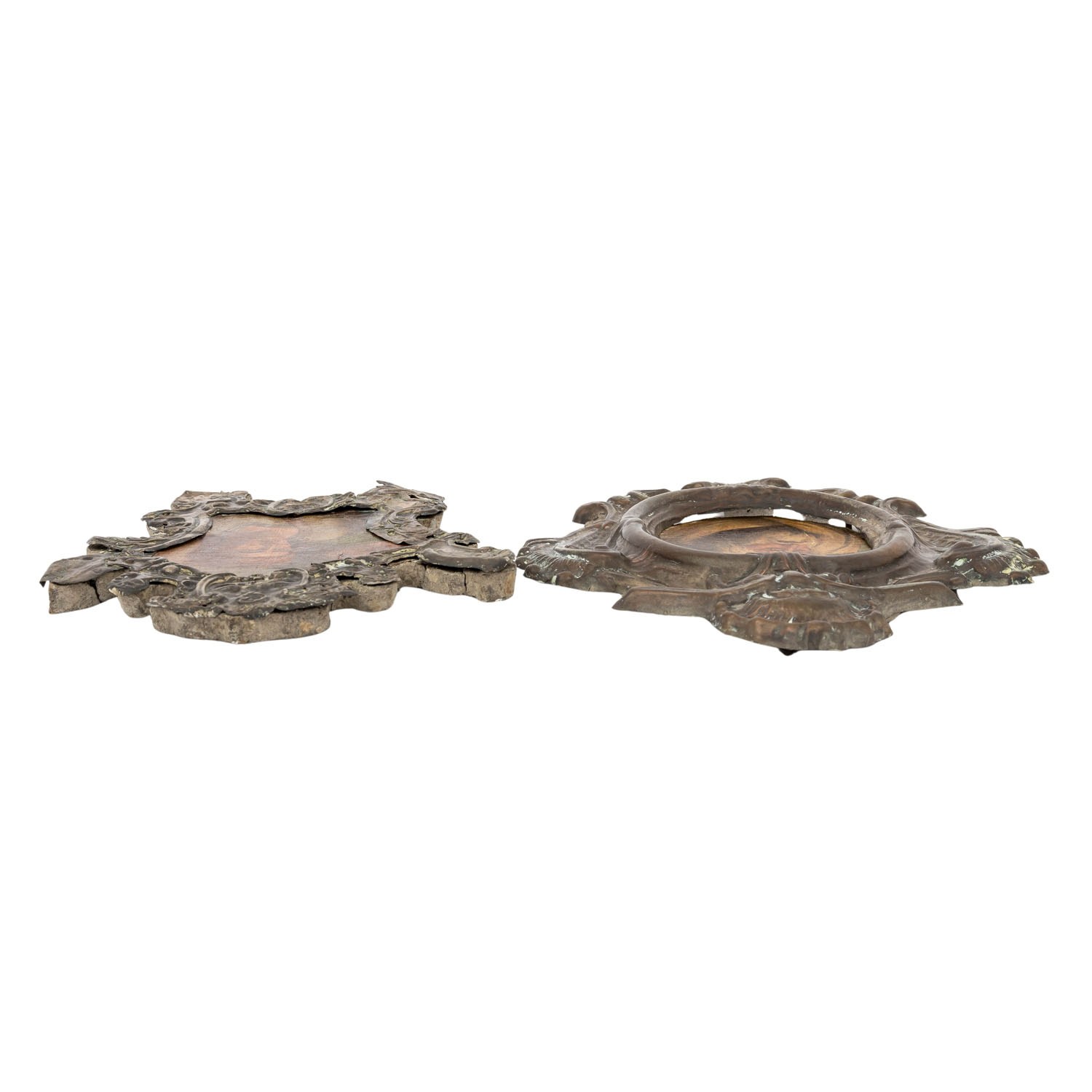TWO CANON PANEL FRAMES, 18th century, silver-plated copper, chased metalwork with rich volute decoration, wooden panels with mounted canvas cut-outs of a youth and Euclid of Alexandria inserted later. HxW max.: 32/24 cm. Significant signs of age and wear, partially dam.