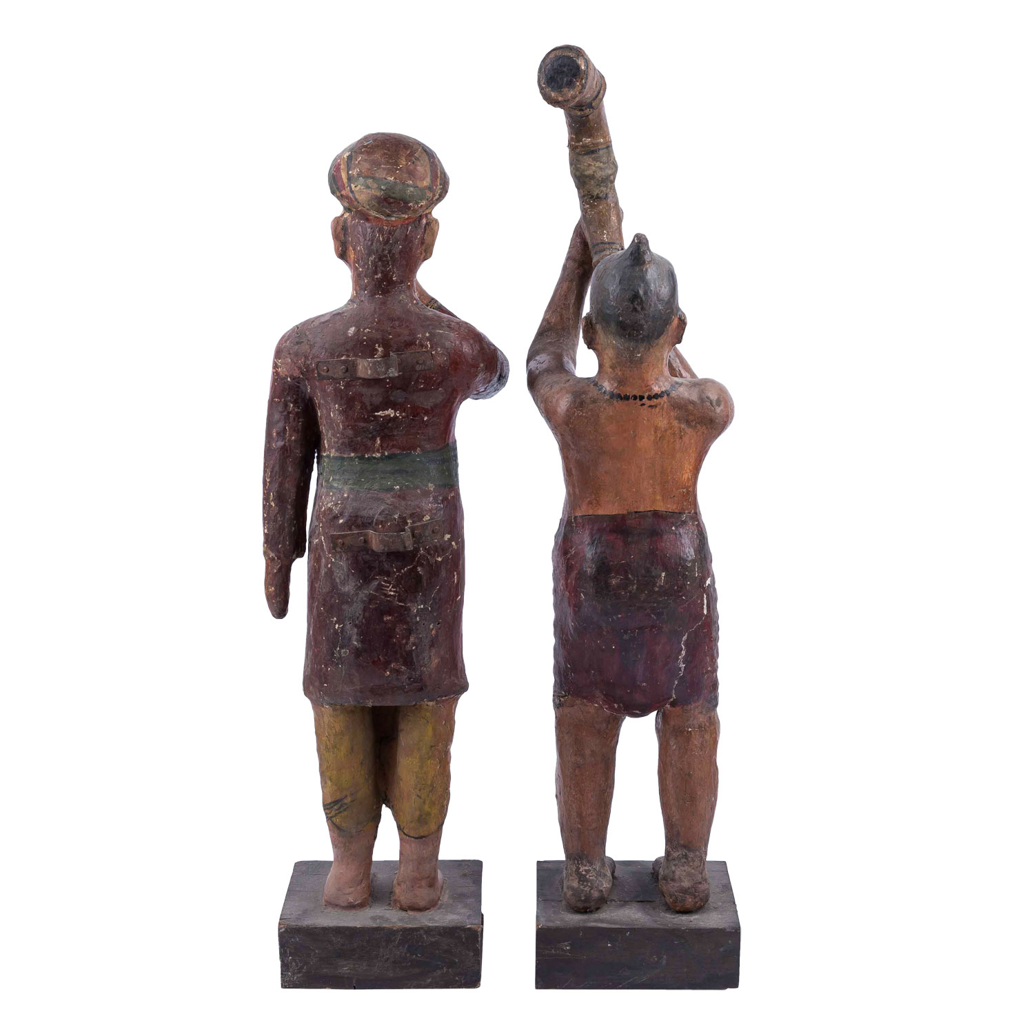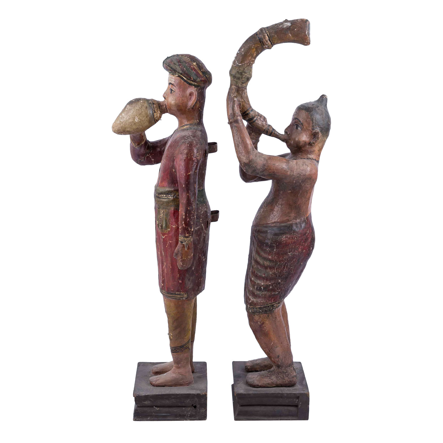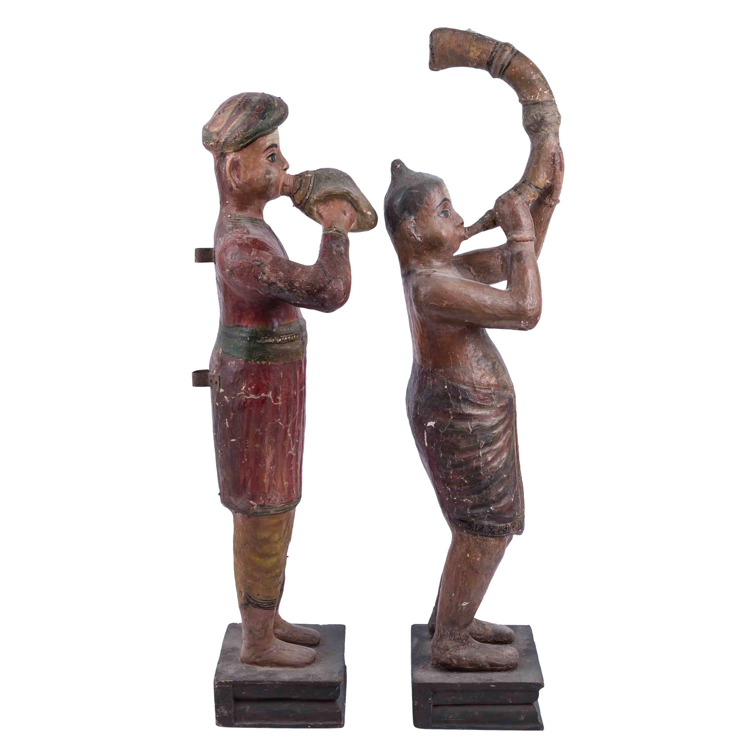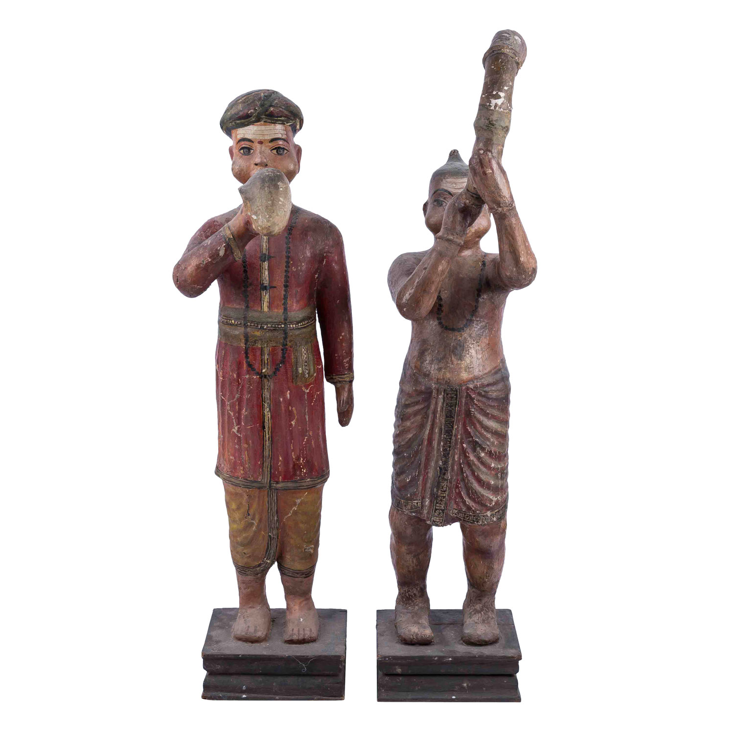 Two wooden folk musicians. INDIA, mid 20th c., each standing on a square base. Depicted is a Hindu priest playing ranasringa (an Indian horn wind instrument), H: 107 cm and a Rajasthani playing a snail horn. H: 103 cm. The paint mounts are partly worn, dam.