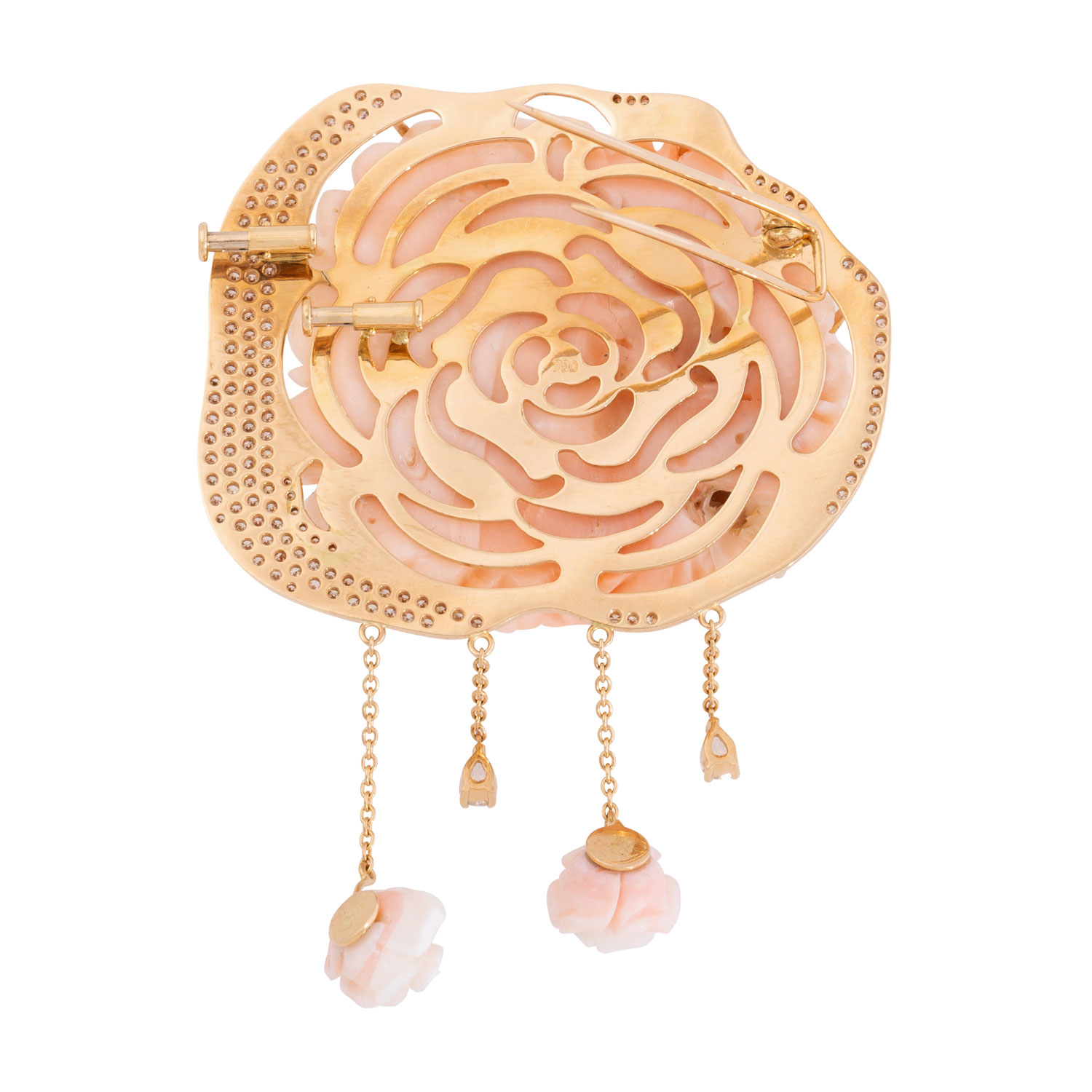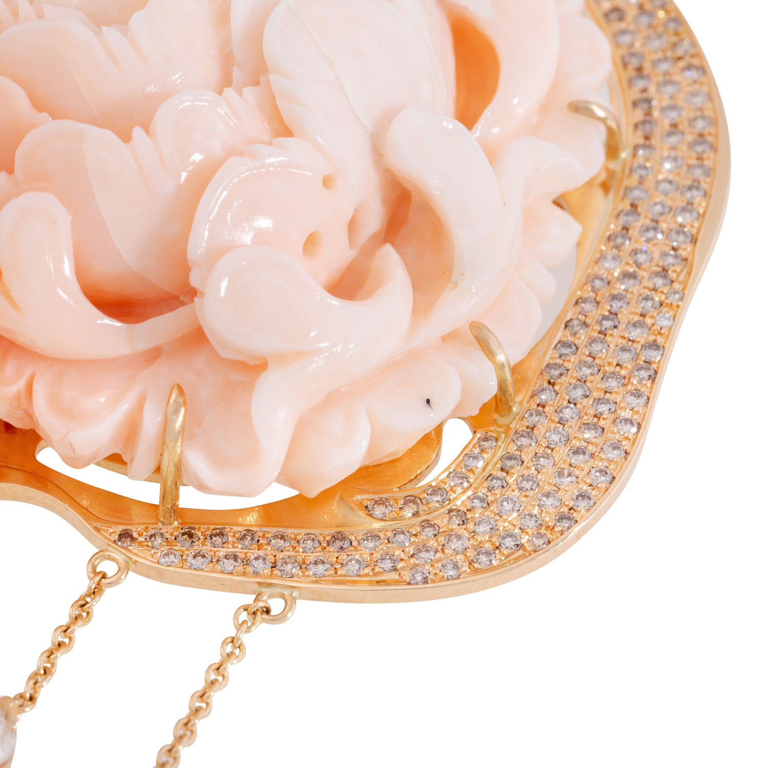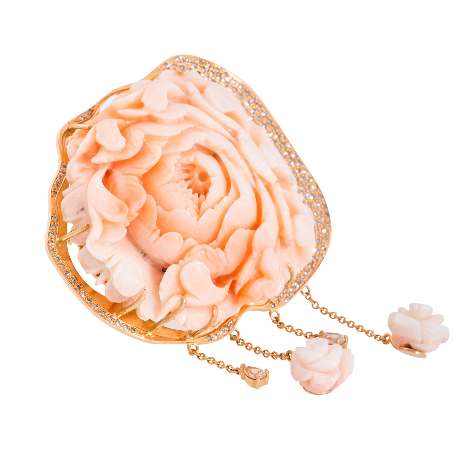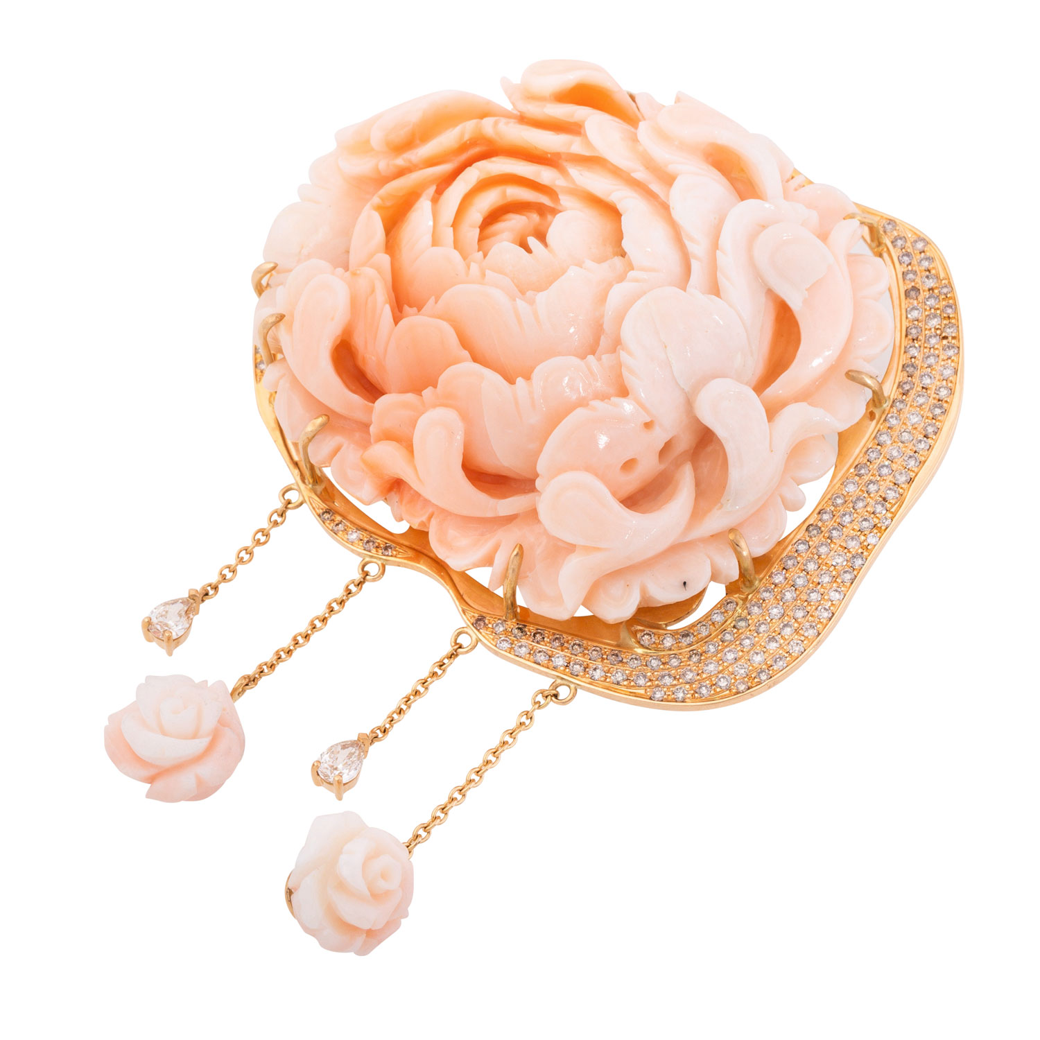 Unique brooch made of precious coral 'Peony', frame 18K RSG set with brilliant-cut diamonds totalling ca. 1.6 ct, good to very good colour a. clarity, 63.2 gr, W: ca. 5.5 cm, 21st century, mint condition. True-to-life coral carving. IMPORT/EXPORT RESTRICTIONS OUTSIDE THE EU!