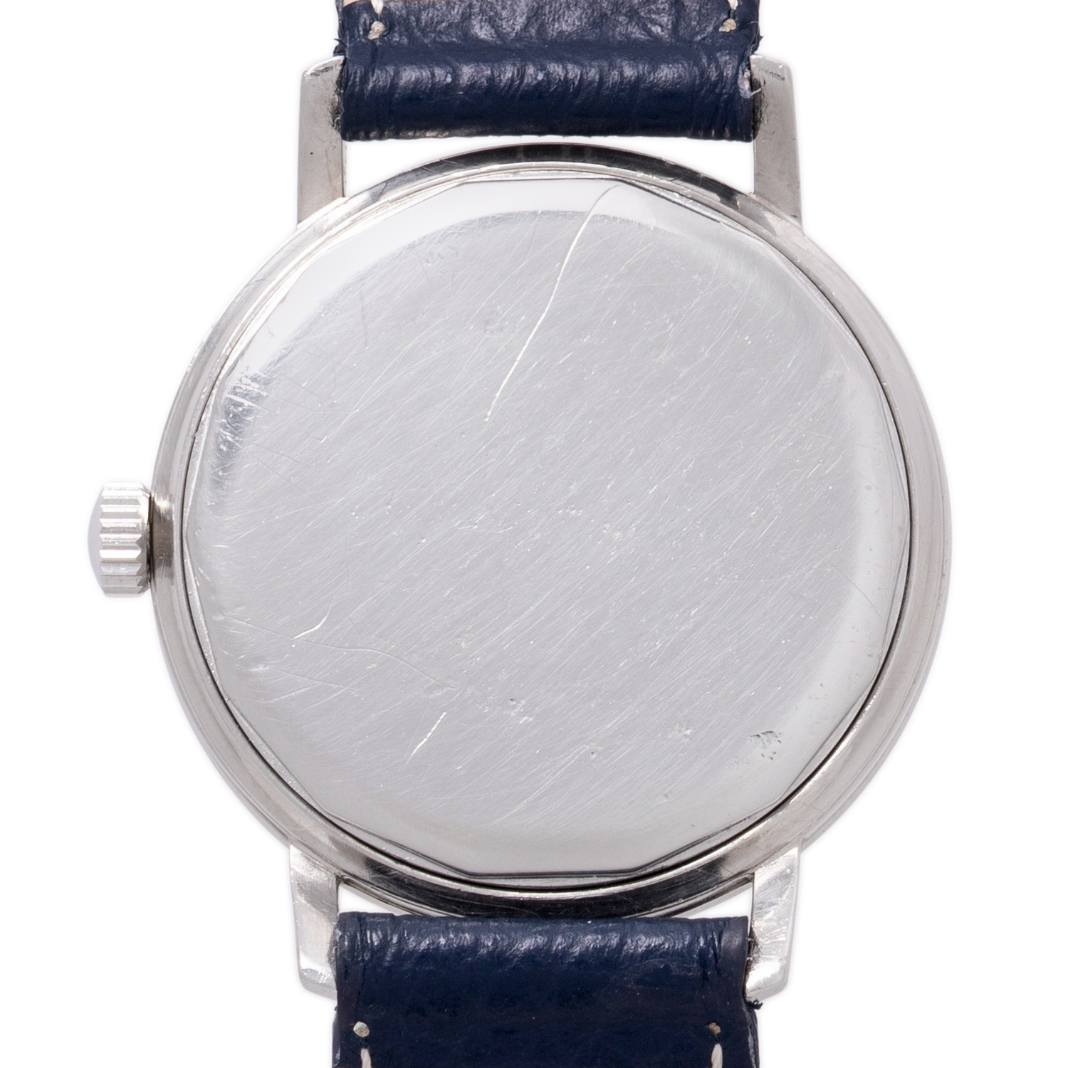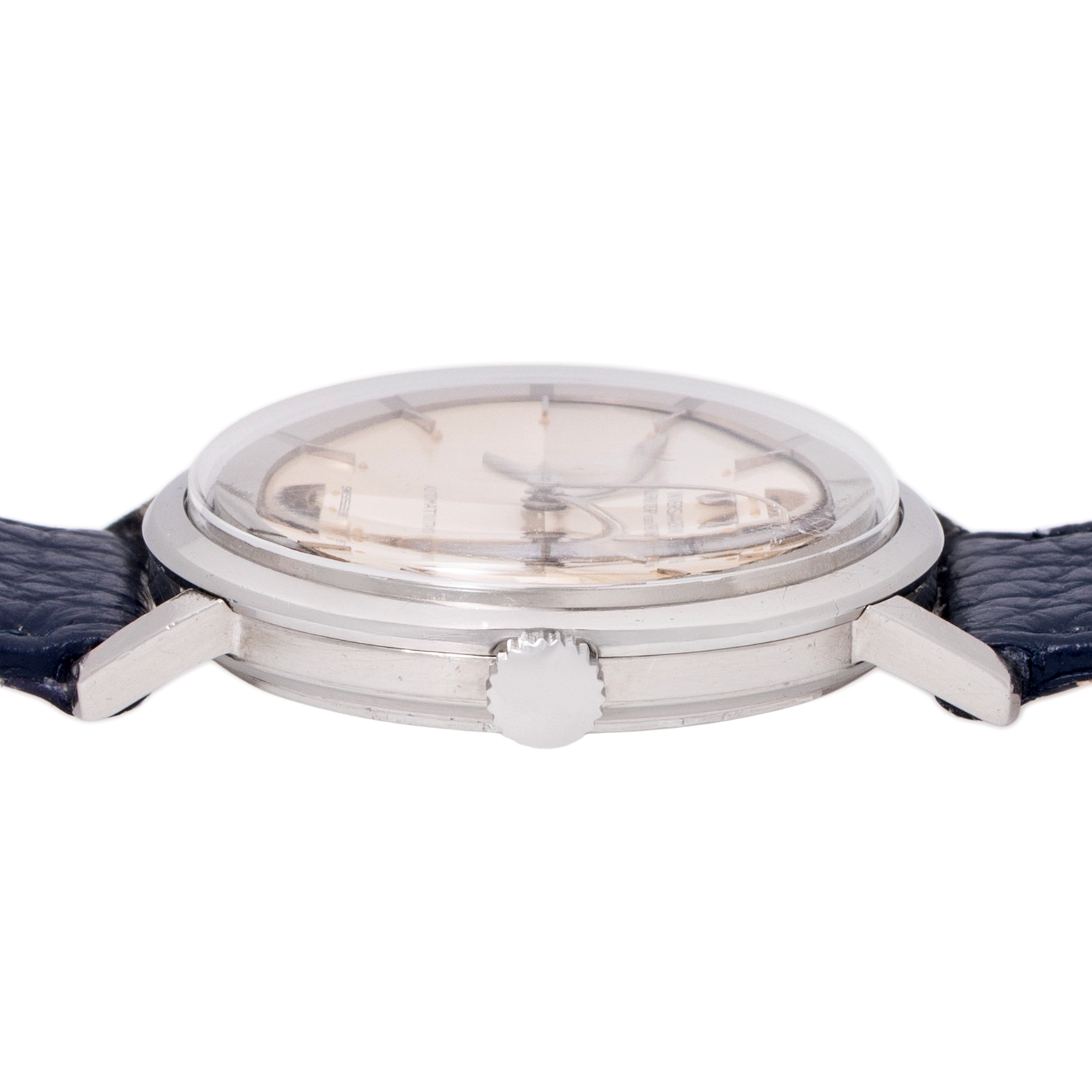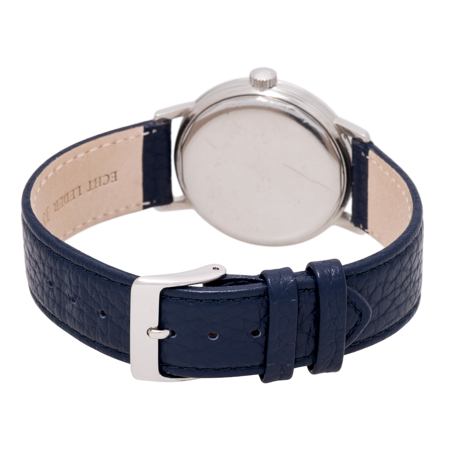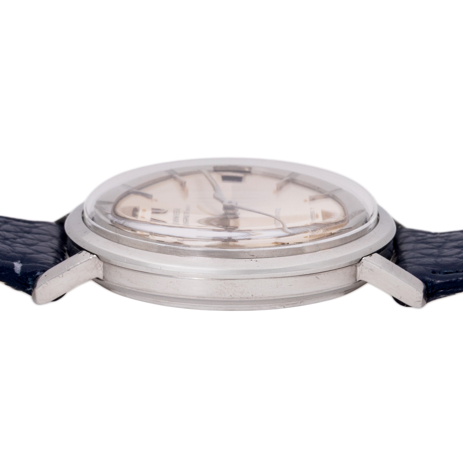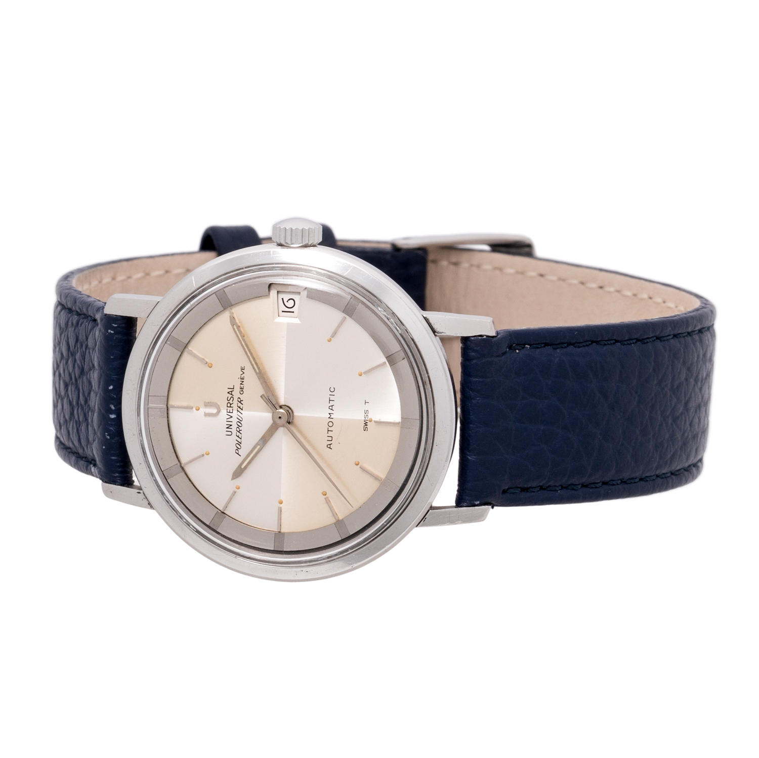 UNIVERSAL GENEVE Polerouter Ref 204604-8 men's watch. Stainless steel. Automatic movement cal. 69 with very good performance (+3s/d. 262°). Silver-coloured tritium dial with shadow pattern and date display. Neutral leather wristband with pin buckle. Good condition with visible signs of wear. Diameter approx. 34 mm (measured without crown).