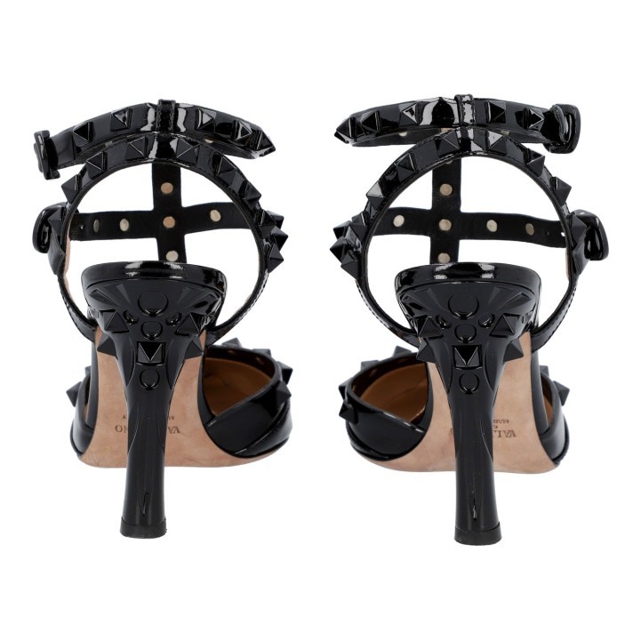 VALENTINO Pumps 'ROCKSTUD', size 37, retail price: 950,-€. Black patent leather with black hardware, pointed toe, studded trim, straps and decorative heel (approx. 10 cm). Signs of wear present.