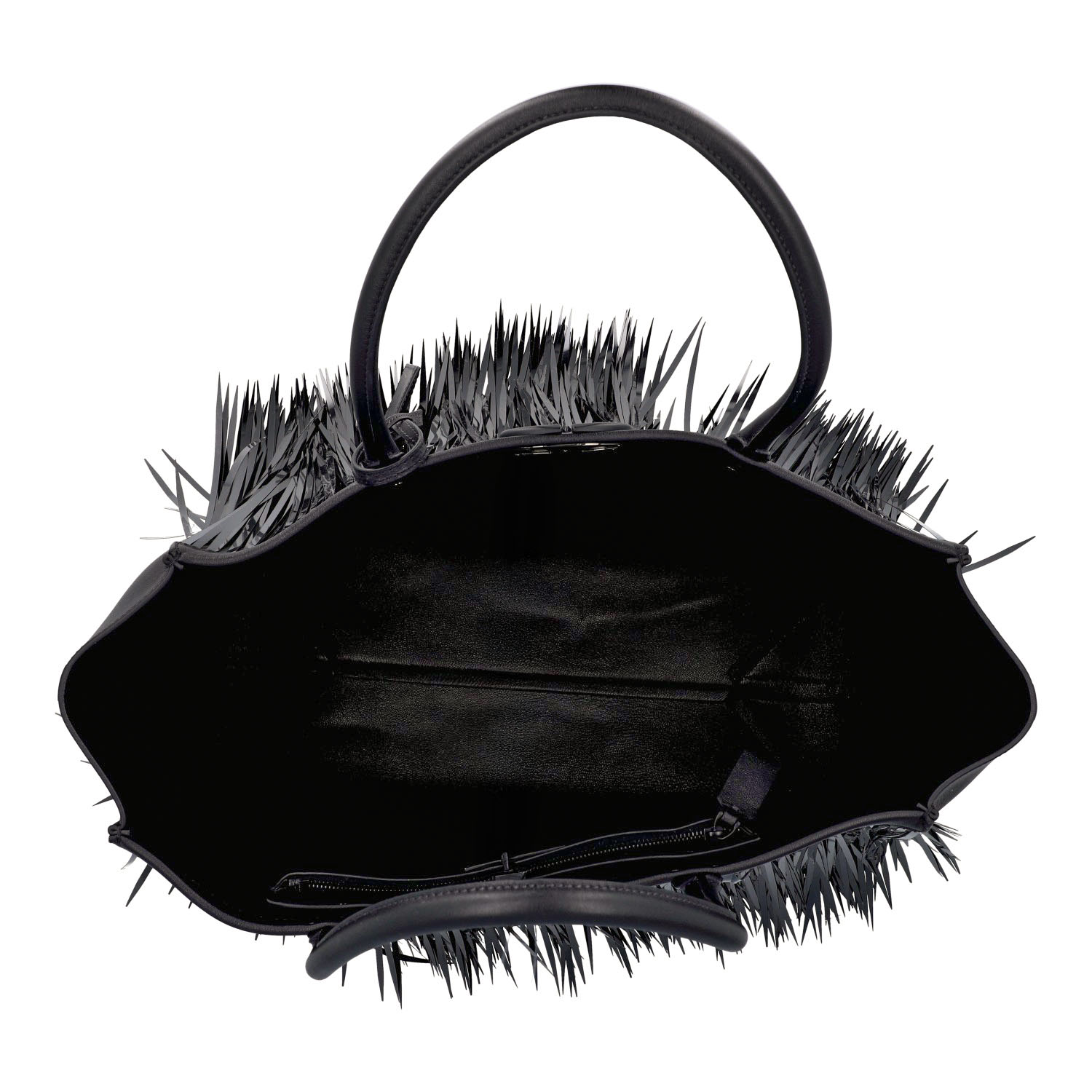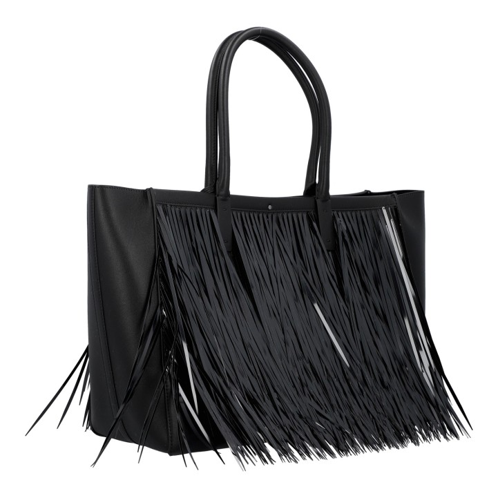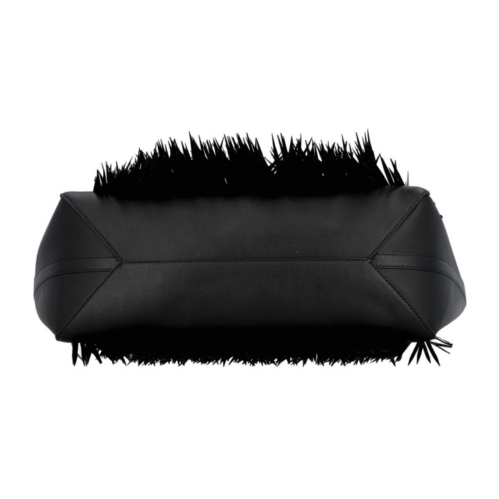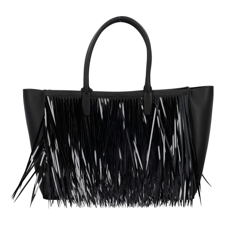 VALENTINO Shopper 'VLOGO LOCKET'. Made of finely grained black leather with decorative black faux ostrich fringe. Double handles, V-logo snap closure, address tag, leather lining with small interior compartment. Very good condition. Dust bag included. 37x15x27cm.