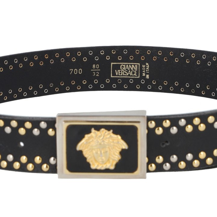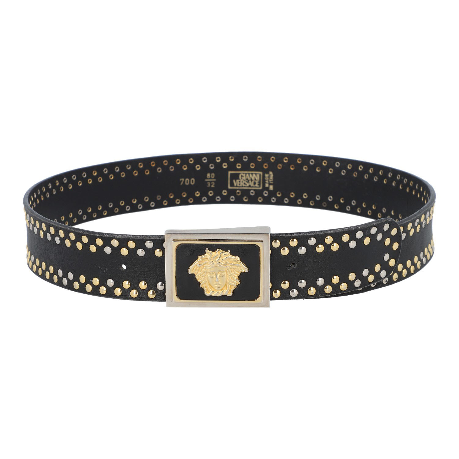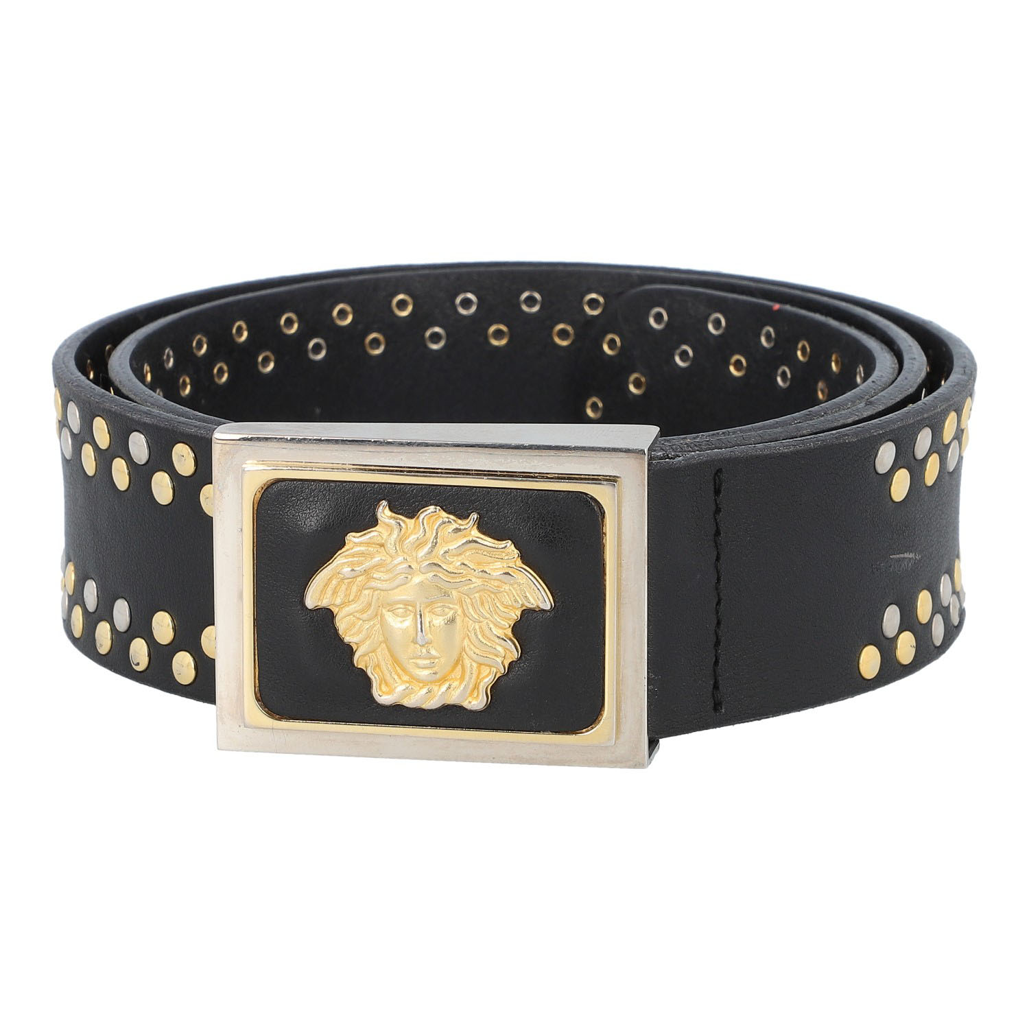 GIANNI VERSACE VINTAGE belt, l.: 80 cm. Black leather with bicolour stud application and buckle with Medusa head. Signs of wear present. Width: 4 cm.