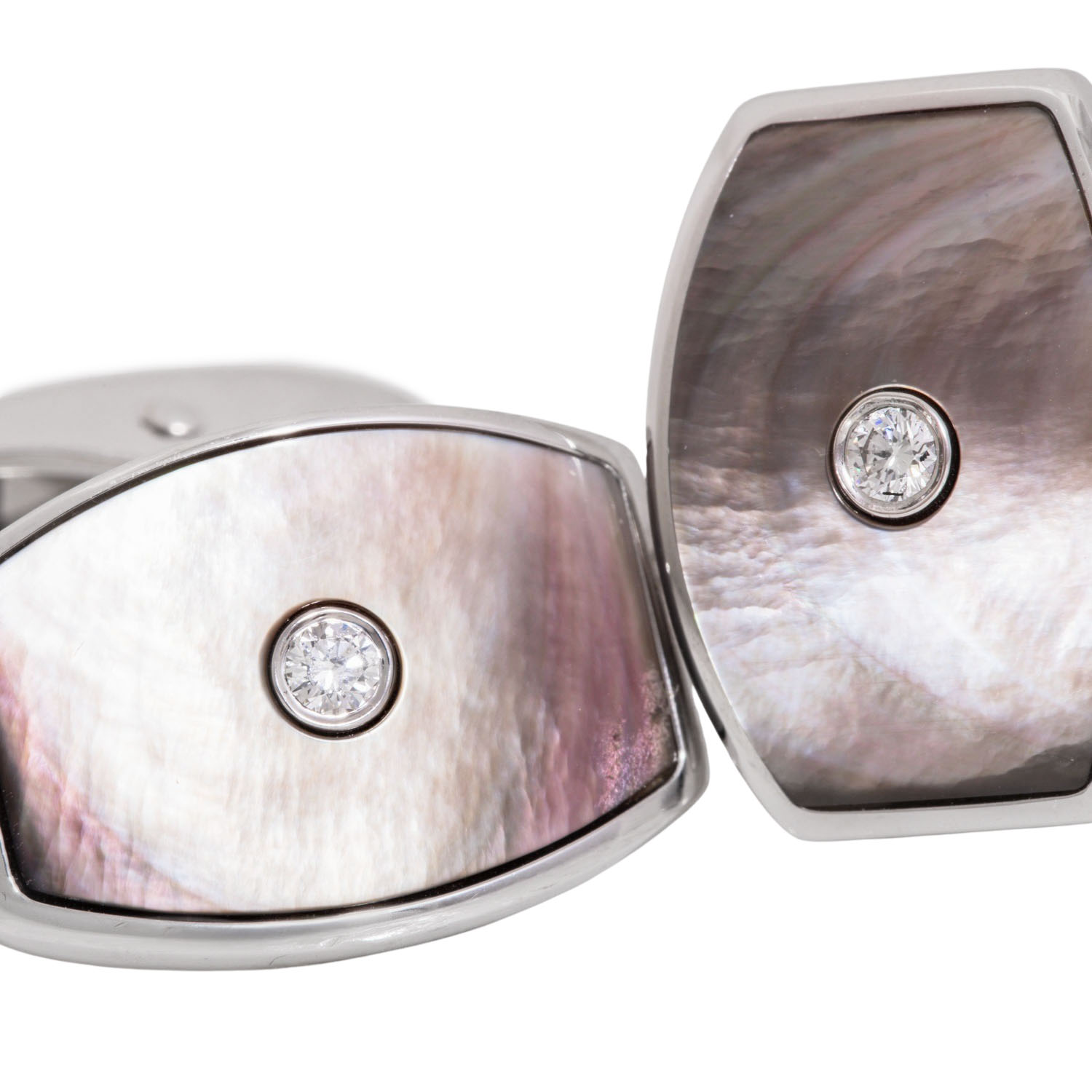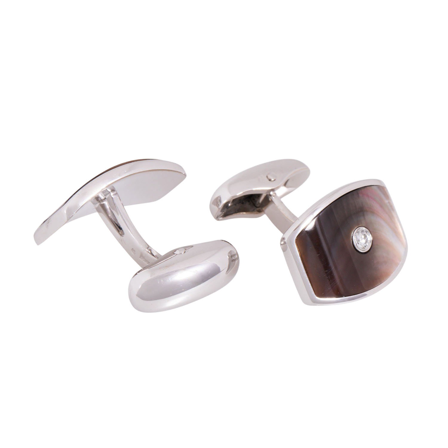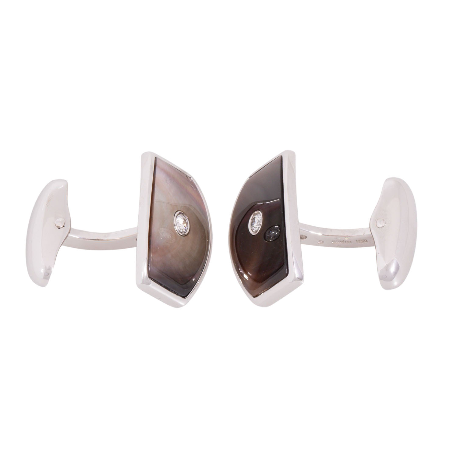 VICTOR MAYER cuff links with mother of pearl and brilliant-cut diamonds totalling ca. 0.12 ct, good colour and clarity, 18K white gold, 20.3 g, 1.9x1,4 cm, 21st century, MINT CONDITION, with maker's mark, case and box.