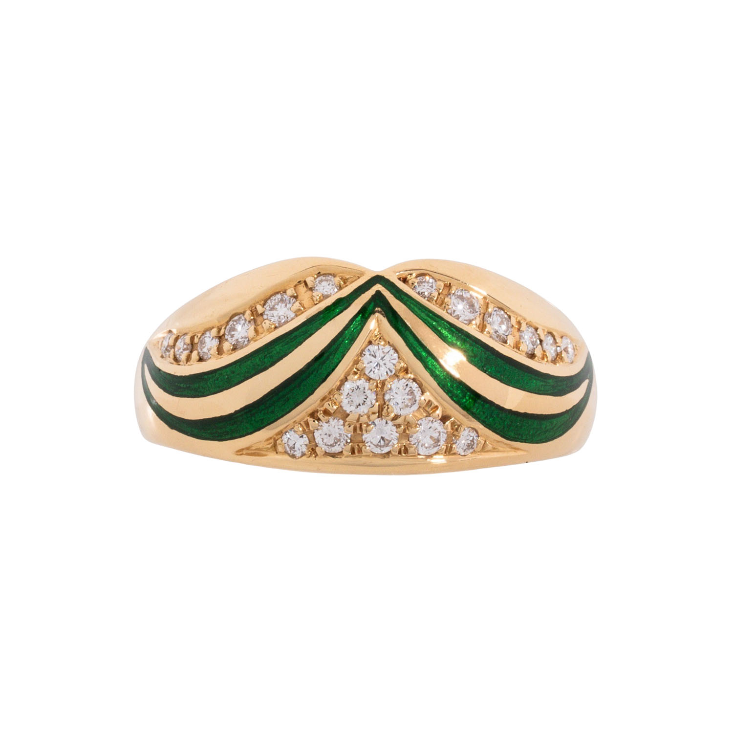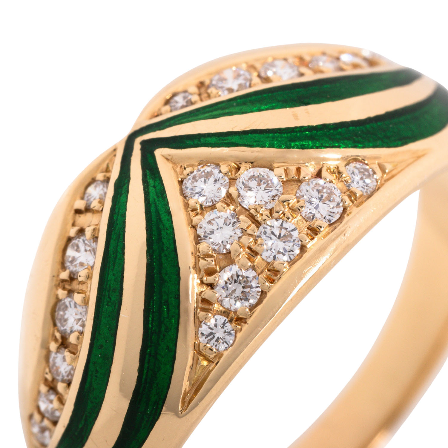 VICTOR MAYER ring with 20 brilliant cut diamonds, totalling ap. 0.30 ct, WHITE (H)/VS, transparent green enamel inlay, 18K yellow gold, 6.5 g, ring size 57, late 20th century, minimal signs of wear.
