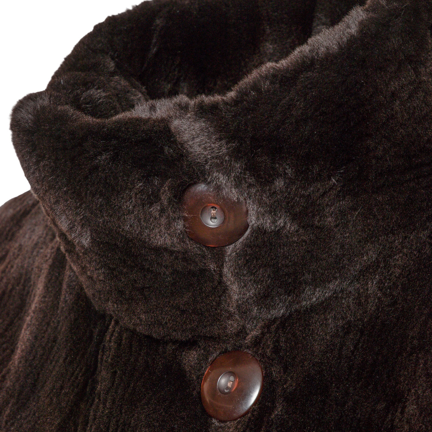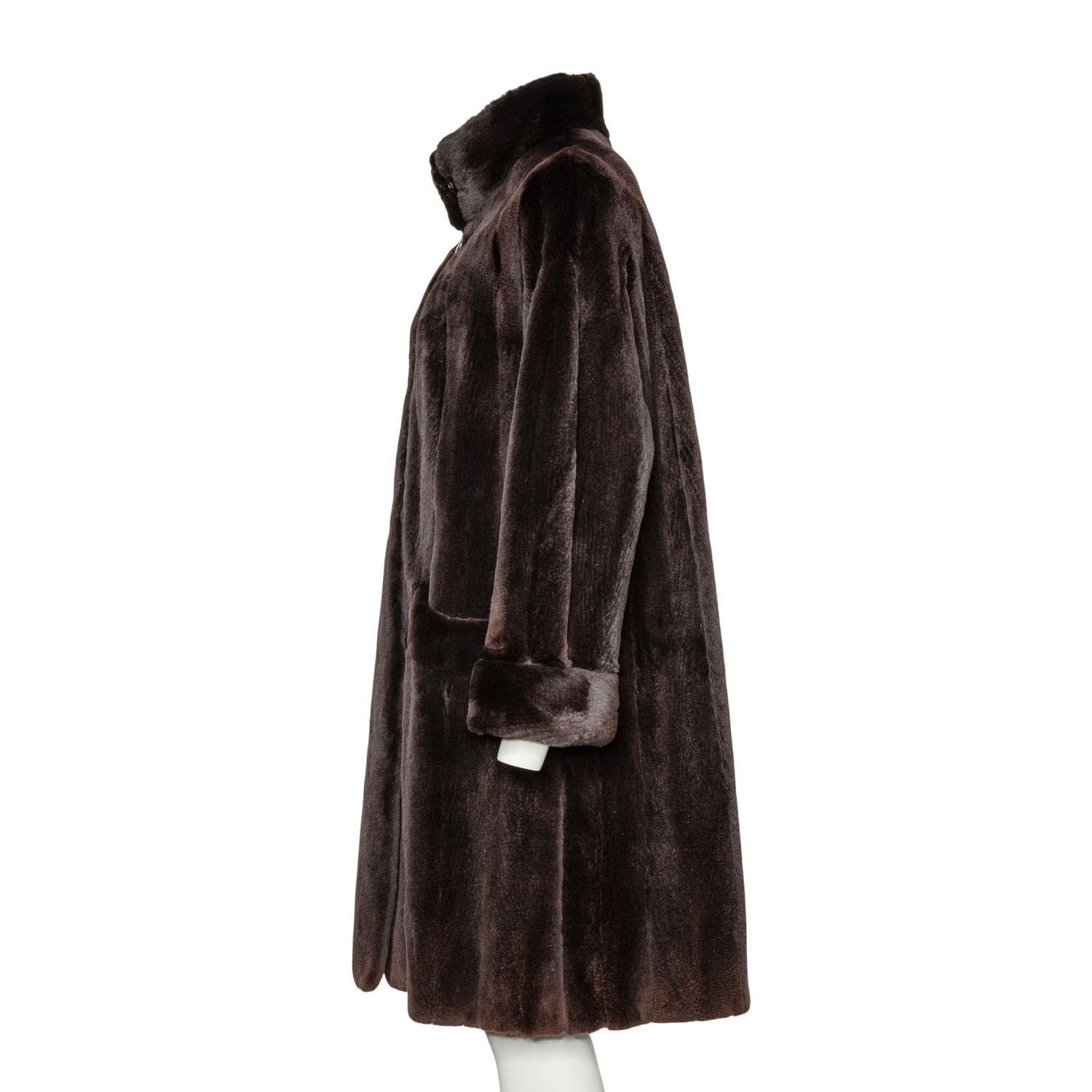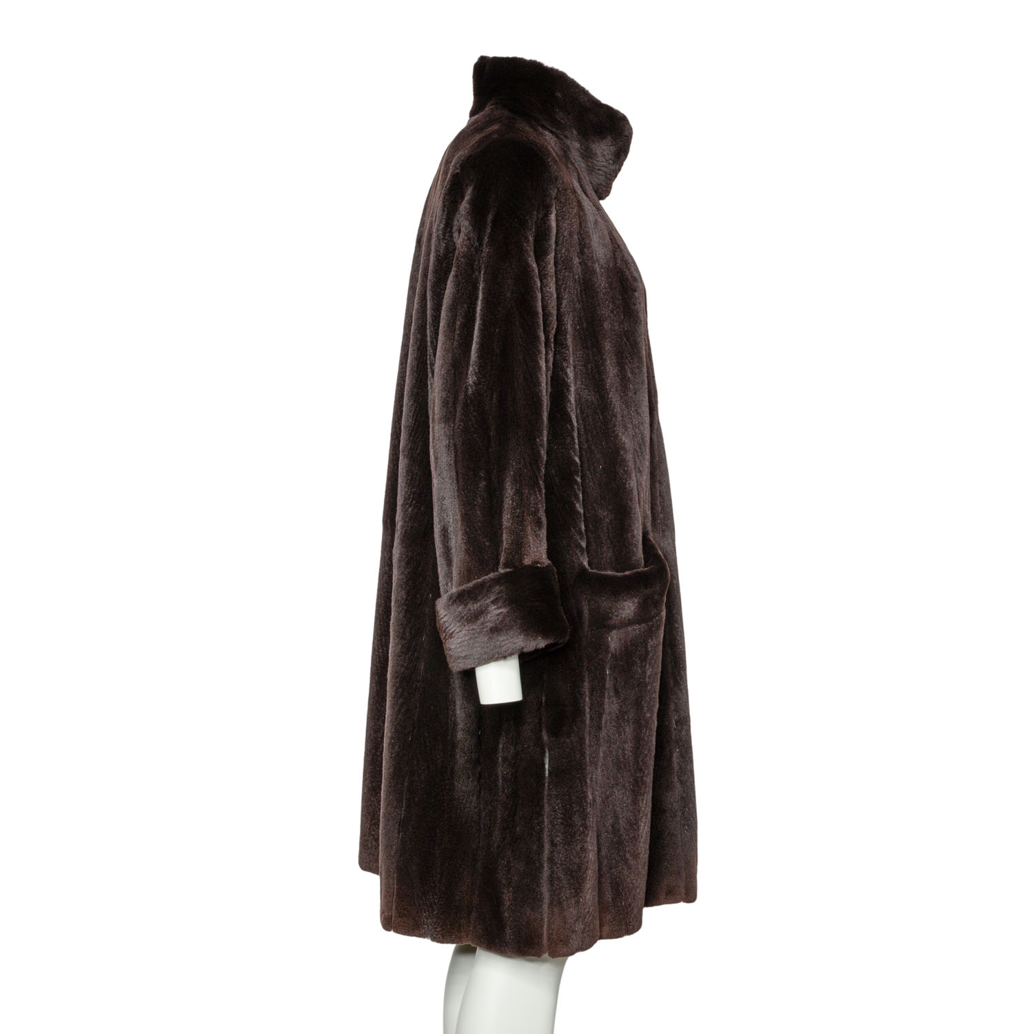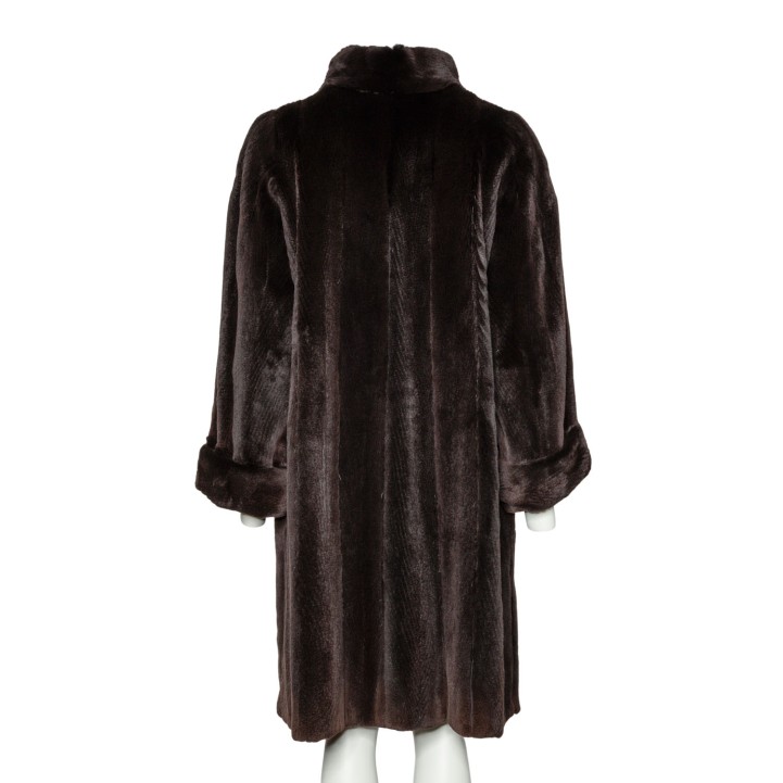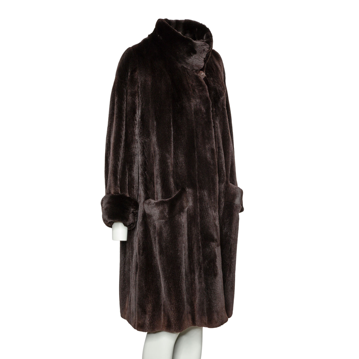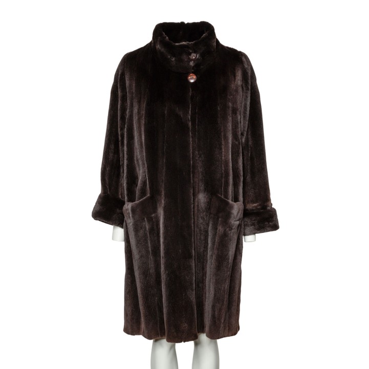 VINTAGE coat, size 38/40. Dark brown mink coat with stand-up collar, button fastening, slit pockets and slits at the hem.