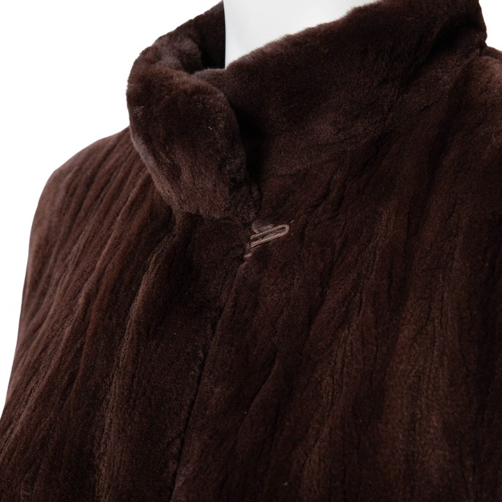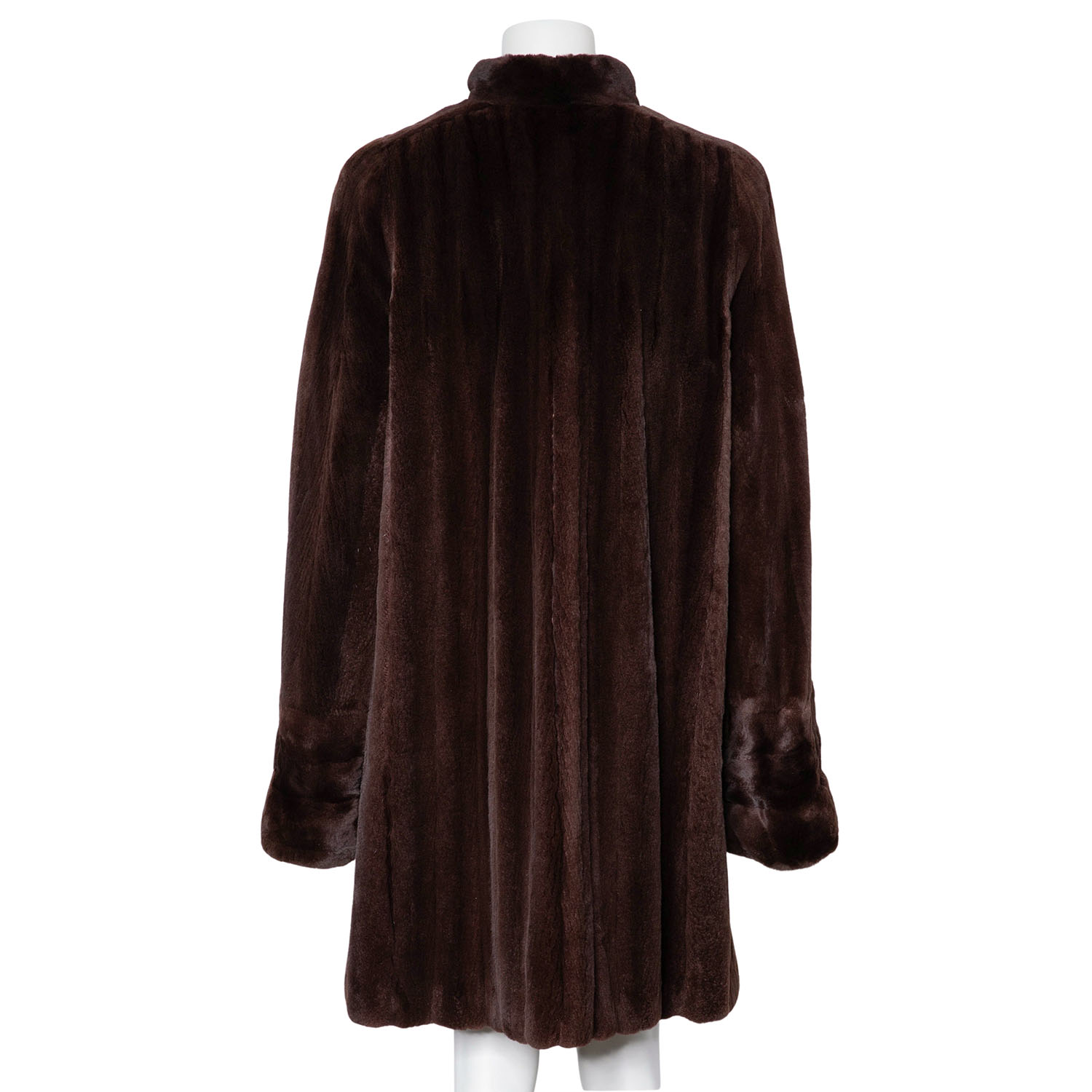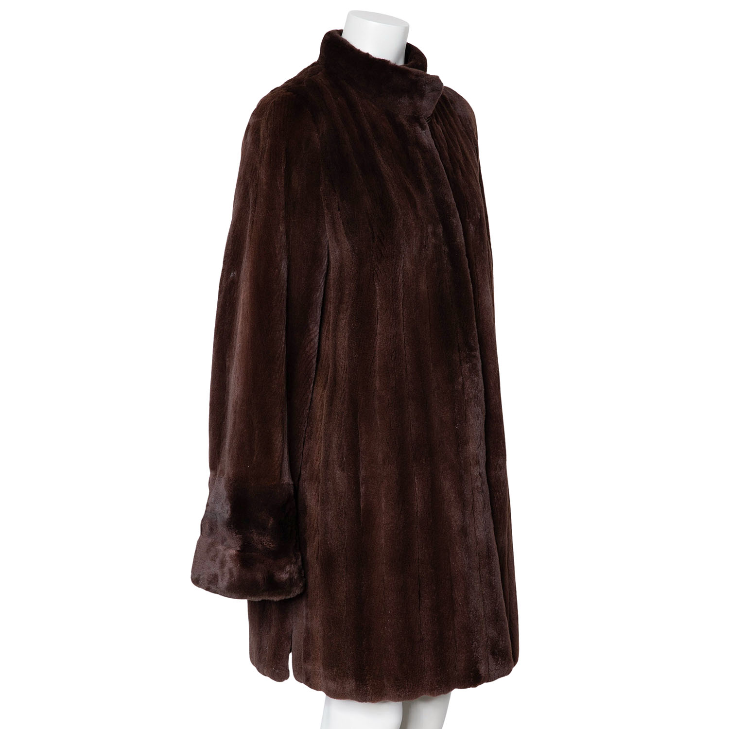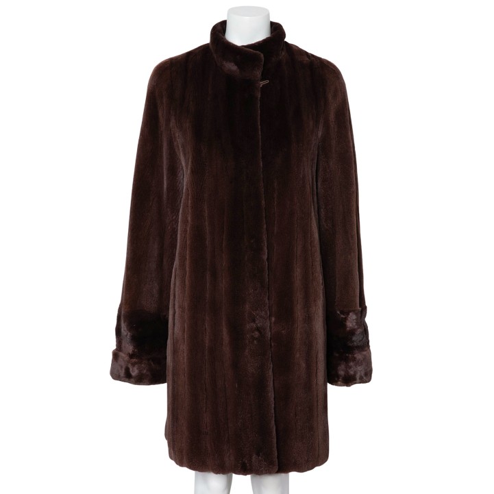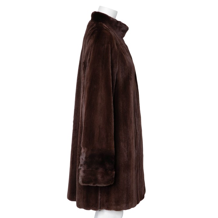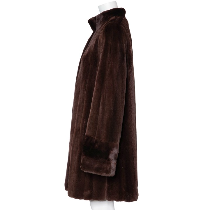 VINTAGE coat, size 40. Brown mink fur with cuffs, stand-up collar, hook-and-eye fastening and slit pockets. Signs of wear present.