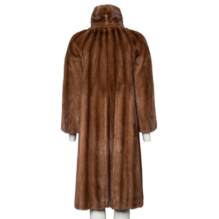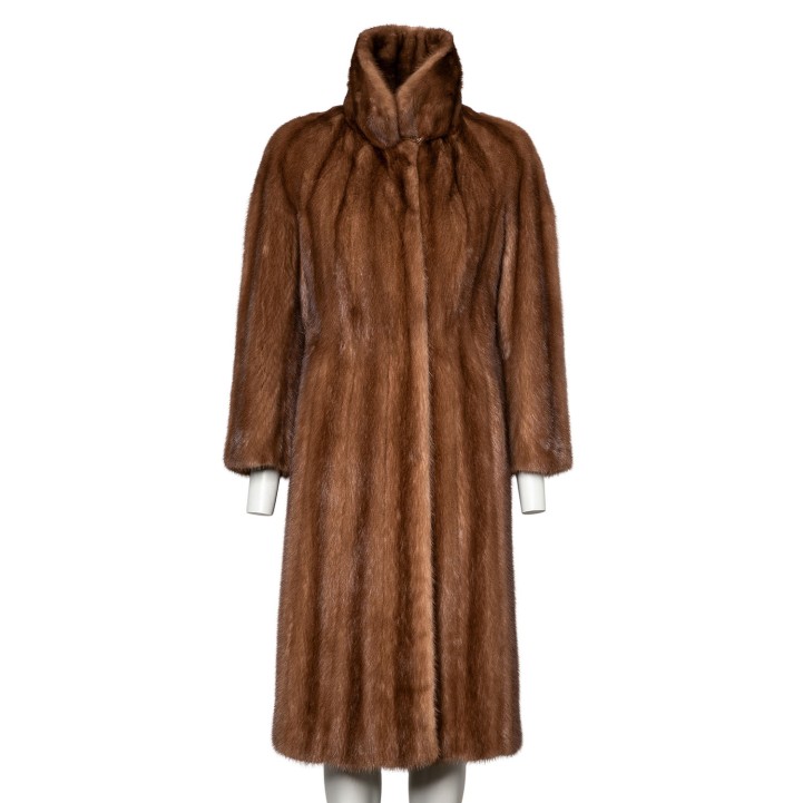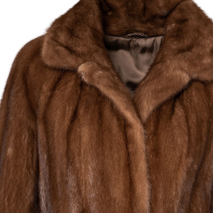 VINTAGE coat, size approx. 38. Light brown Saga mink fur with turn-down collar, slit pockets and hook-and-eye fastening. Signs of wear present.