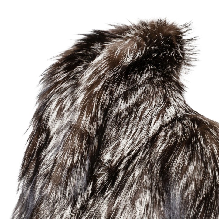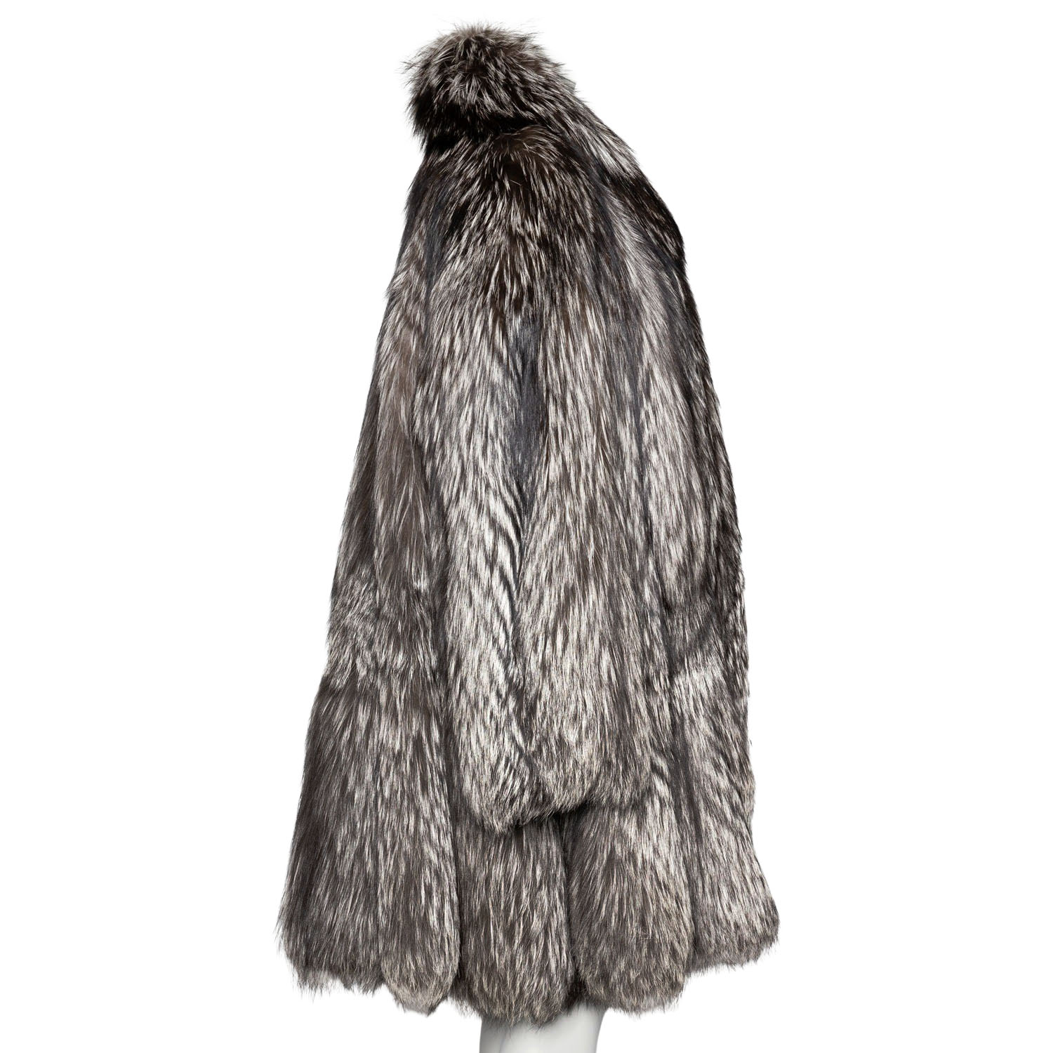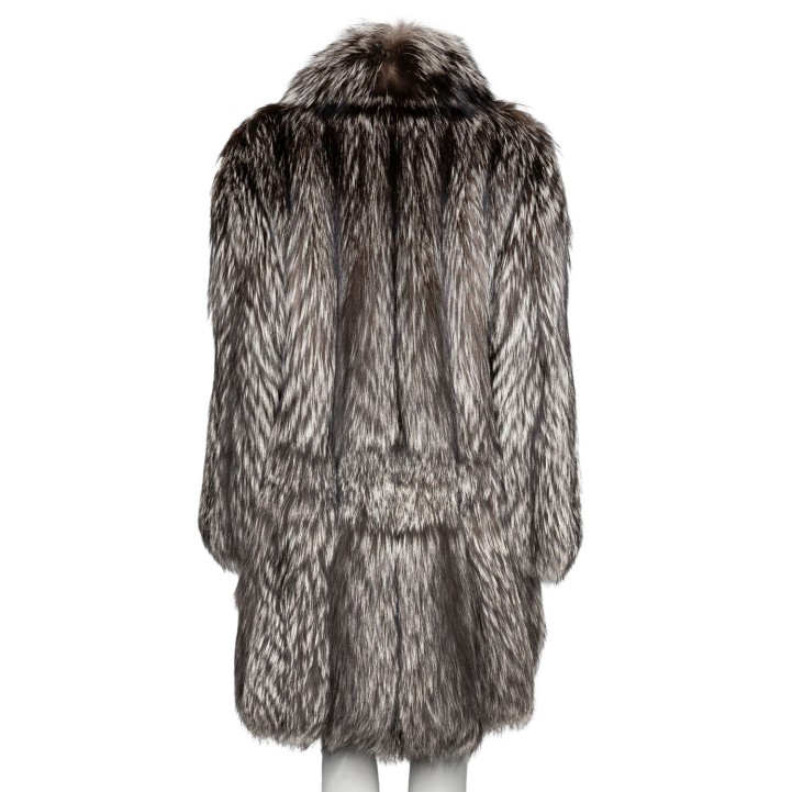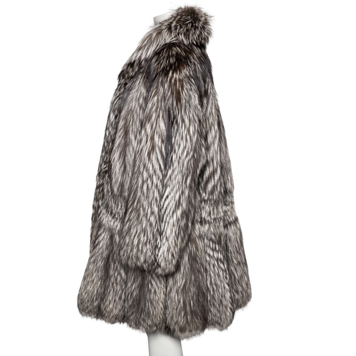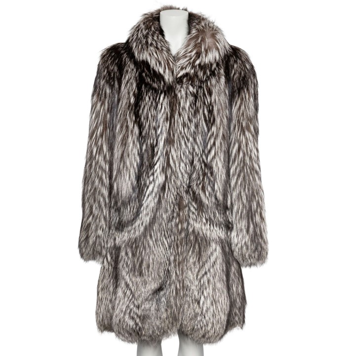 VINTAGE coat, size approx. 40. SAGA silver fox fur coat with lapel collar, hook and eyelet fastening, slit pockets, flounces at the hem. Signs of wear present.