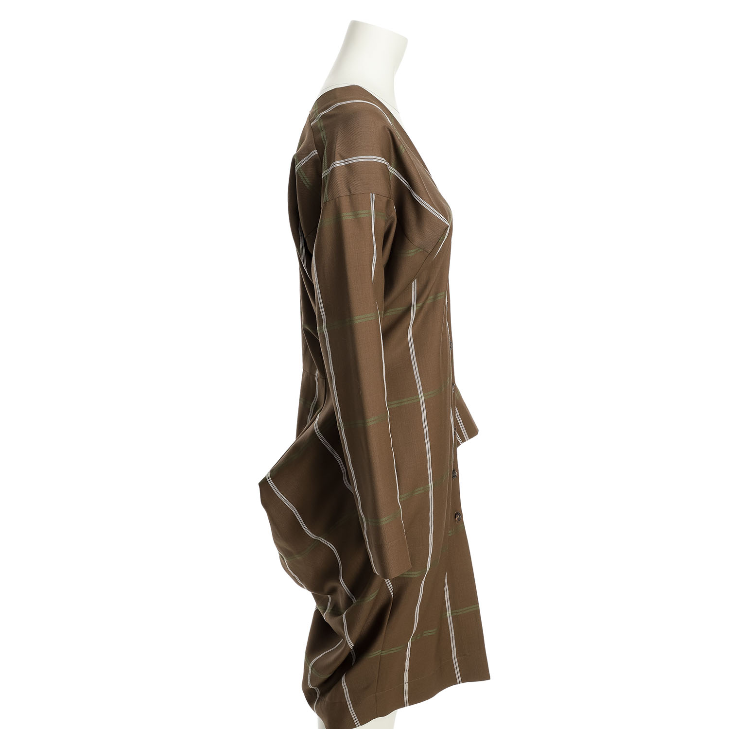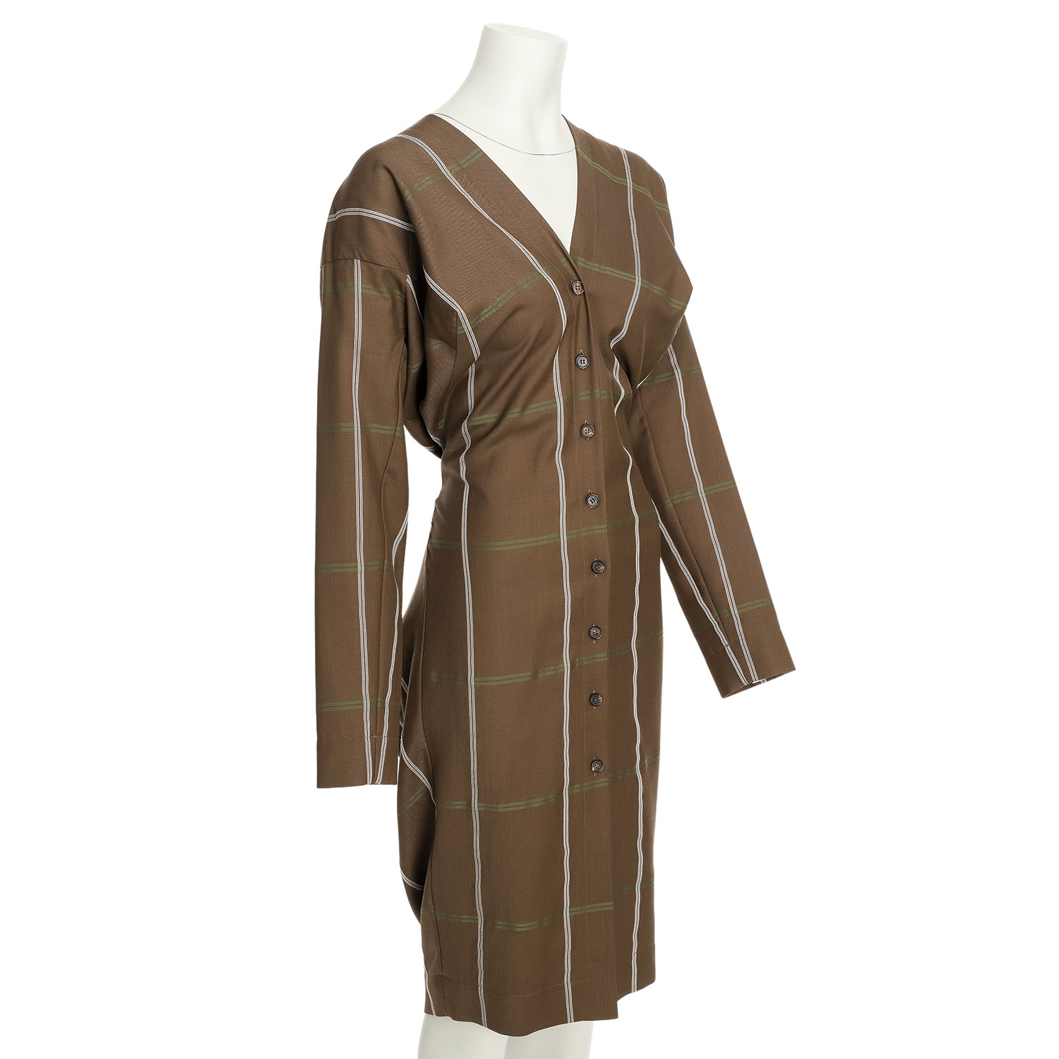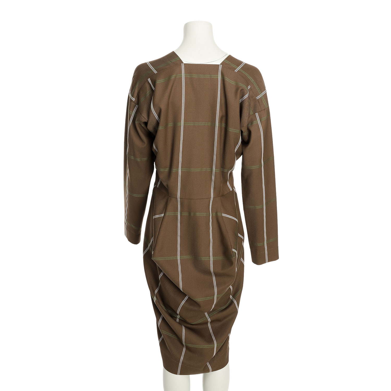 VIVIENNE WESTWOOD dress, size 40 (it. 46). Virgin wool. Khaki-coloured midi model with checked cognomen, button fastening and decorative cut. Good condition.