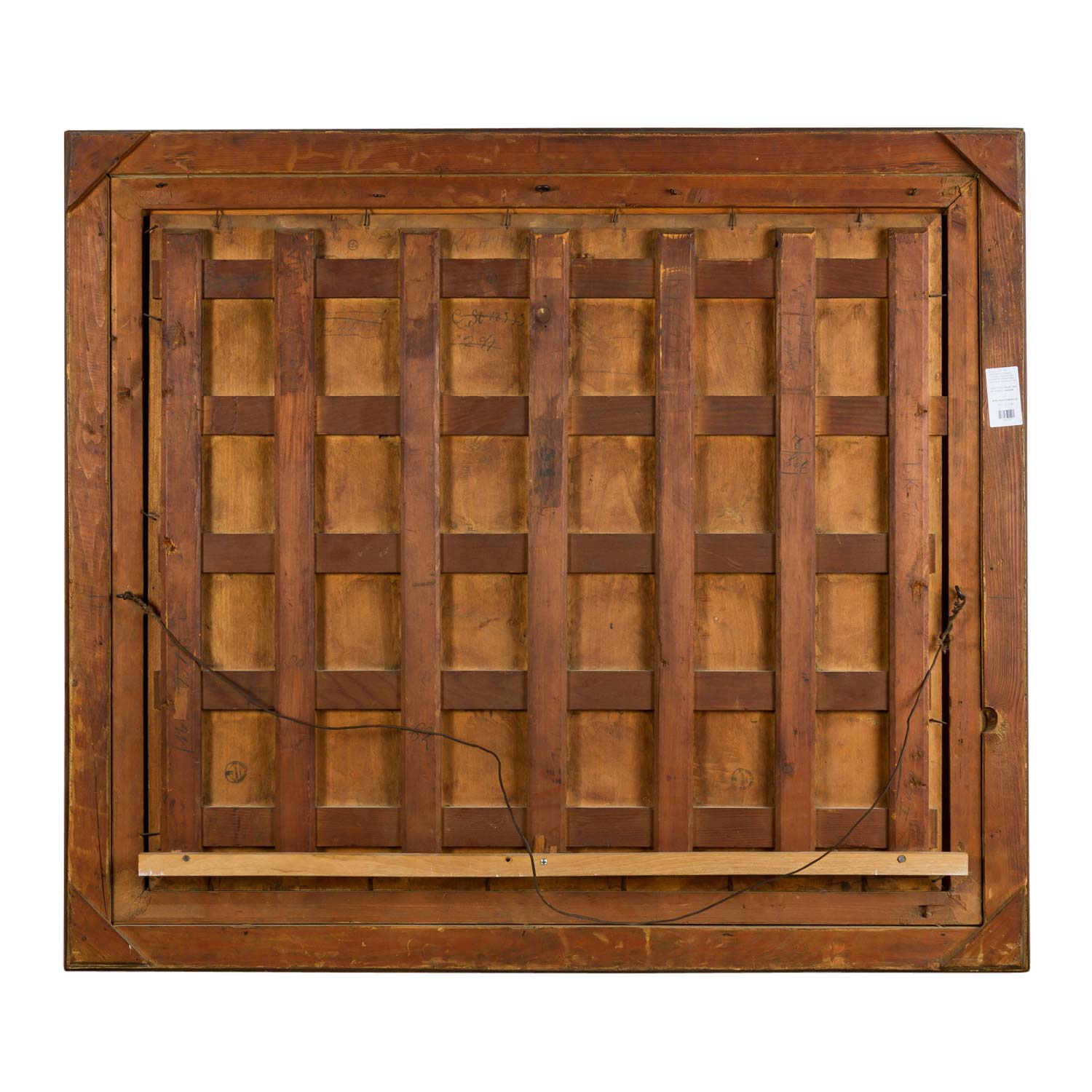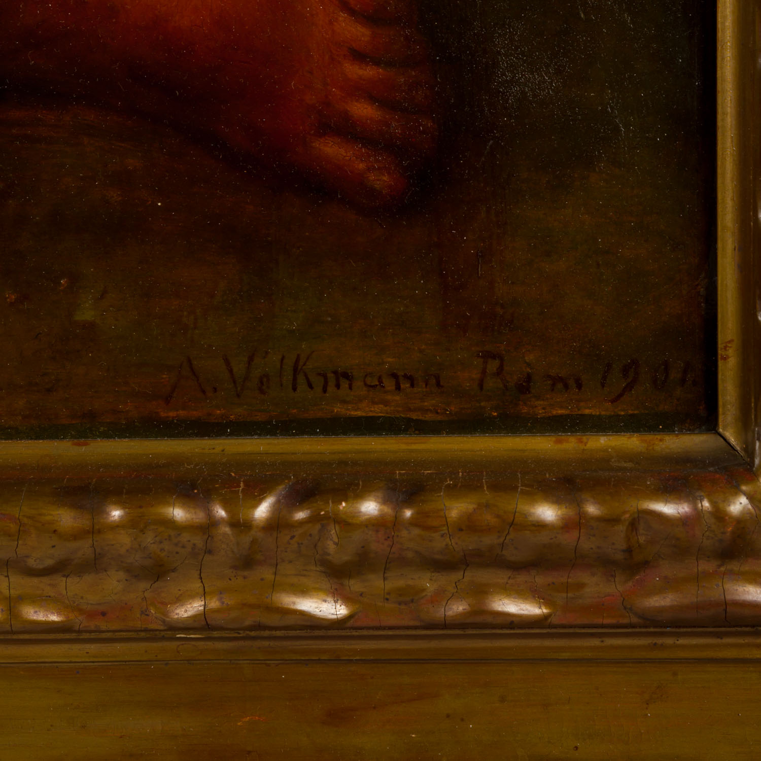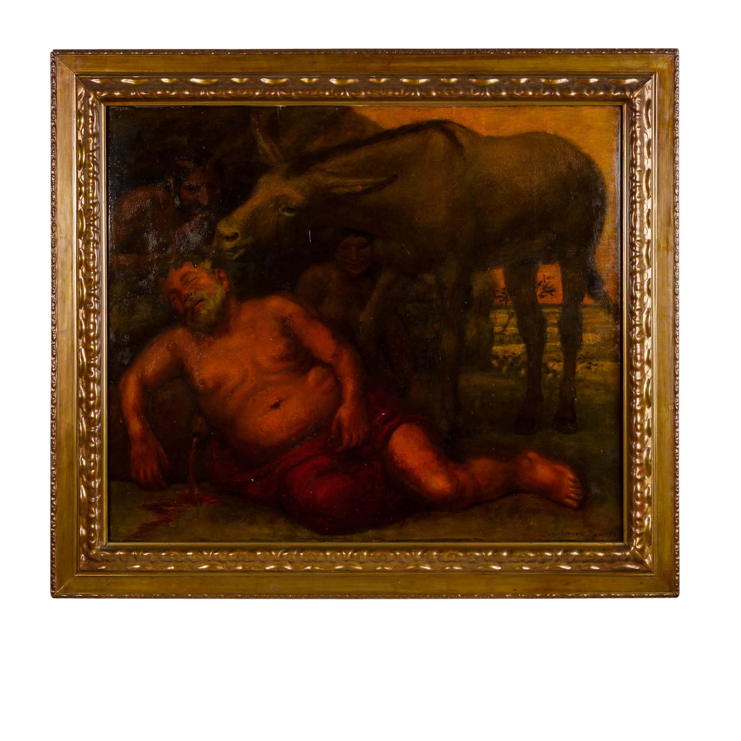 VOLKMANN, ARTHUR (Leipzig 1851-1941 Geislingen a.d. Steige), 'Drunken Bacchus', the sleeper is accompanied by a bacchante and a Silenus, a donkey tries to wake him, below right signed, inscribed and dated 'A. Volkmann, Rom 1901 ', oil / wood (parquet board), HxW: approx. 92x109 cm (117x132 cm with frame). Part. Craquelé, rubbed and flaked off paint, old restored and retouched, yellow varnish. With frame (partially slightly damaged).