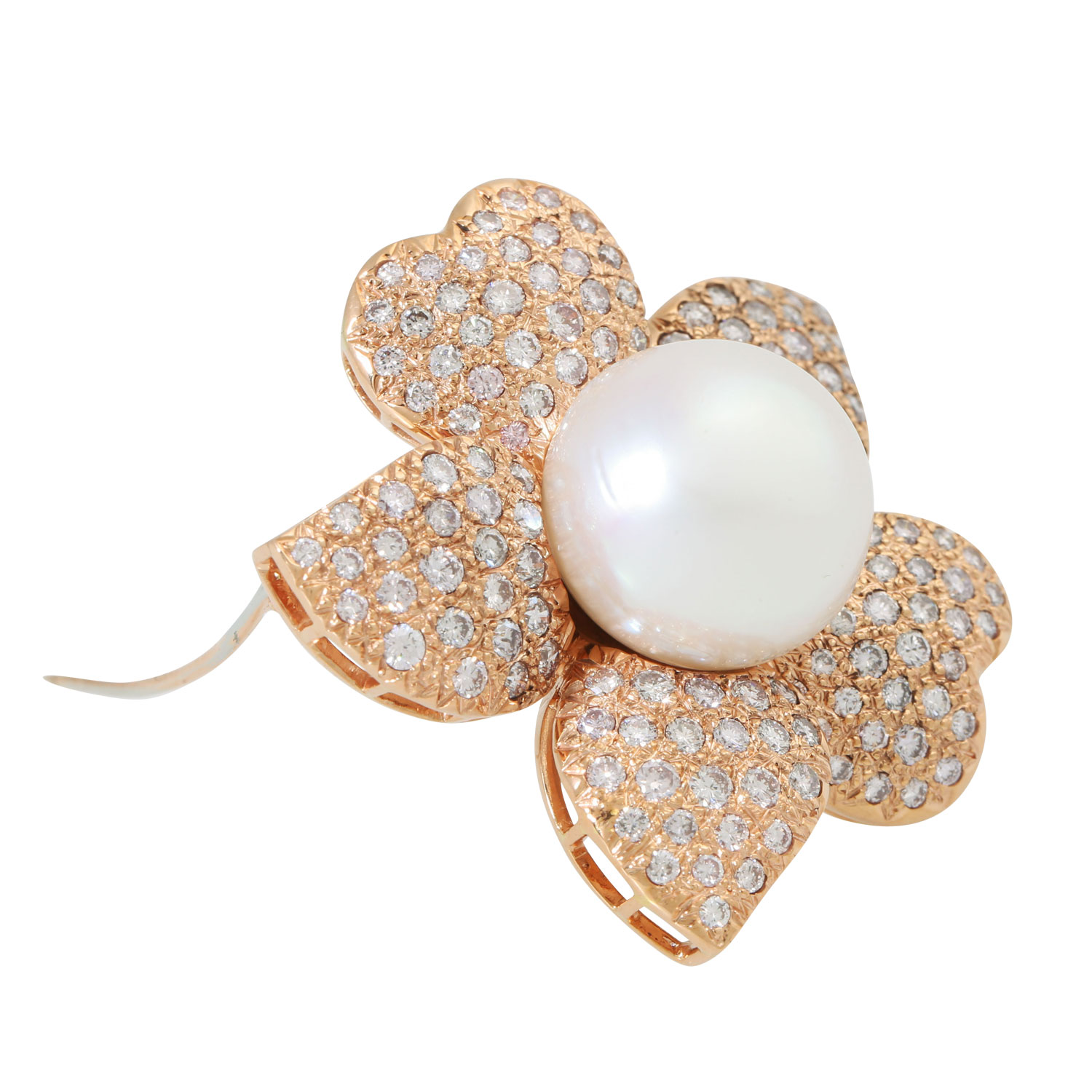 VON HOFEN Brooch 'Blossom' with South Sea cultured pearl and brilliant-cut diamonds totalling ca. 3.06 ct pink/VSI according to von Hofen certificate, RSG 18K, 21.5g, D: ca. 40mm, replacement value: 29.400 €, 21st century, good condition, Von Hofen warranty card from 04/2017 enclosed.
