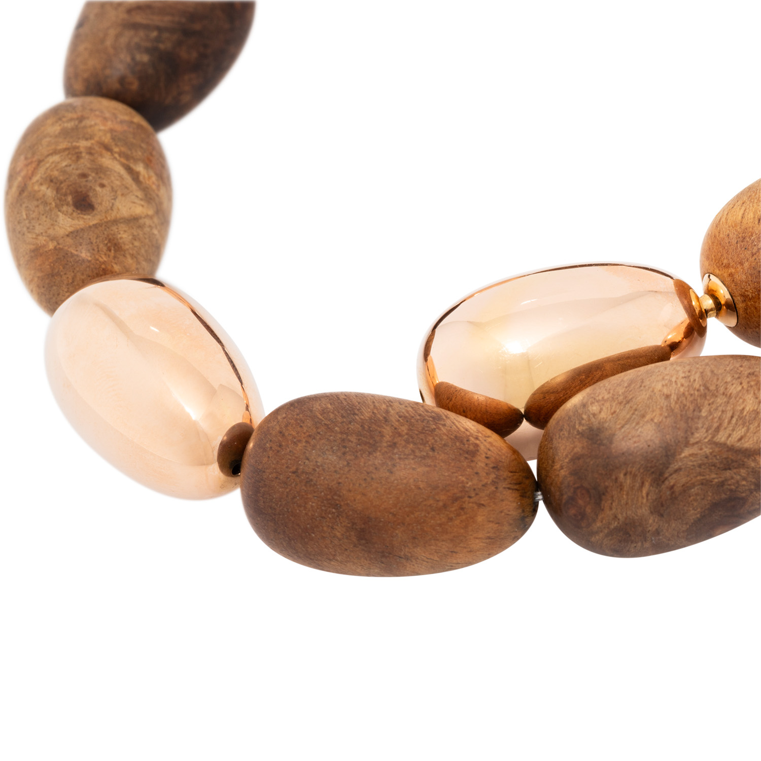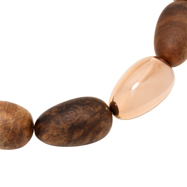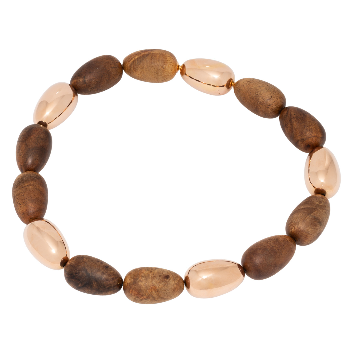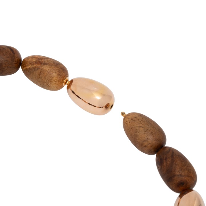 Necklace of olive shaped nut wood and 18K rose gold, 2.9x1.8 cm each, 1 part crafted as bayonet changing clasp, L: 44 cm, 70.3 g, PP (2013): ca. 7,400 €, 21st century, good condition, marked 'MZ', nice craftsmanship.
