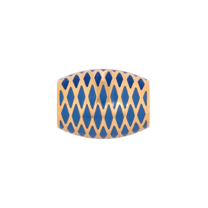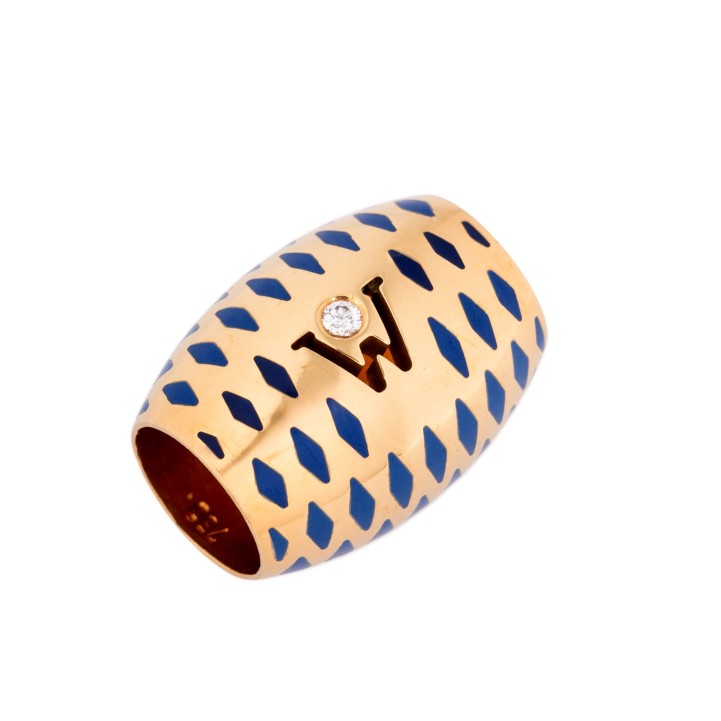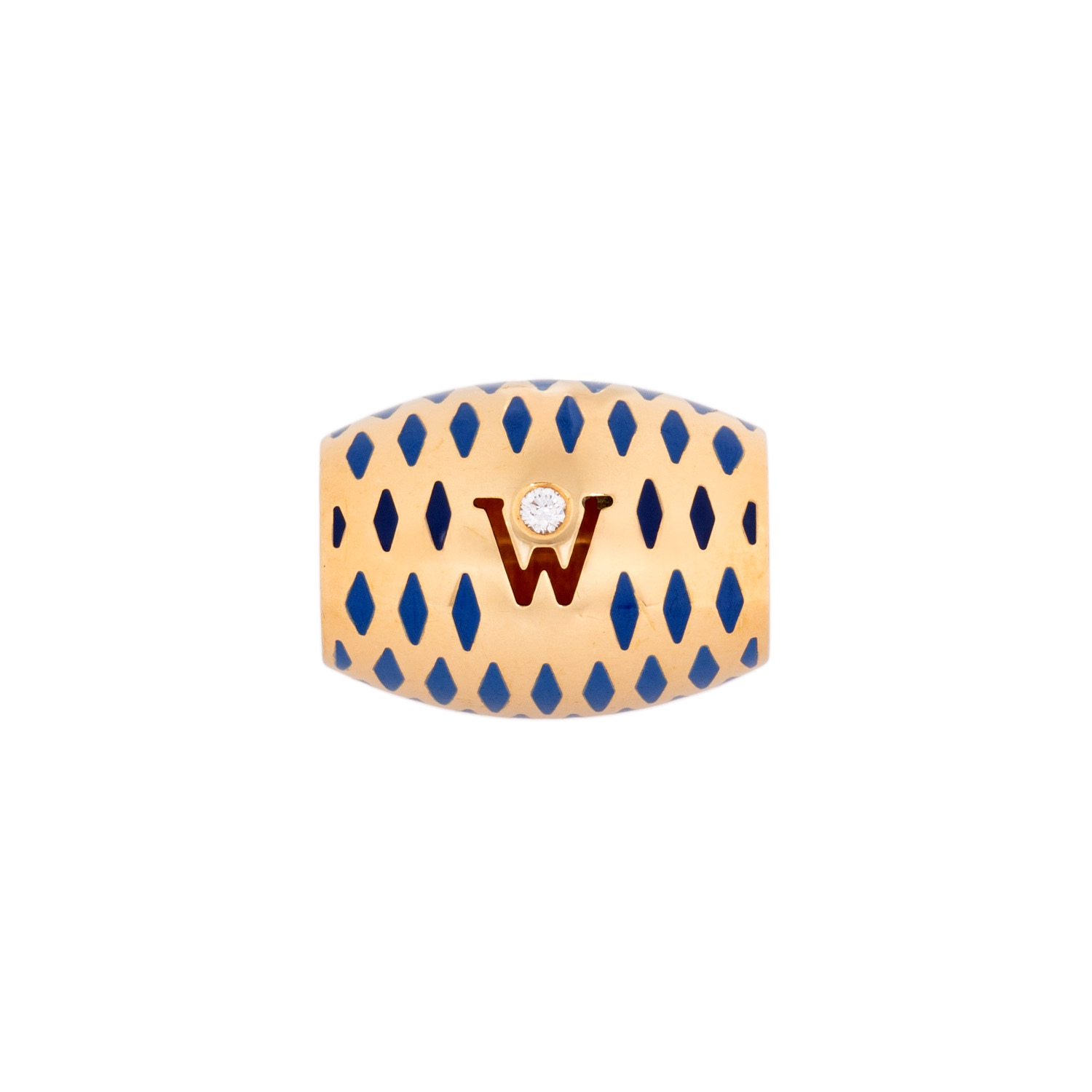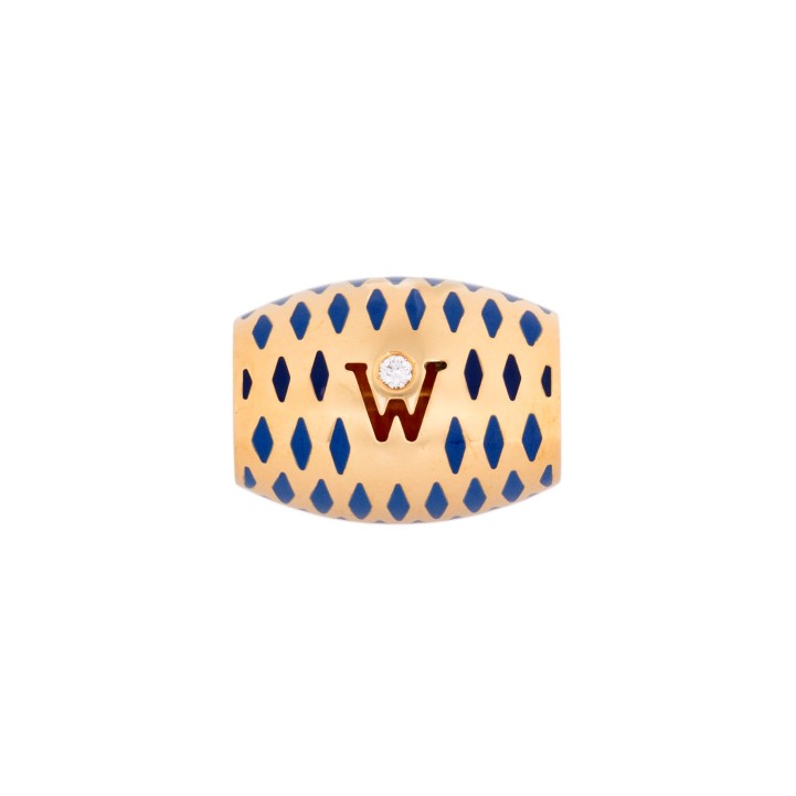 WELLENDORFF ronde with blue-opak enamel and small brilliant-cut diamond in the Logo-'W', current NP (2025): ca. 6.000 €, 18K yellow gold, 9.8 g, L: 15 mm, 21st century, minor signs of wear.