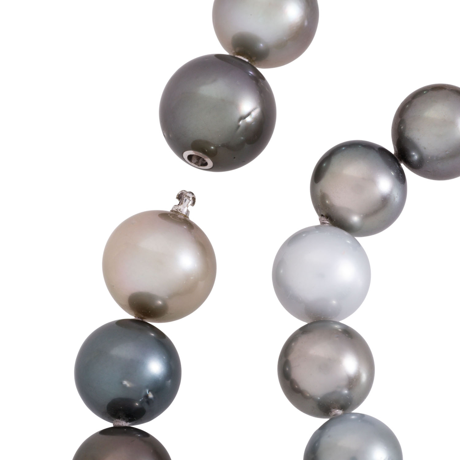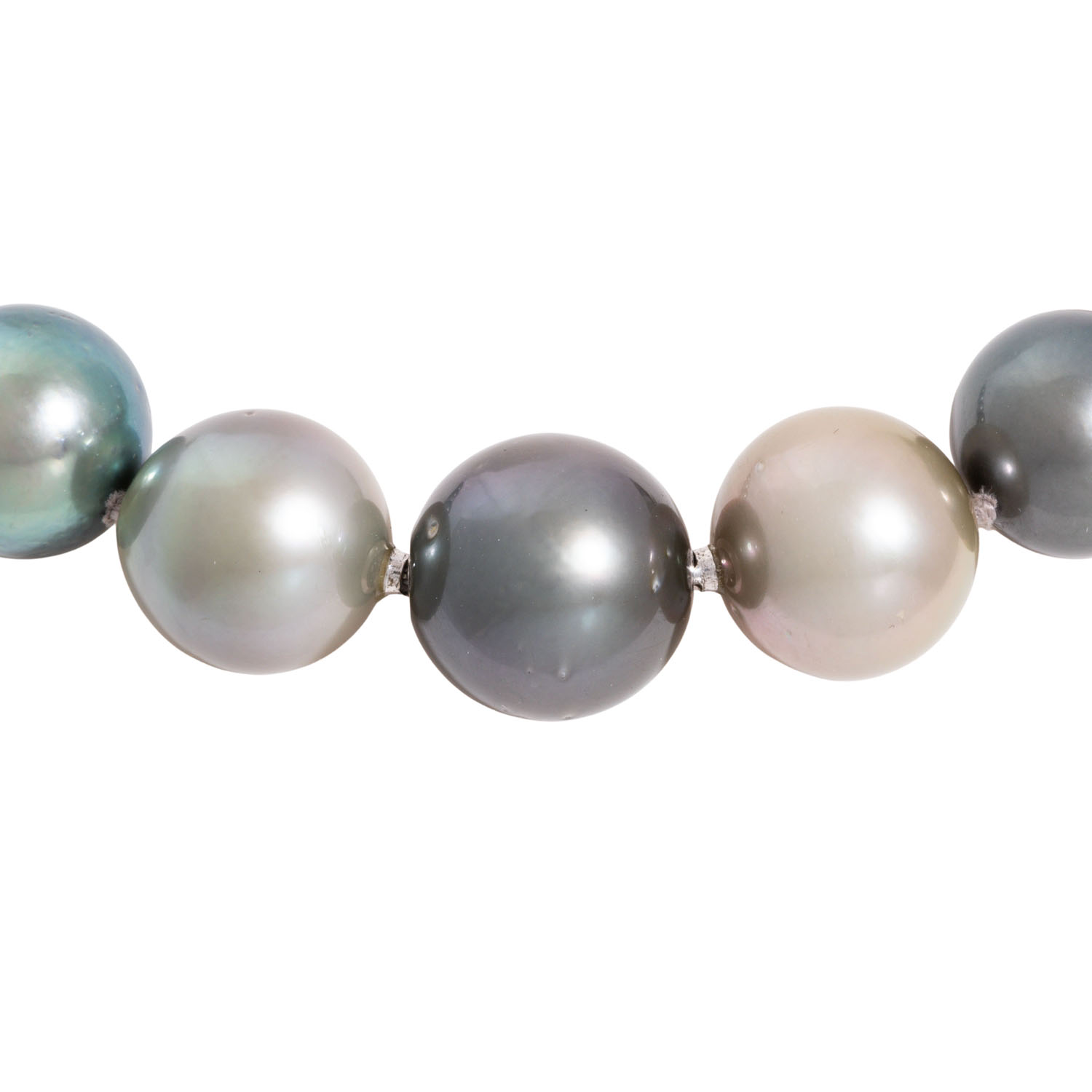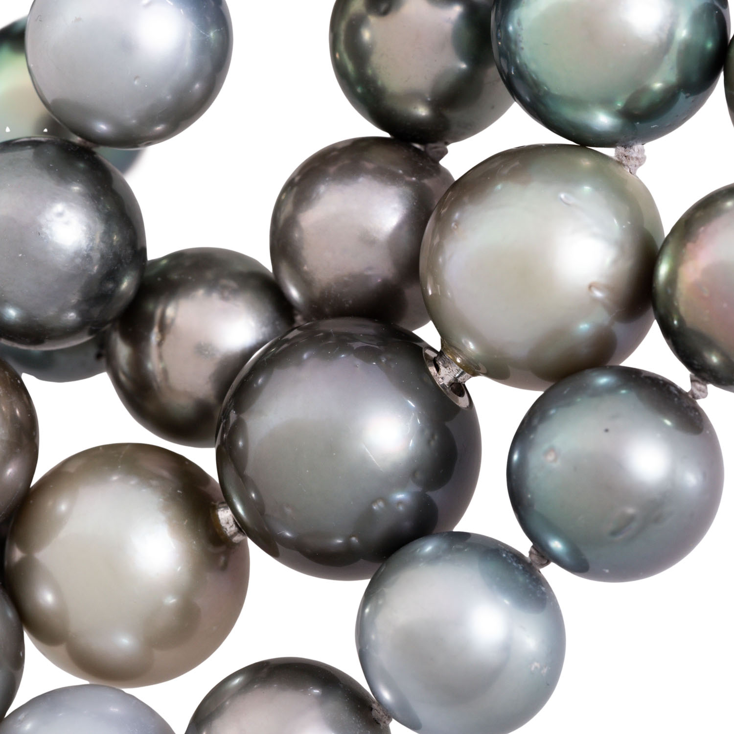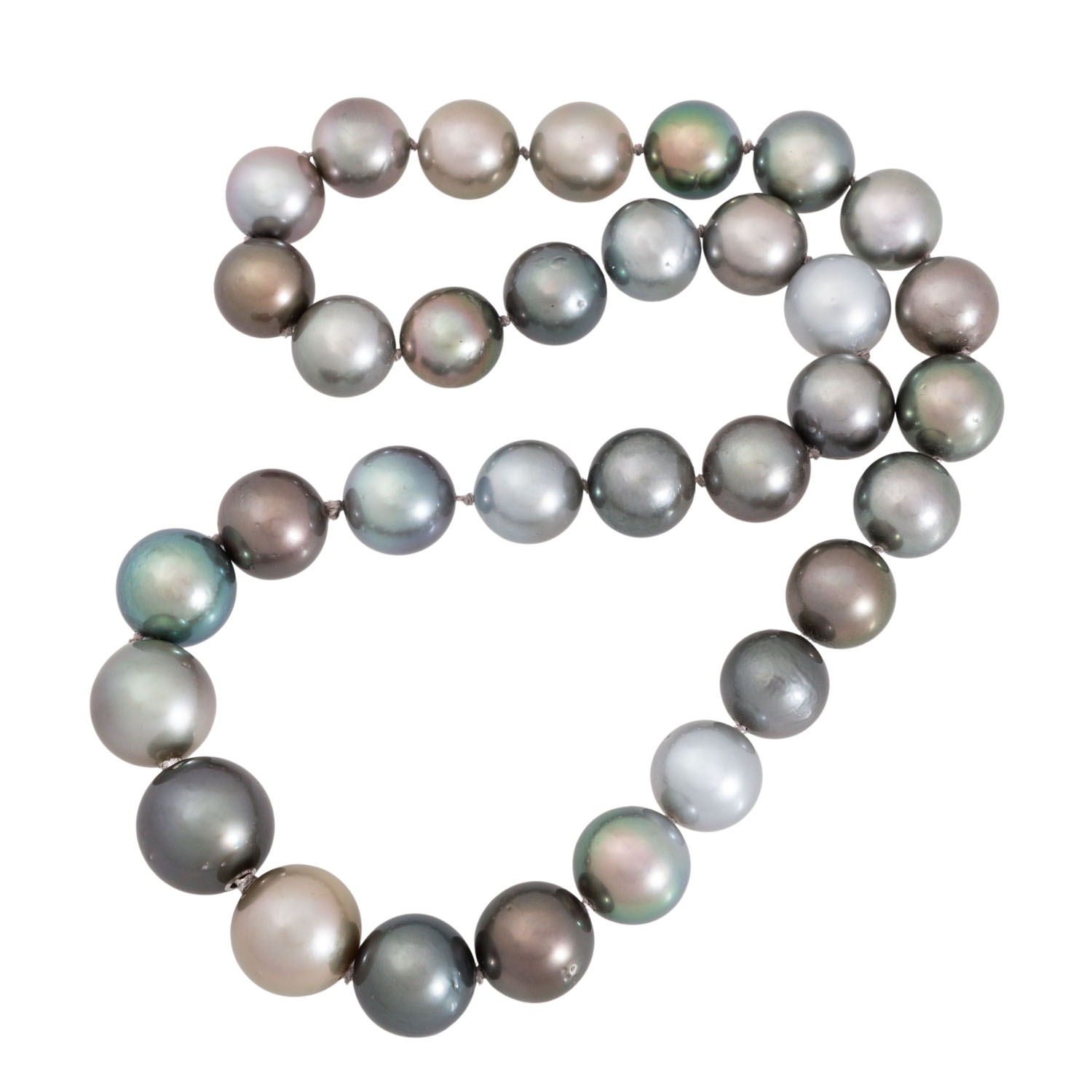 WEMPE necklace of 33 Tahitian cultured pearls graduating from 12.2 to 15.5 mm, replacement value (2025): ca. 6.000 €, pearls in different colours, bayonet clasp in largest pearl, 18K white gold, L: 45 cm, purchase in 2018, minor signs of wear, WEMPE certificate included.