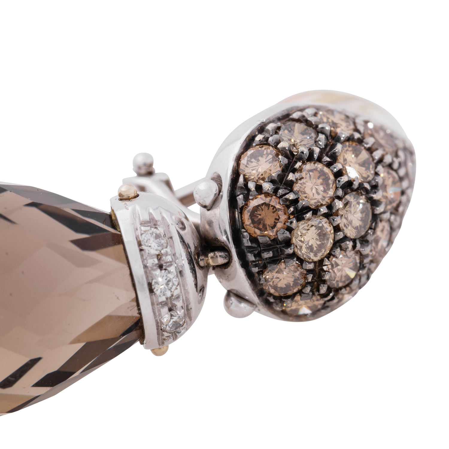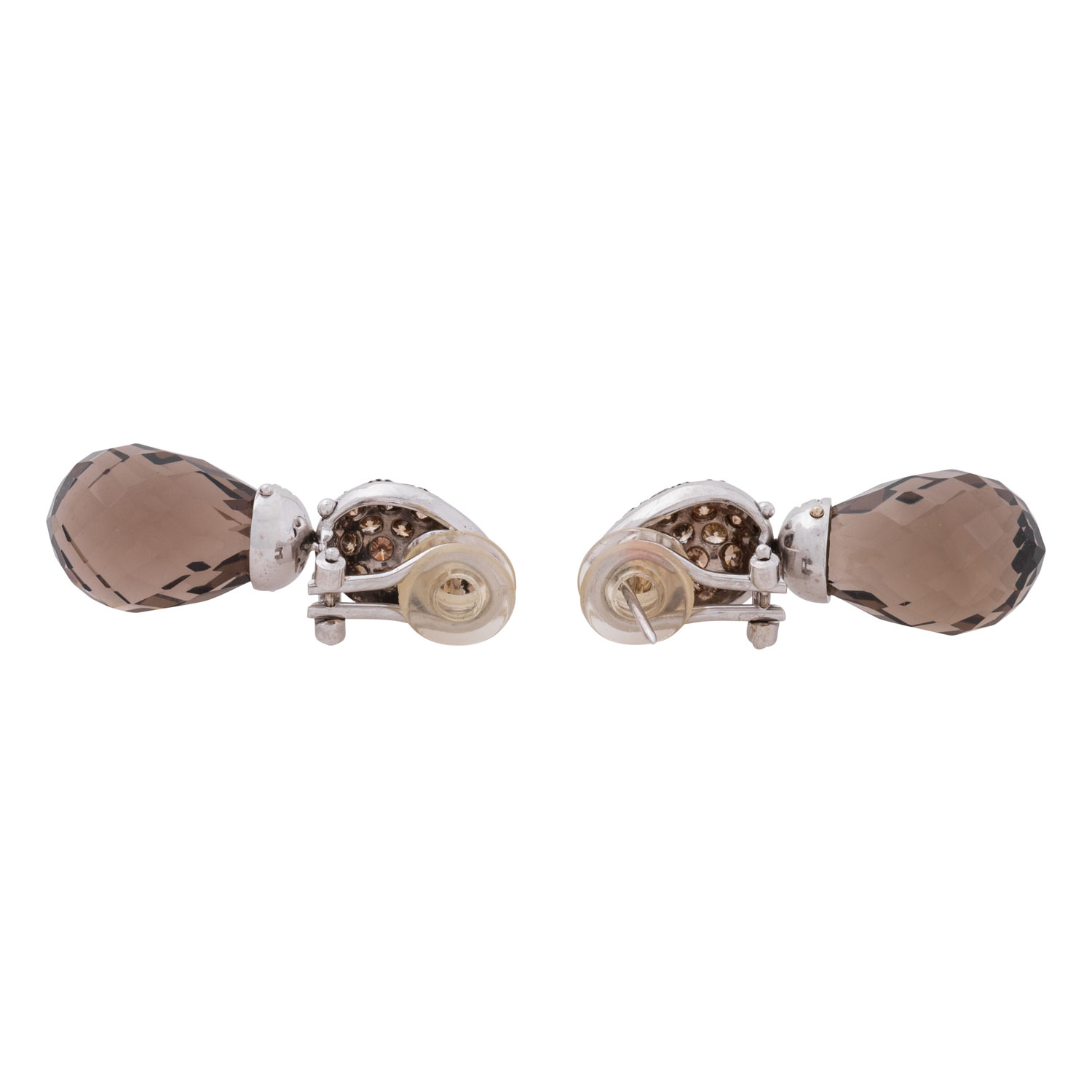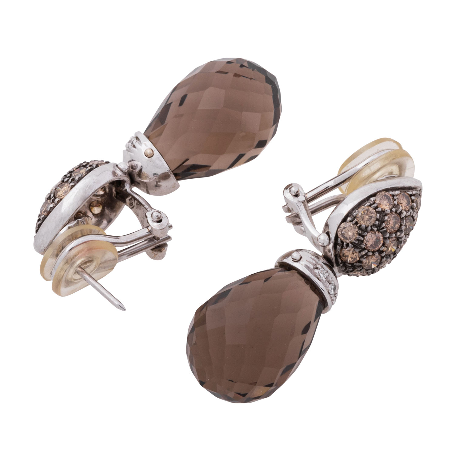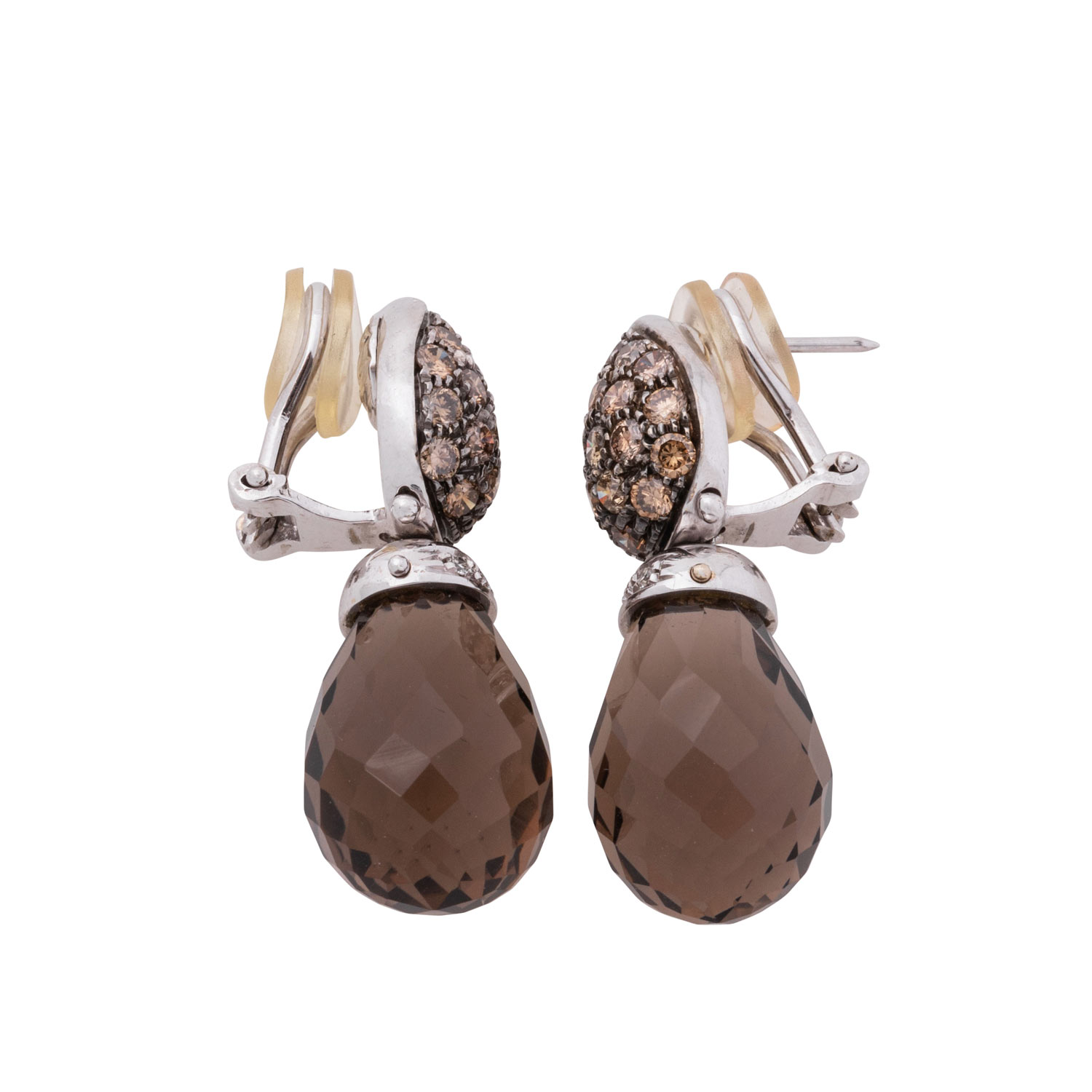 WEMPE pair of ear hangers with smoky quartzes and brown brilliant-cut diamonds totalling ca. 1.4 ct as well as colourless brilliants totalling 0.06 ct, 18K WG, 16.1 gr, L: ca. 3.5 cm, 21st century, minor signs of wear, with maker's mark, incl. Wempe sales receipt (2003). Ear clips with pins.