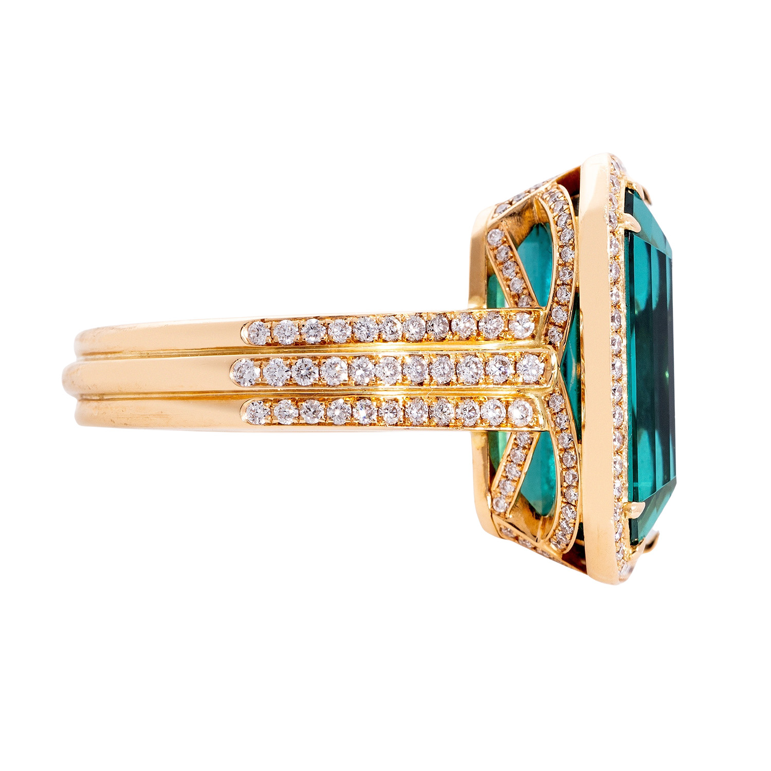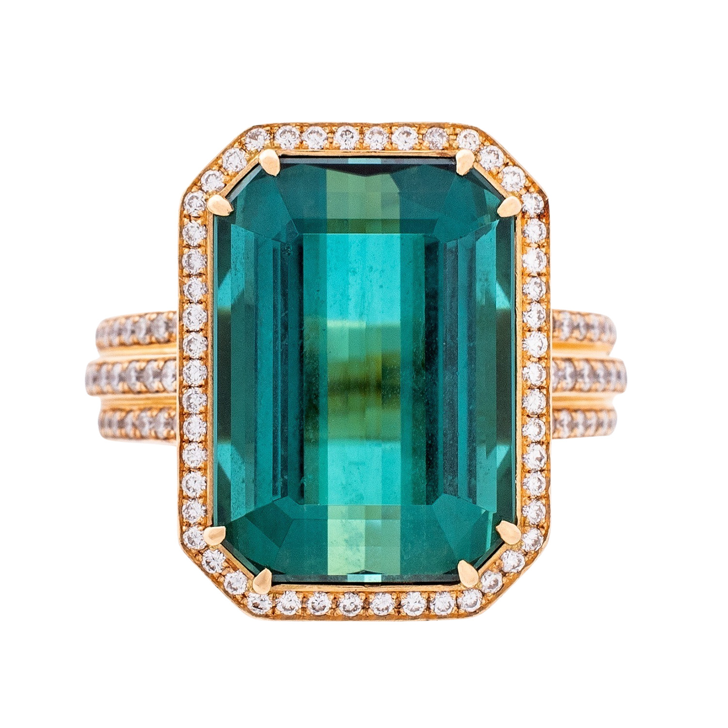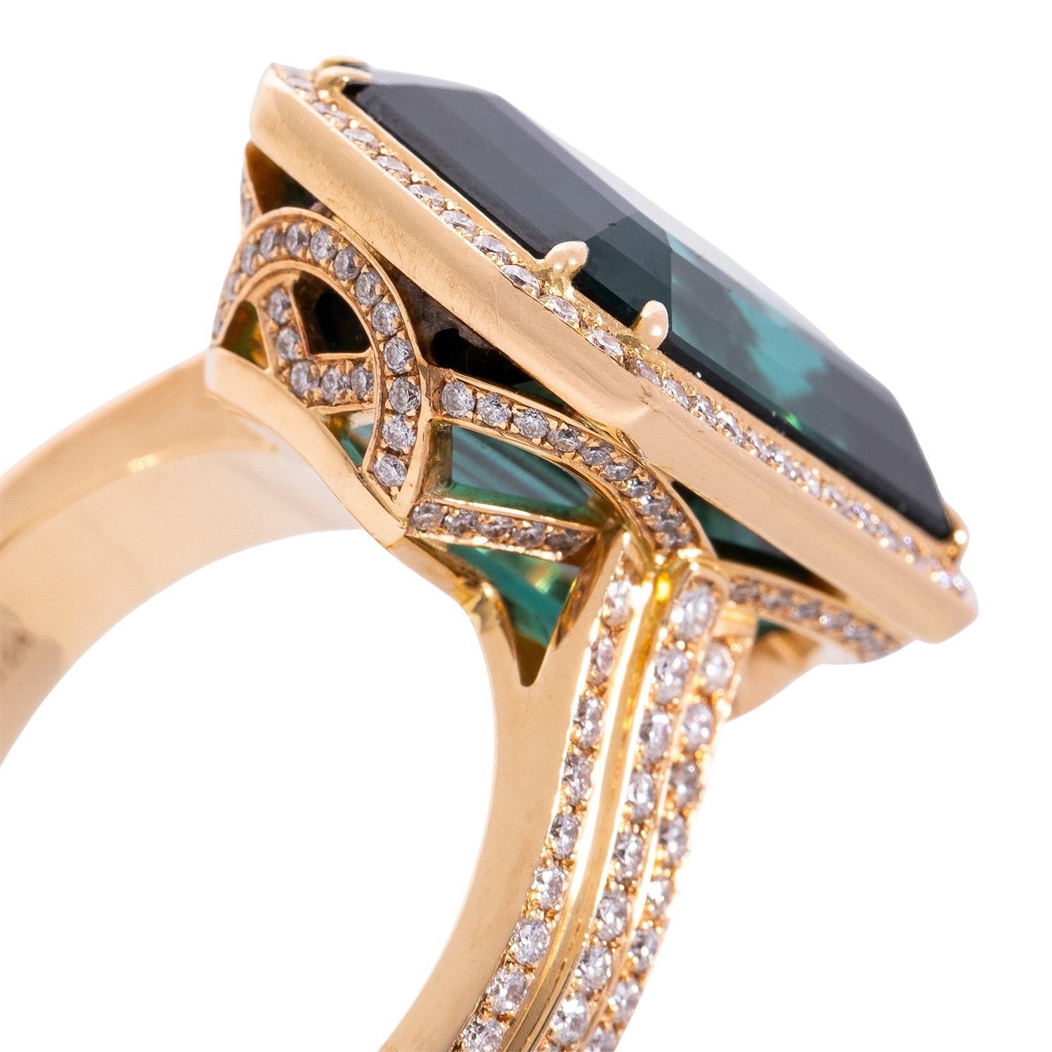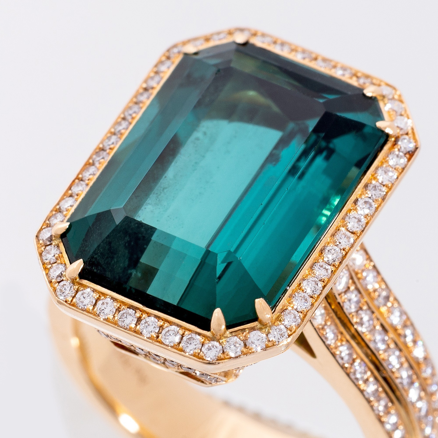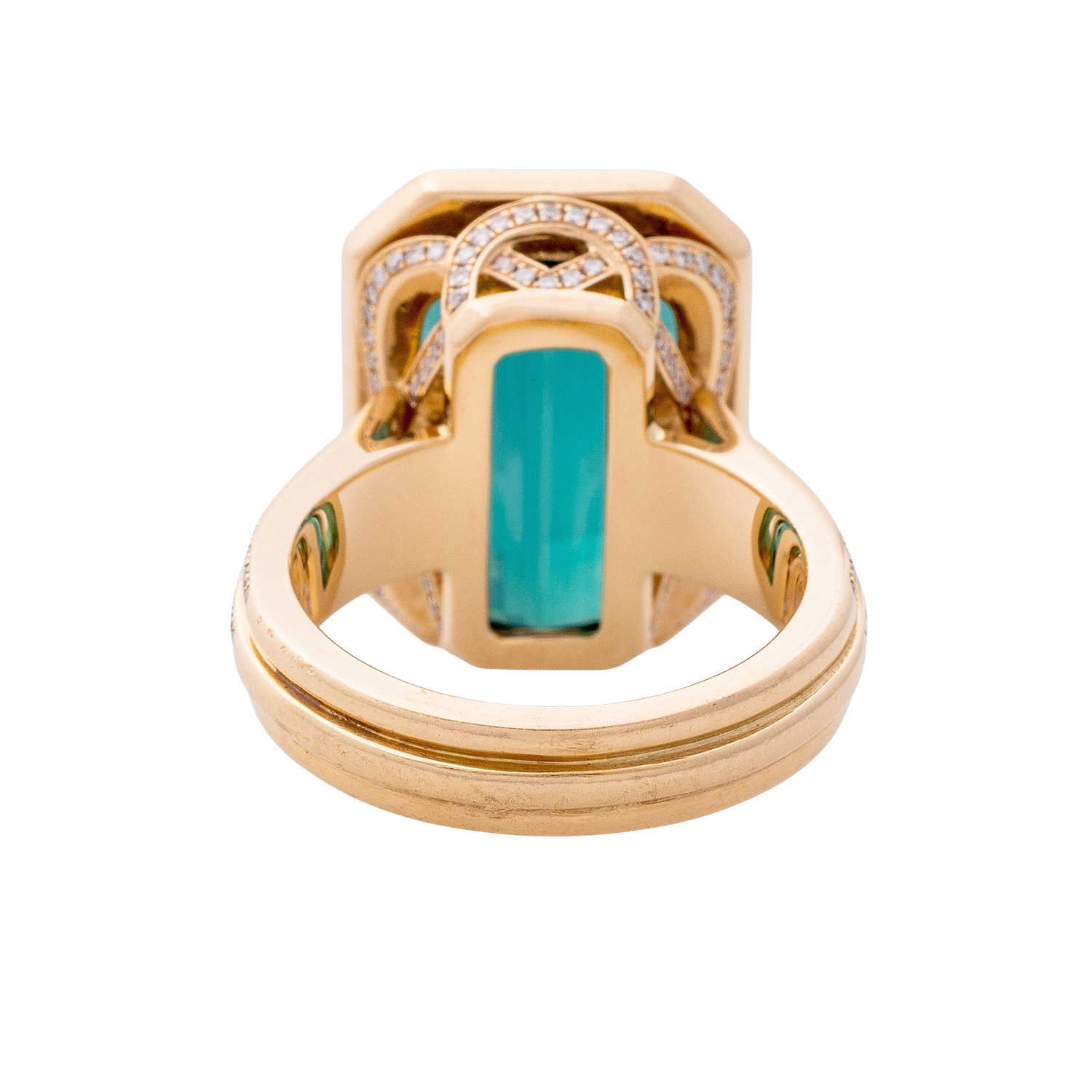 WEMPE ring 'Opulence' by Wempe Statements with fine tourmaline ca. 14,85 ct, beautiful blue-green, minimal chipped and 212 brilliant-cut diamonds totalling ca. 0.97 ct, ca. RW (G)/VS, PP (2019): 29,575 €, 18K rose gold, 16.3 g, ring size 56, purchase in 2019, signs of wear, including WEMPE certificate and sales receipt.