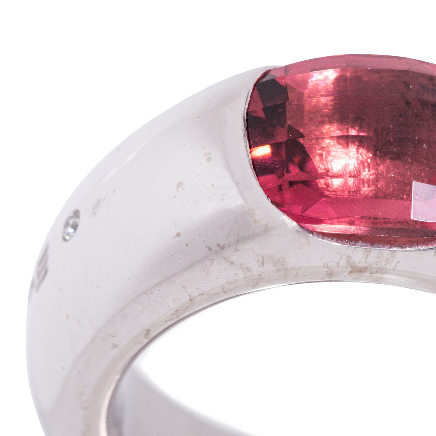 WEMPE ring with pink antique cushion-cut tourmaline, min. chipped and small brilliant-cut diamond at WEMPE signature at the side of ring shank, 18K white gold, 22.1 g, ring size 51, early 21st century, signs of wear.