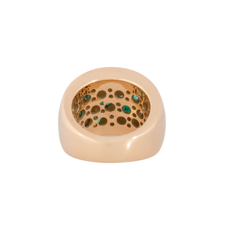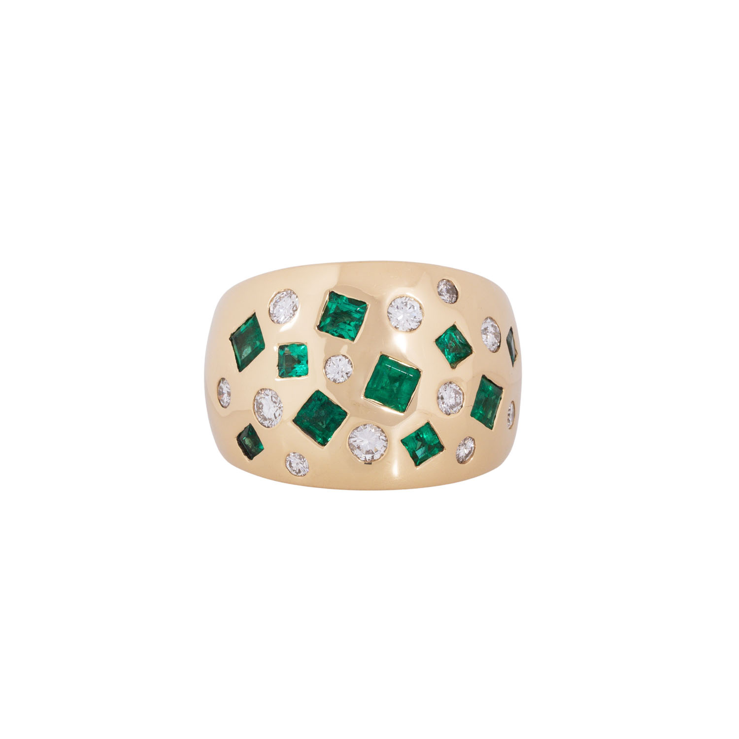 Wide band ring with 10 emeralds and 12 brilliant-cut diamonds,