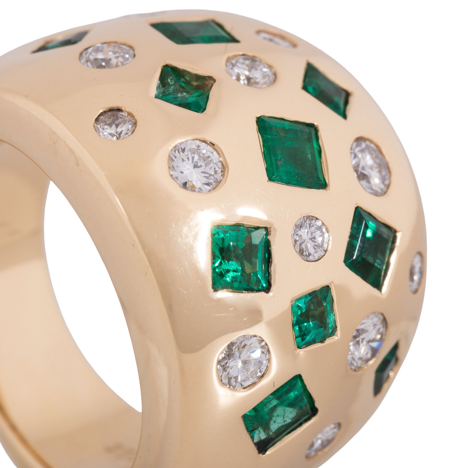 Ring with 12 brilliant-cut diamonds totalling ca. 0.34 ct, ca. WHITE (H)/VS and 10 carré-cut emeralds, slightly abraded and with signs of growth, 1x distinct chipped, 18K yellow gold, 29.5 g, ring size 54, late 20th century, minor signs of wear, solid workmanship.
