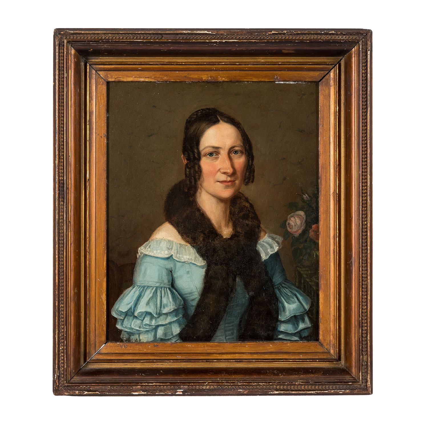 Oil on metal, the portrait of the lady is signed, HxW: 41/34 cm. Some losses of colour at the margins, as well as colour retouching. Frame, HxW: 56/47 cm.