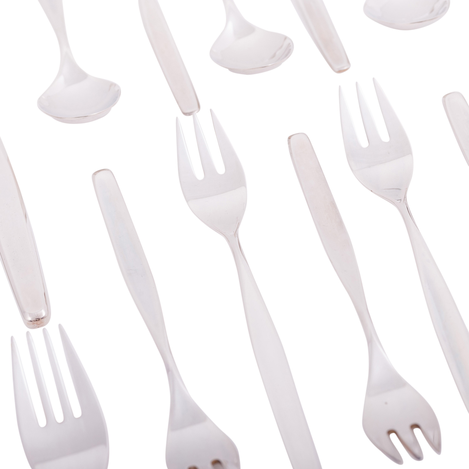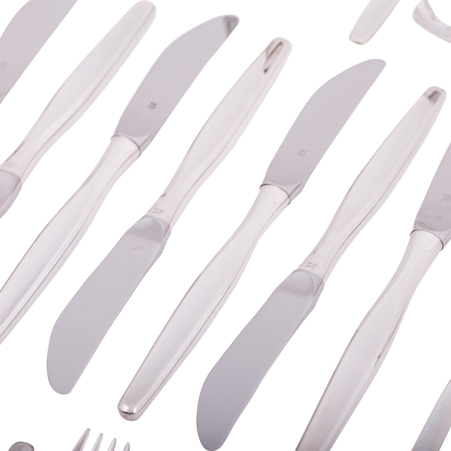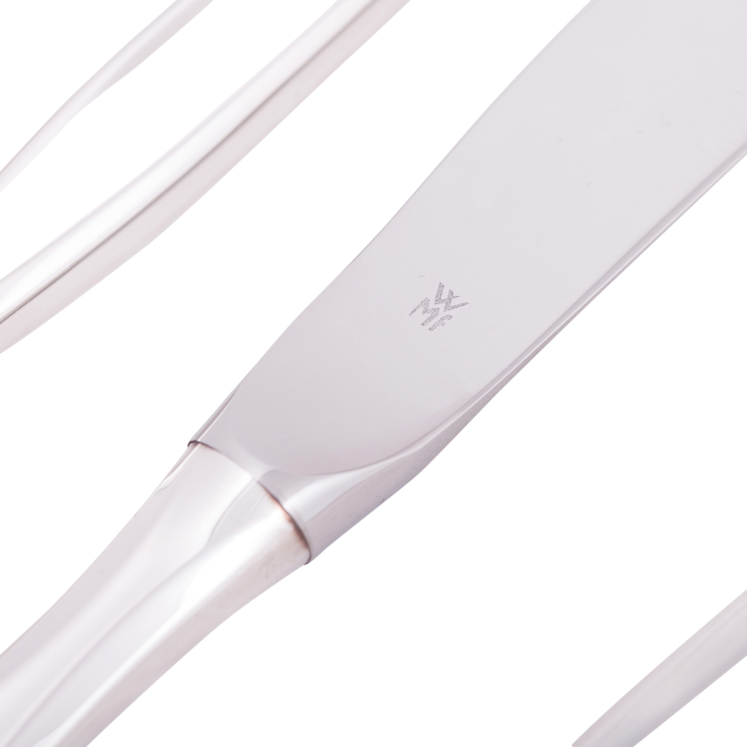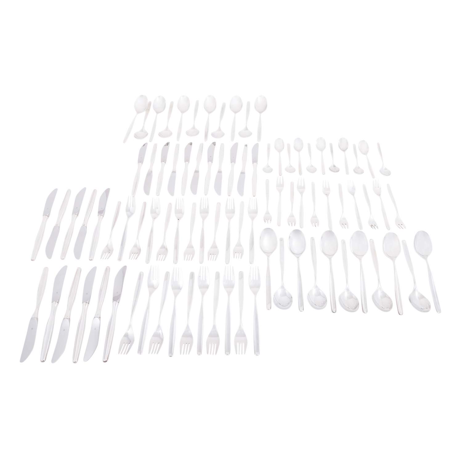 WMF cutlery for mostly 12 people 'Barcelona', 800 silver, 20./21. century, consisting of 13 x appetizer forks / 12 x spoons / 12 x knives, 11 x dinner forks / 12 x spoons / 12 x knives, 12 x coffee spoons, 12 x cake forks, cake server, sugar tongs, meat fork, salad servers 2-piece, pastry knife, 2 x cheese knife, sauce ladle, serving spoon, marked with 800, makers mark, weight (without knife) approx. 3030 g, signs of age and use.