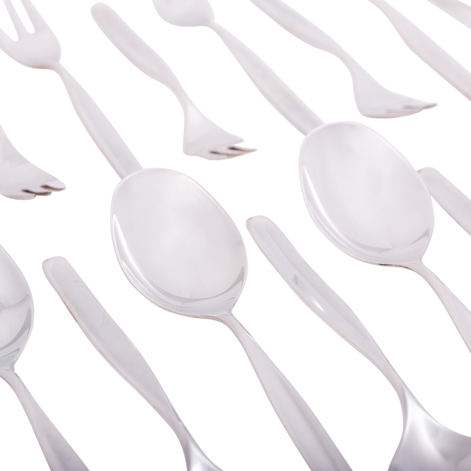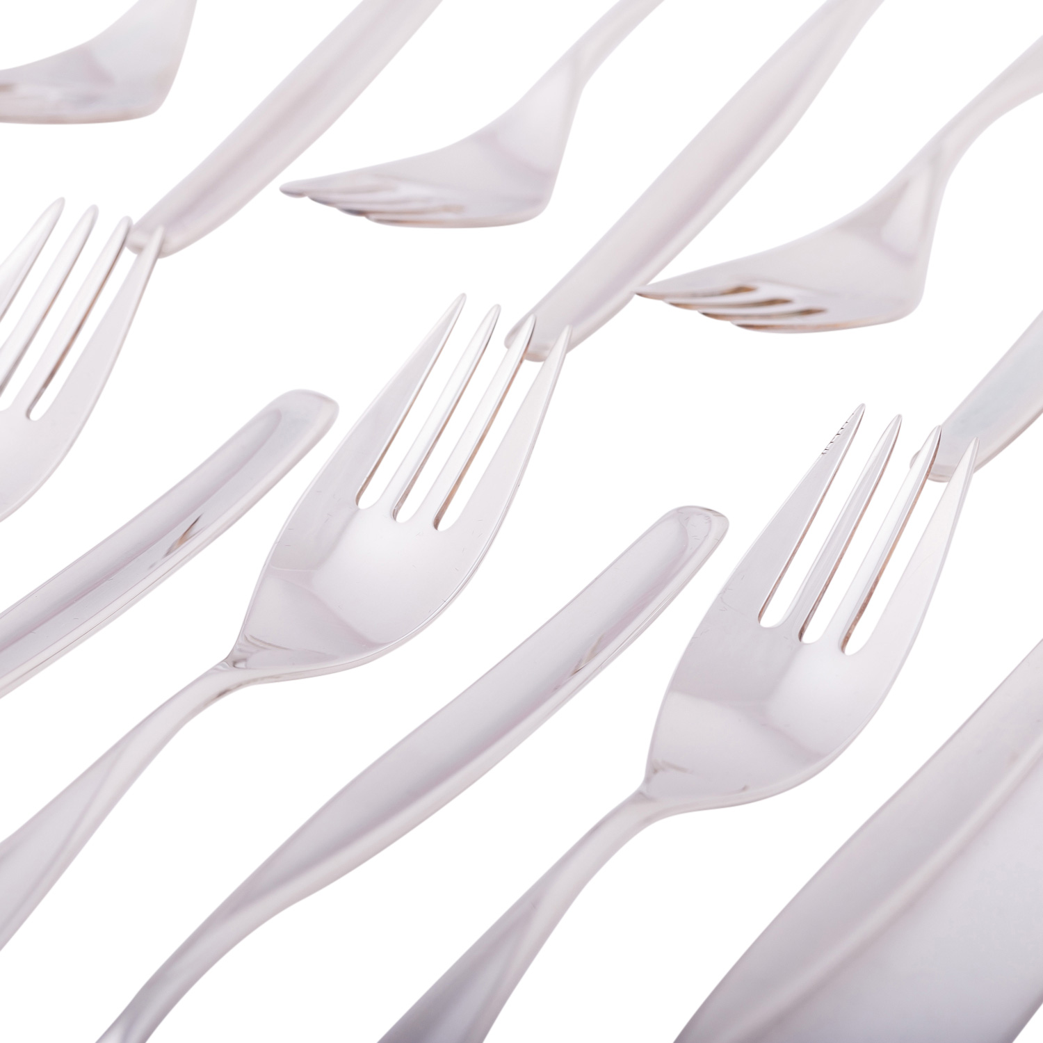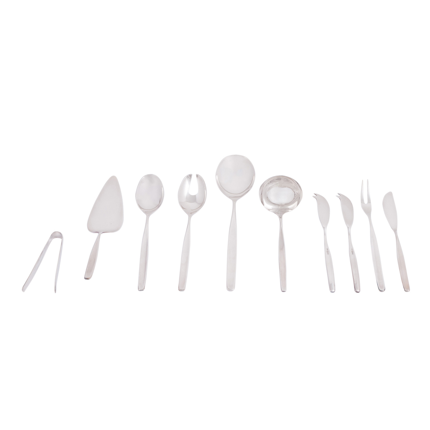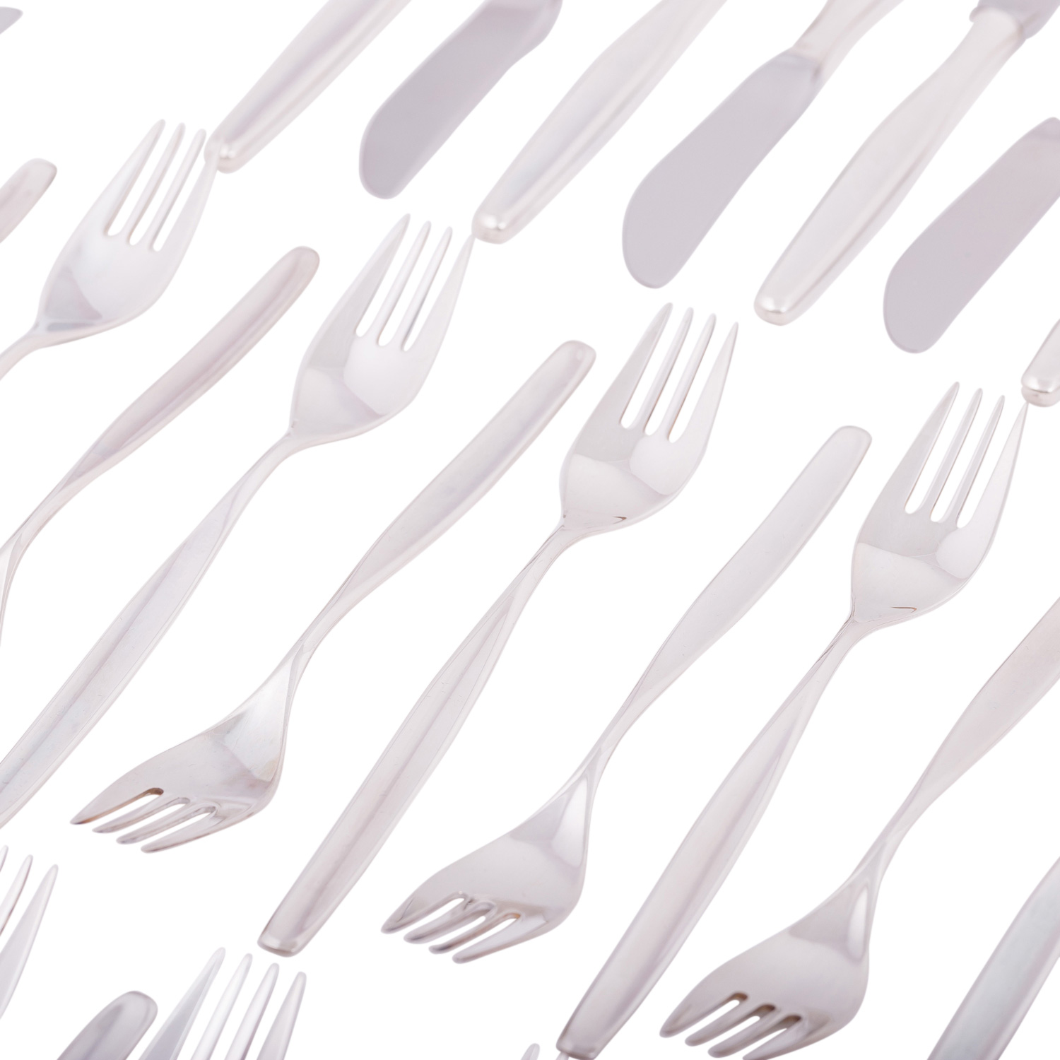 WMF cutlery for mostly 12 people 'Barcelona', 800 silver, 20./21. century, consisting of 13 x appetizer forks / 12 x spoons / 12 x knives, 11 x dinner forks / 12 x spoons / 12 x knives, 12 x coffee spoons, 12 x cake forks, cake server, sugar tongs, meat fork, salad servers 2-piece, pastry knife, 2 x cheese knife, sauce ladle, serving spoon, marked with 800, makers mark, weight (without knife) approx. 3030 g, signs of age and use.